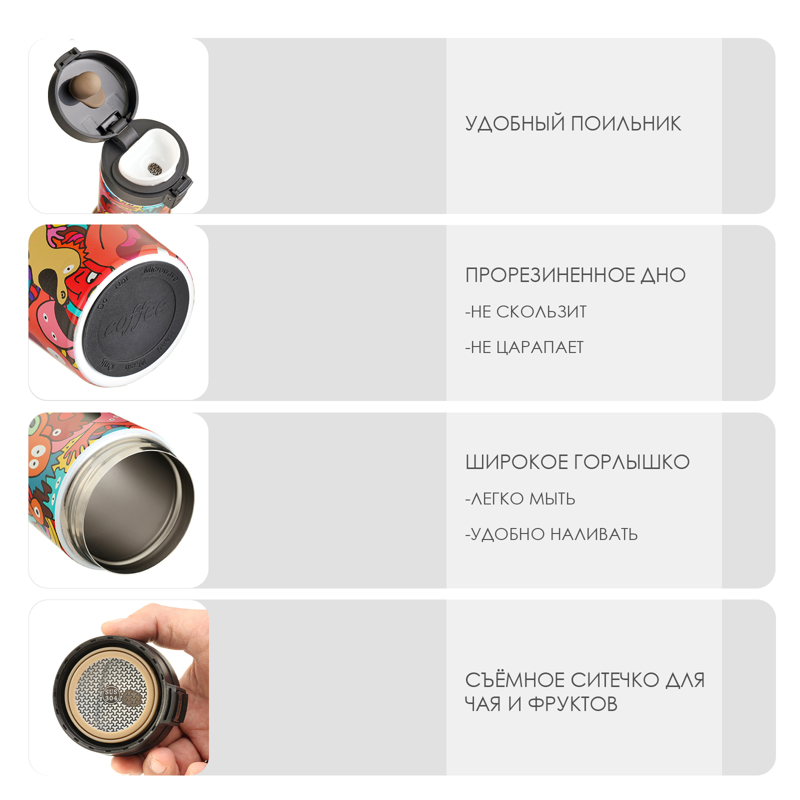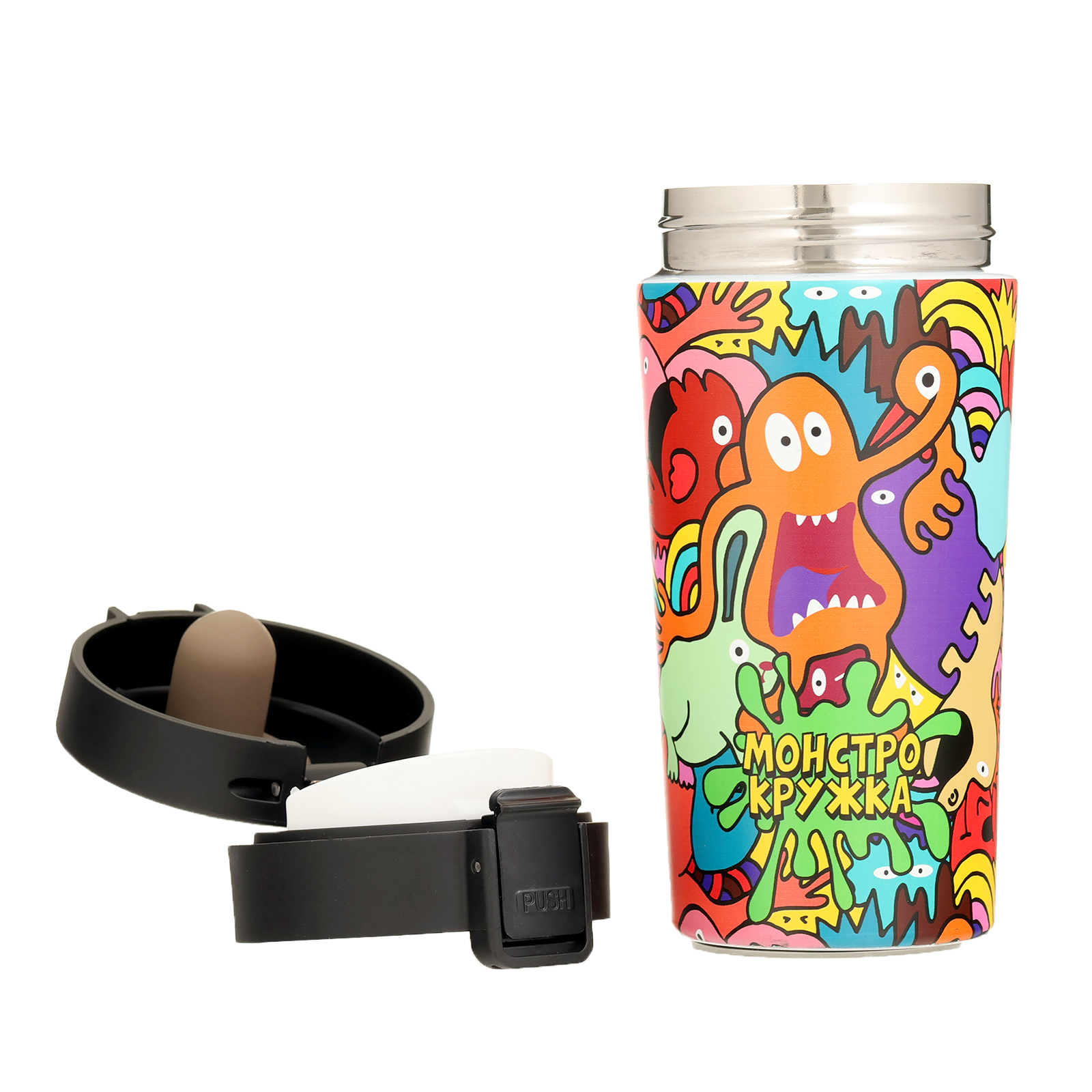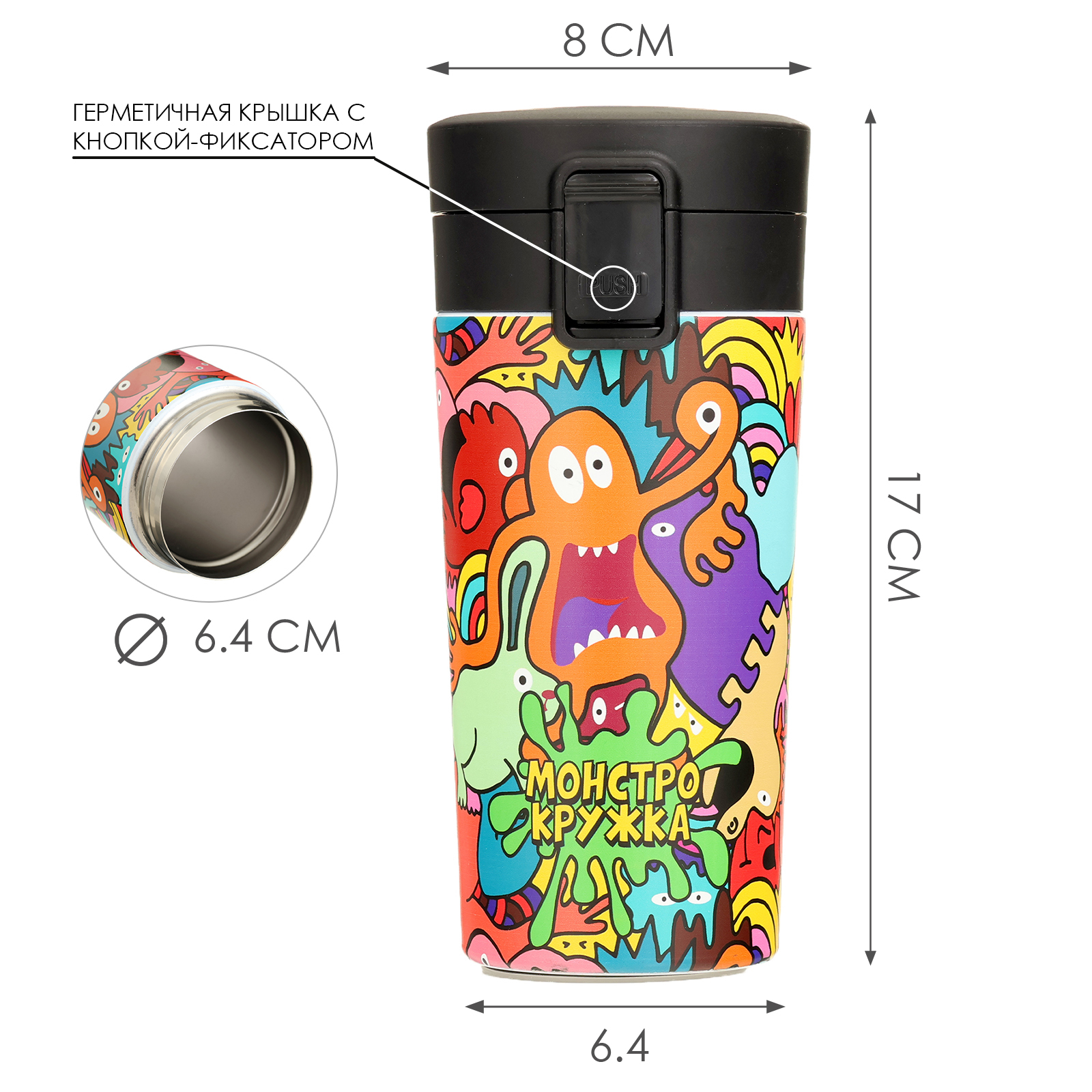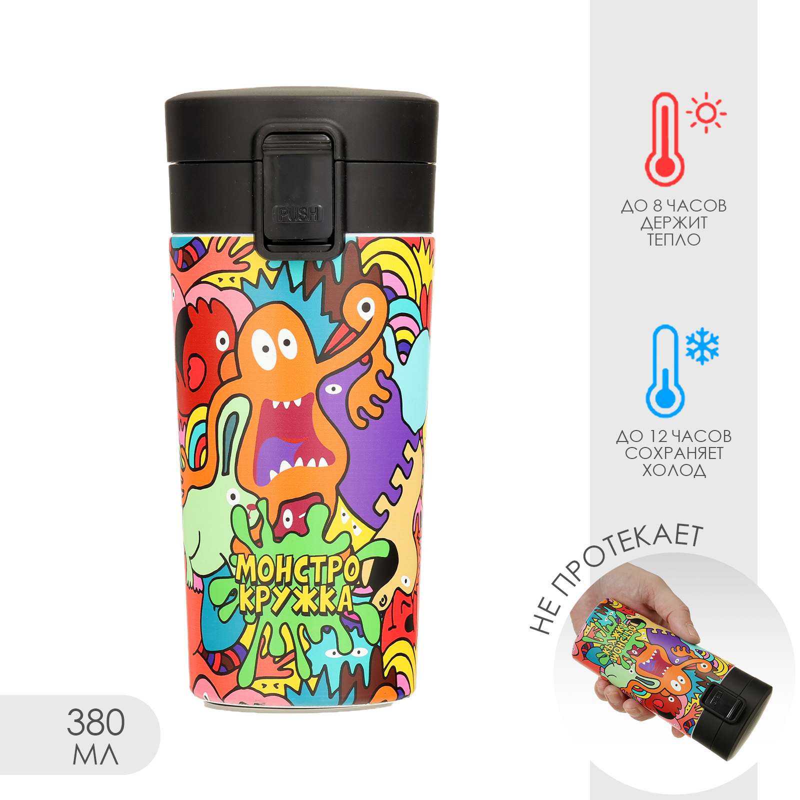 Термокружка, 380 мл, style "монстро кружка", сохраняет тепло до 8 ч. Термокружка является незаменимым атрибутом для всех любителей активного отдыха, её удобно брать с собой в поездку на автомобиле и мини путешествия на природу. Благодаря термокружке напитки остывают медленнее, чем в обычной чашке или картонном стаканчике: сохраняет напитки горячими до 8 часов, а холодными - до 12 часов. Классическая модель термо кружки выполнена из нержавеющей стали, которая не взаимодействует с содержимым и не меняет его состава, запаха или вкуса. Элементы термокружки обладают высокой прочностью, герметичная крышка позволит не беспокоиться о протекании напитков. Благодаря компактным размерам и эргономичному дизайну, она легко помещается в сумку или рюкзак, что делает ее идеальным выбором для путешествий, прогулок, походов и активного образа жизни. Термокружка для кофе и чая идеальна для офиса, автомобиля, длительных прогулок и детям в школу, станет идеальным подарком сестре, брату, другу или подруге на День Рождения, Новый год или любой другой праздник. Цвет: Разноцветный Время сохранения тепла/холода, ч: 8 Объём, мл: 380 tnved: 7323930000 Крышка: Нет Материал: Пластик Особенности: С кнопкой  развернуть описание ▼