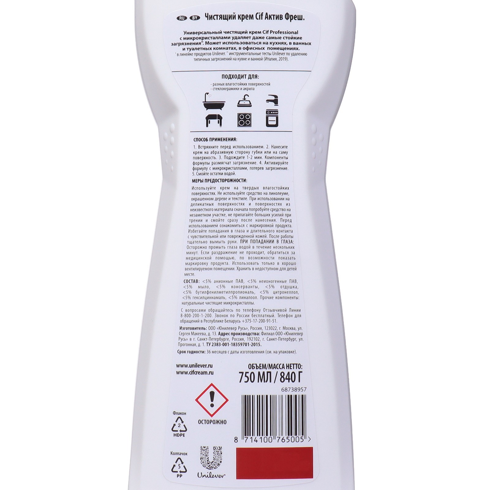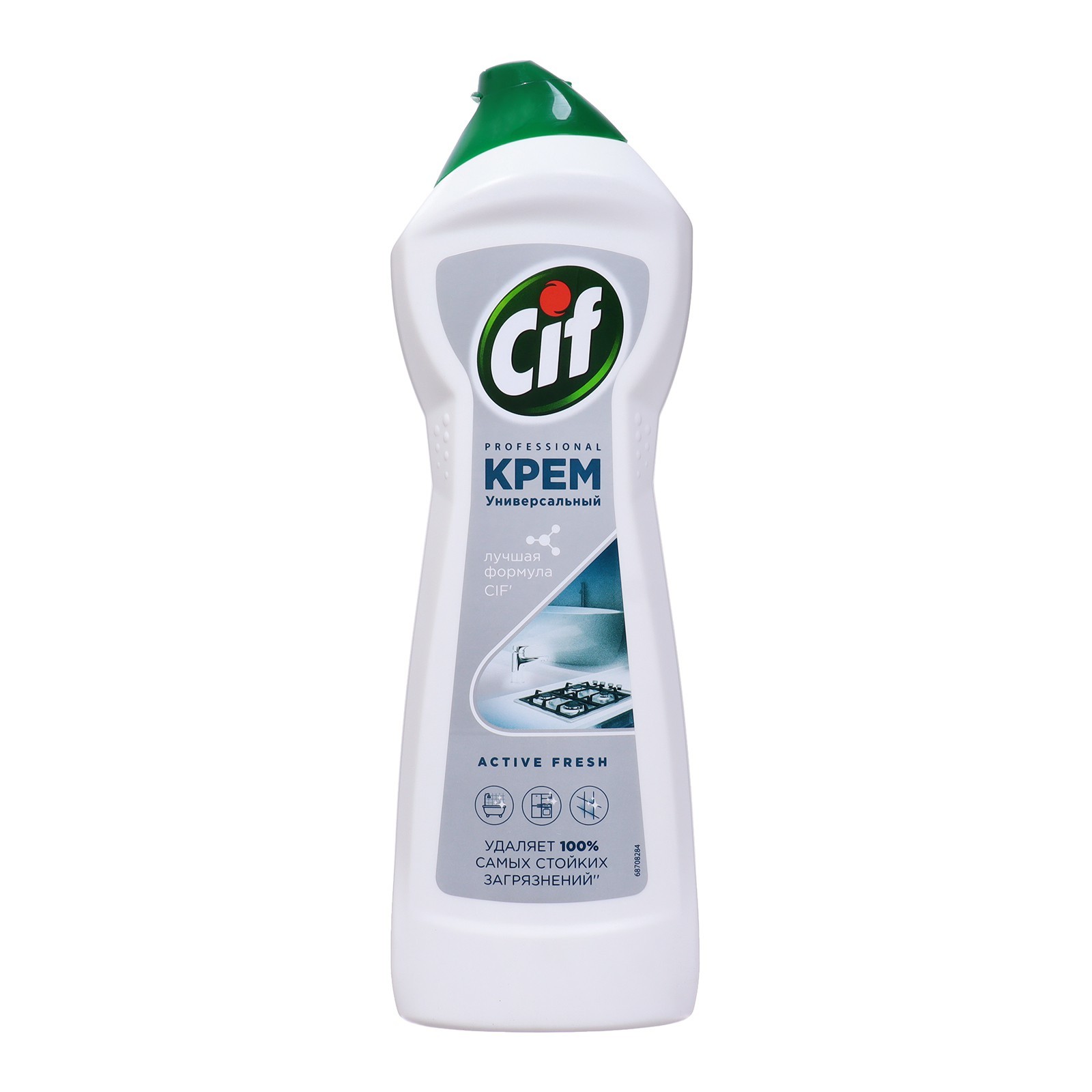 Чистящее средство крем cif professional актив фреш, 750 мл.   Чистящее средство Cif Professional "Актив Фреш" объемом 750 миллилитров - это высокоэффективное средство, разработанное для глубокой очистки различных поверхностей, придавая им свежесть и чистоту.  Основные характеристики: Мощное действие: Cif Professional "Актив Фреш" способствует эффективному удалению жира, грязи, пятен и других загрязнений с различных поверхностей. Свежий аромат: Это средство оставляет после себя приятный и свежий аромат, делая уборку более приятной. Универсальность: Cif Professional подходит для использования на кухонных столешницах, раковинах, плитах, кафеле, стекле и многих других поверхностях. Профессиональное качество: Cif Professional обычно используется в коммерческих и профессиональных уборках благодаря своей эффективности. С Cif Professional "Актив Фреш" вы сможете легко поддерживать чистоту и гигиеничность в вашем доме или рабочем месте, придавая поверхностям свежий и чистый вид.  Вес, г/Объём, мл: 750 Назначение: Универсальное Температурное ограничение: Нет Эффект: Отбеливание Эффект: Дезинфицирующее  развернуть описание ▼