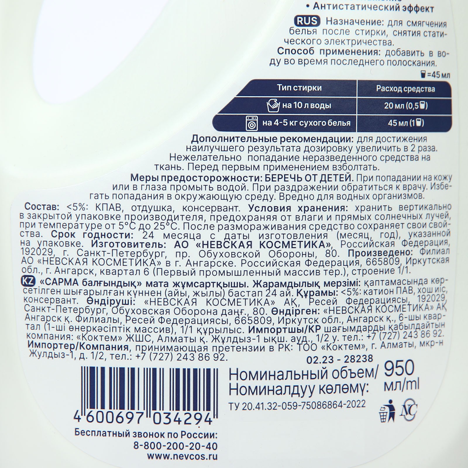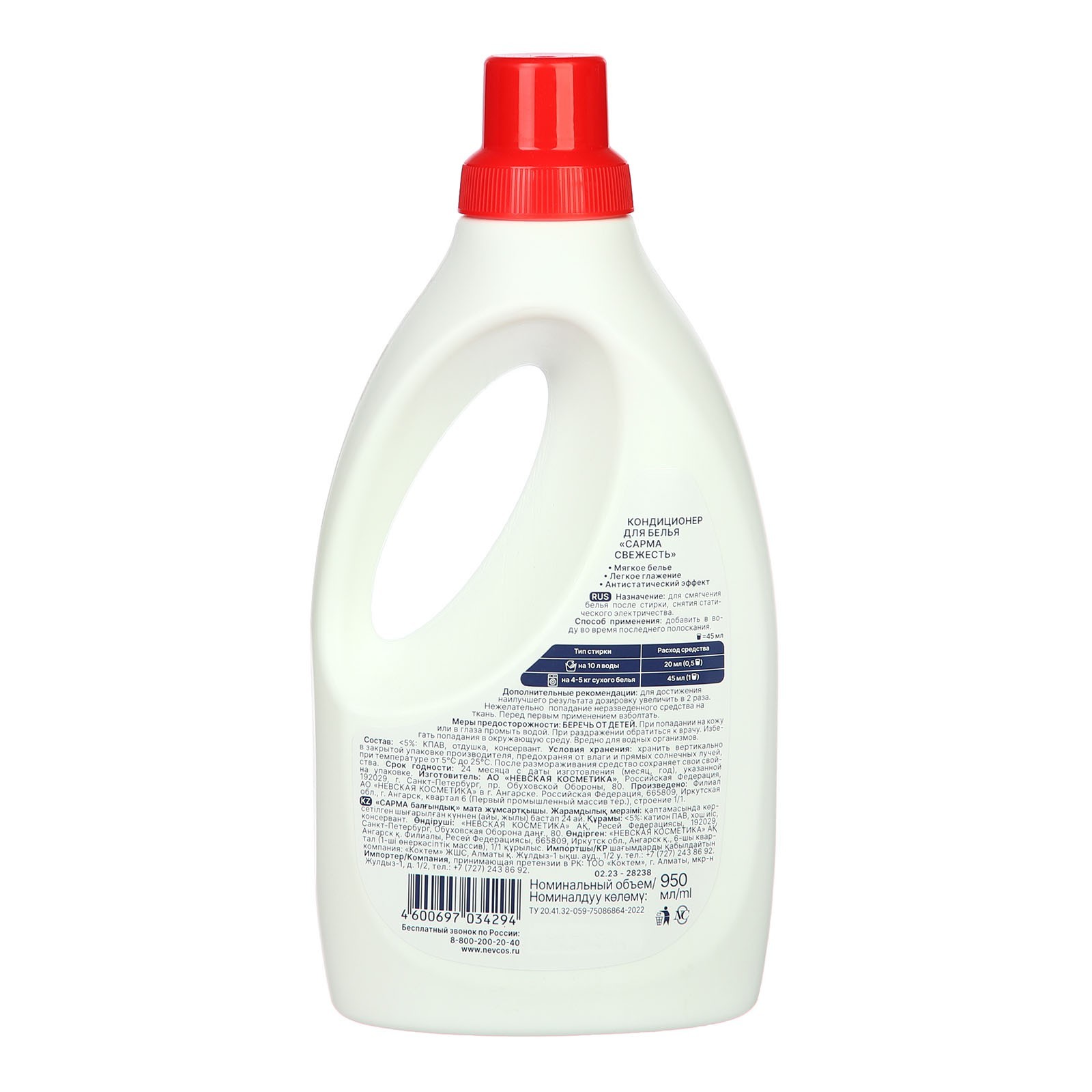 Кондиционер для белья sarma, свежесть, 950 мл. «Sarma Кондиционер для белья Свежесть» - это отличное средство для ухода за вашей одеждой. Оно обладает свежим ароматом, который остается на белье после стирки, делая его мягким и приятным на ощупь. Этот кондиционер идеально подходит для всех видов тканей и может быть использован как при ручной стирке, так и в стиральной машине. «Sarma Свежесть» также обладает антистатическим эффектом, облегчая процесс глажки белья. Покупая «Sarma Кондиционер для белья Свежесть», вы получаете качественное средство для ухода за своими вещами по доступной цене. Объём, л: 0.95 Аромат: Свежесть Назначение: Для всех видов тканей Температурное ограничение: Нет Особенности средства: Концентрат  развернуть описание ▼