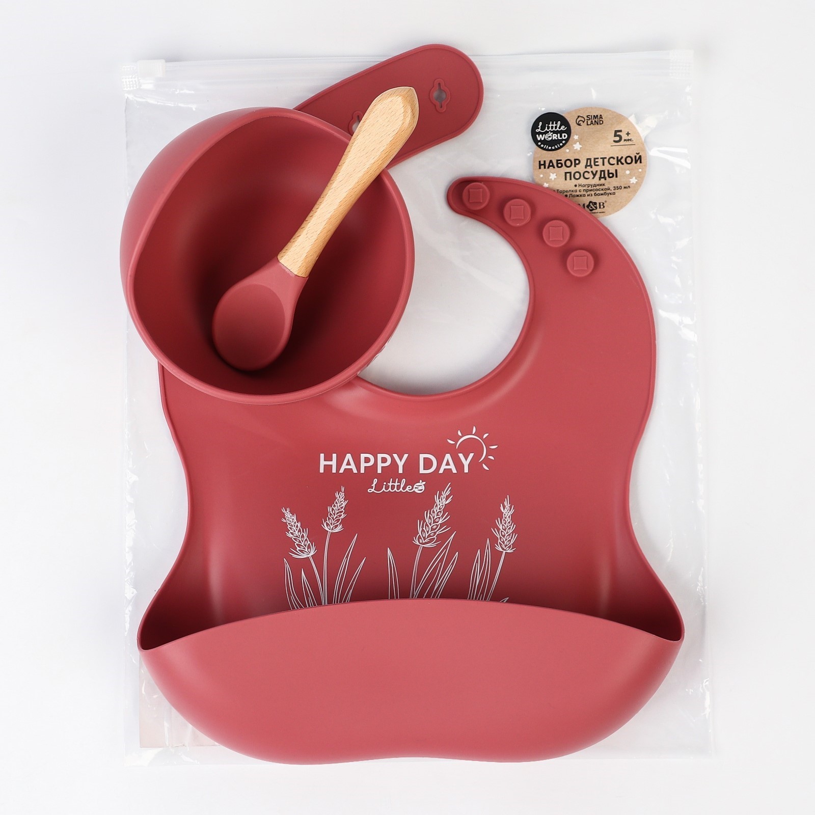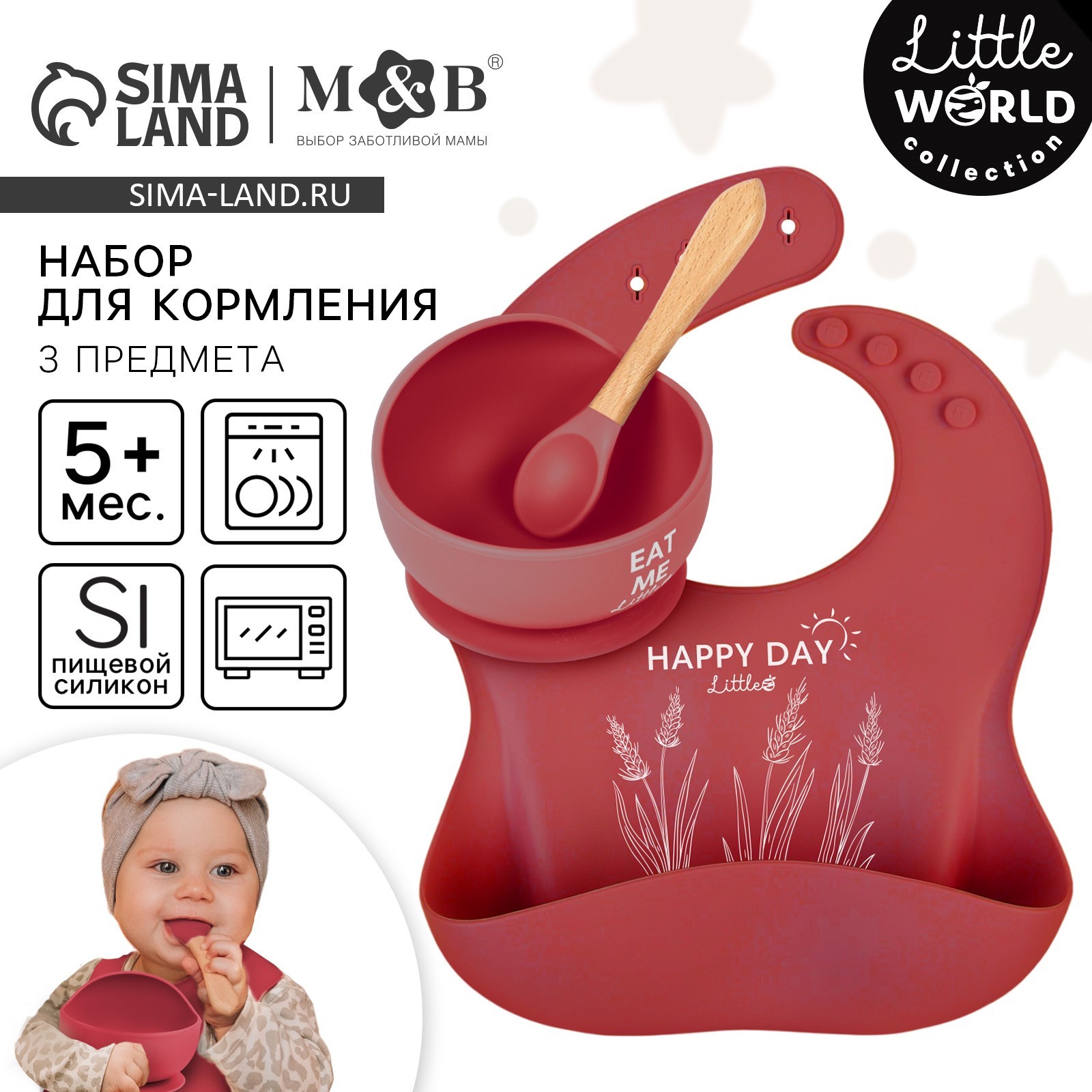 Набор для кормления: нагрудник, тарелка на присоске, ложка, M&b, вишневый