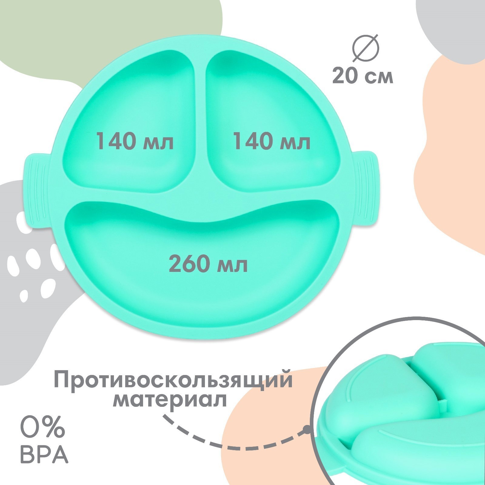 Тарелка детская 3 секции, удобные ручки, крошка я, 22,5х19,5х3, бирюзовый