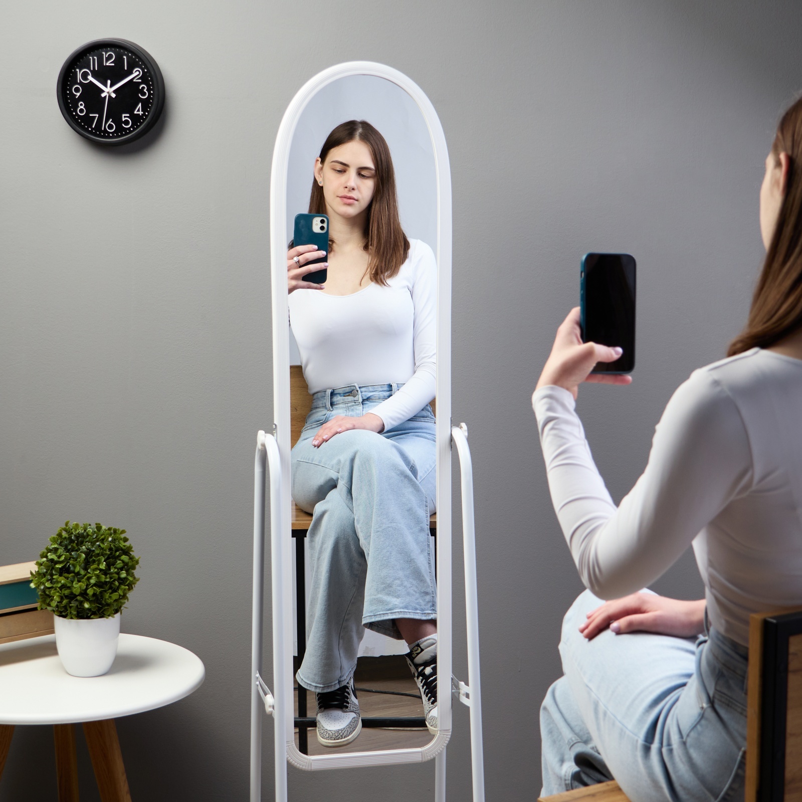Зеркало напольное «клик мебель» basic, на колёсиках, 310 1600 мм, цвет белый. Напольное зеркало "Basic" с колесиками. Установка: Оснащено удобными колесиками для легкости перемещения, подходит для любого пола. Регулировка: Возможность регулировать наклон зеркала, обеспечивая максимальное удобство при использовании. Вид установки: Напольное зеркало идеально для размещения в различных помещениях, добавляя стиль и функциональность. Стиль и дизайн: Обладает современным дизайном, который придает интерьеру шарм и утонченность. Цвет:Белый|Форма:Полуовальная|Длина, мм:310|Высота, мм:1600|Материал корпуса:Металл|Оттенок:Белый|Вид установки:Напольный|Особенность зеркала:На колёсах|Особенность зеркала:Регулировка угла наклона|С полочкой:Да|Цвет рамы:Белый|Материал зеркала:Стекло|Страна:Китай  развернуть описание ▼