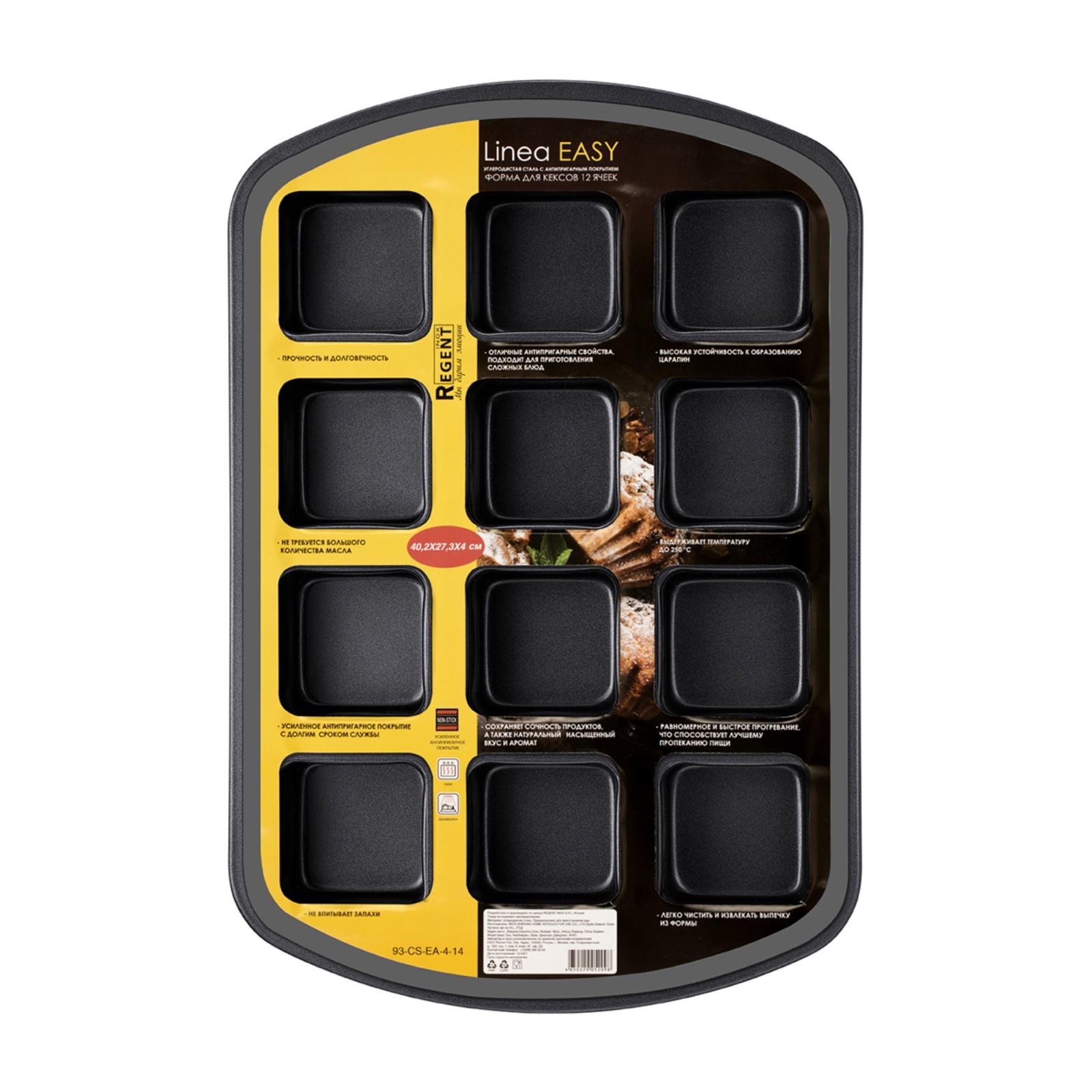 Форма для кексов regent inox easy, 12 ячеек, 40.2х27.3х4 см. Преимущества Прочность и долговечностьРавномерное и быстрое прогревание, что способствует лучшему пропеканию пищине требуется большого количества маслаУсиленное антипригарное покрытие с долгим сроком службы, выдерживает температуру до 250 °ССохраняет сочность продуктов, а также натуральный насыщенный вкус и ароматотличные антипригарные свойства, подходит для приготовления сложных блюдНе впитывает запахиВысокая устойчивость к образованию царапинЛегко чистить и извлекать выпечку из формыИнструкция по эксплуатации и уходу Удалите защитную упаковку и этикетку, вымойте в горячей воде. Разогрейте посуду в течение 30 секунд и равномерно смажьте внутреннюю поверхность растительным маслом. Высушите. Избегайте ударов и падения посуды. Готовить рекомендуется при умеренной температуре до 250 °С, не допускайте перегрева. Не подвергайте посуду термическому шоку – резким перепадам температуры. Для защиты Ваших рук от ожогов, рекомендуется использовать прихватки. Цвет: Чёрный Форма: Трапеция Фасовка, шт.: 1 Количество ячеек: 12 Крышка: Нет Материал: Углеродистая сталь Тип покрытия: Антипригарное Ячейки: Да Тип формы: Для кексов Разъёмная форма: Нет Можно мыть в посудомоечной машине: Да Серия: Easy Серия: Regent inox Easy Форма: Трапеция  развернуть описание ▼