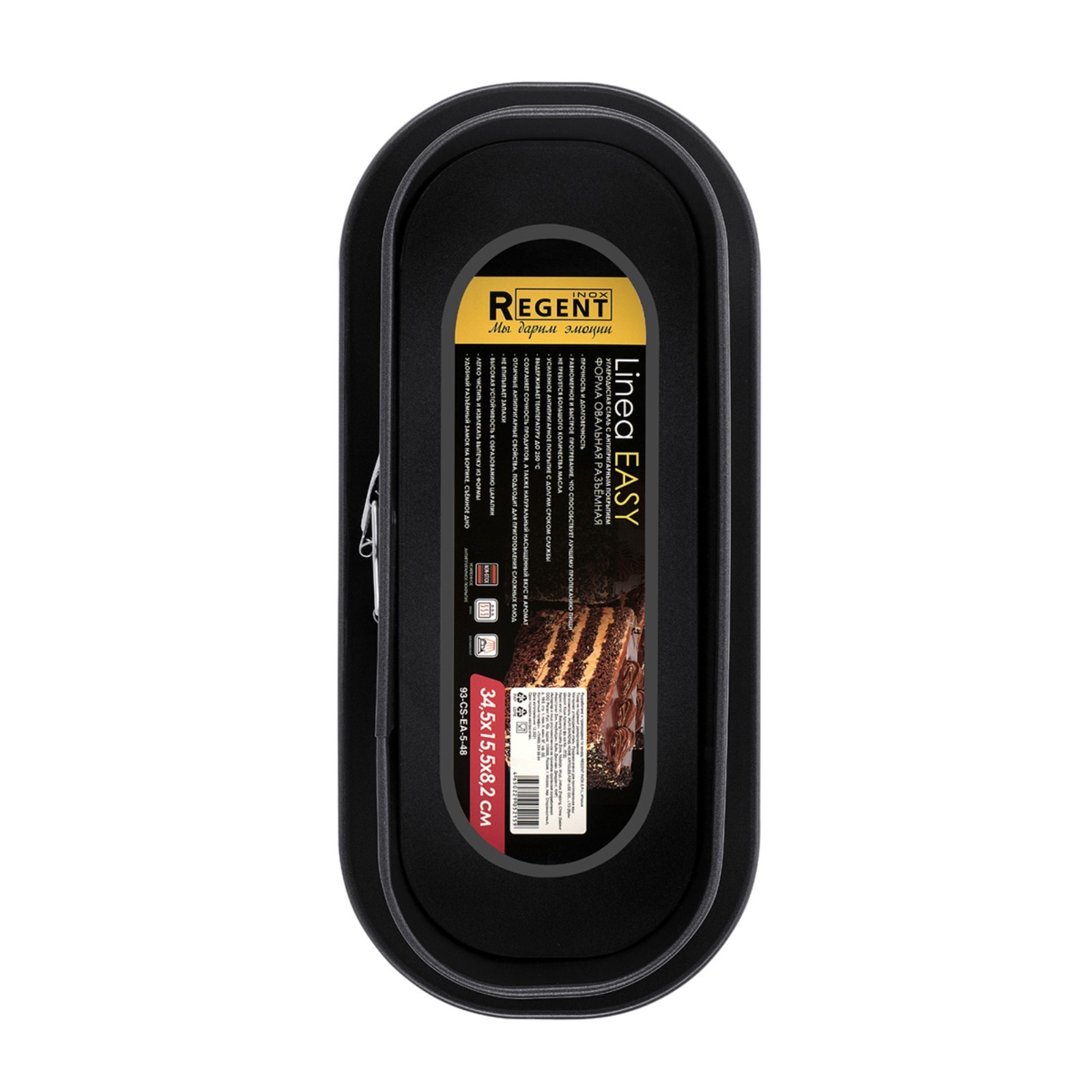 Форма regent inox easy, овальная, разъёмная, для запекания, 34.5х15.5х8.2 см. Форма овальная разъёмная. ПреимуществаПрочность и долговечностьРавномерное и быстрое прогревание, что способствует лучшему пропеканию пищиНе требуется большого количества маслаУсиленное антипригарное покрытие с долгим сроком службыВыдерживает температуру до 250 °ССохраняет сочность продуктов, а также натуральный насыщенный вкус и ароматОтличные антипригарные свойства, подходит для приготовления сложных блюдНе впитывает запахиВысокая устойчивость к образованию царапинЛегко чистить и извлекать выпечку из формыУдобный разъёмный замок на бортике, съёмное дноИнструкция по эксплуатации и уходуУдалите защитную упаковку и этикетку, вымойте в горячей воде. Разогрейте посуду в течение 30 секунд и равномерно смажьте внутреннюю поверхность растительным маслом. Высушите. Избегайте ударов и падения посуды. Готовить рекомендуется при умеренной температуре до 250 °С, не допускайте перегрева. Не подвергайте посуду термическому шоку – резким перепадам температуры. Цвет: Чёрный Форма: Овальная Фасовка, шт.: 1 tnved: 7323990000 Крышка: Нет Материал: Углеродистая сталь Тип покрытия: Антипригарное Ячейки: Нет Тип формы: Для приготовления вторых блюд Разъёмная форма: Да Можно мыть в посудомоечной машине: Да Серия: Easy Серия: Regent inox Easy Форма: Овал  развернуть описание ▼