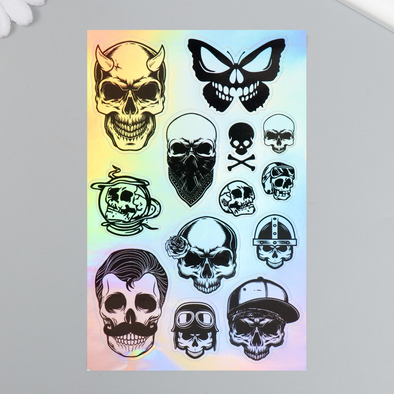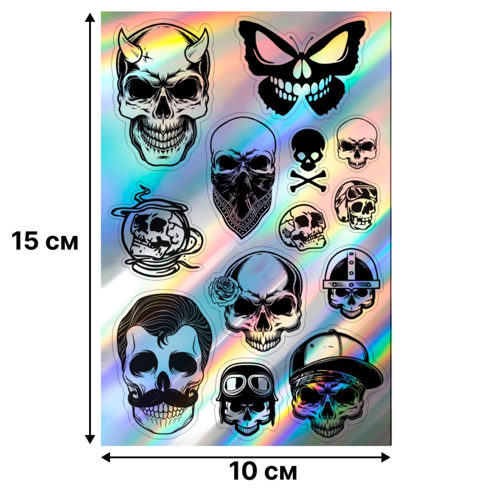 Голографические наклейки (стикеры) "черепа" 10х15 см, 5-209. Размер, см: 10 х 15 parts count: 0 Тематика: Черепа, скелеты Тематика: Мужская Материал: ПВХ Вид наклейки: Голографическая Вид наклейки: Стикер Температурное ограничение: Нет  развернуть описание ▼