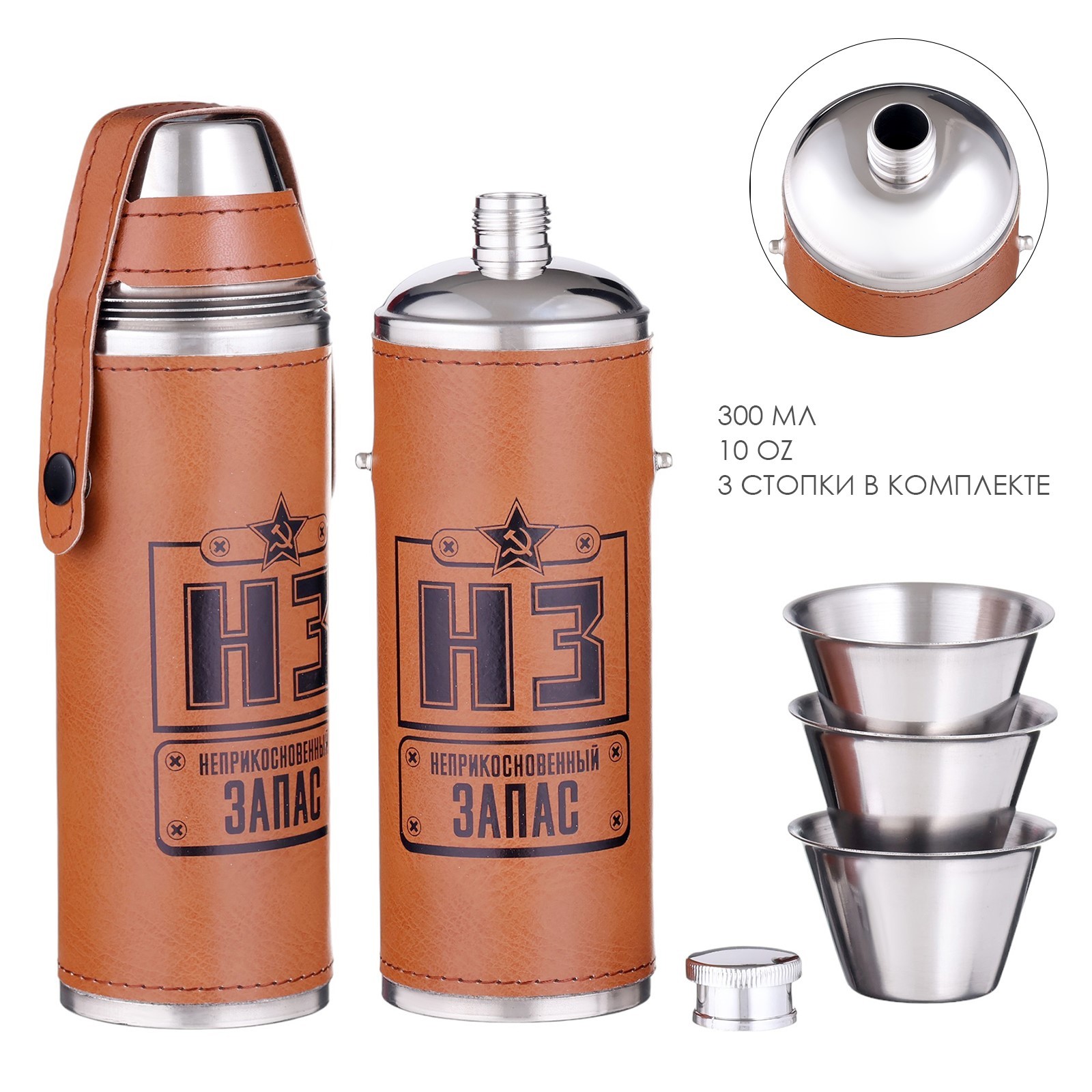 Фляжка для алкоголя "запас", нержавеющая сталь, чехол, 300 мл, 3 стопки по 30 мл