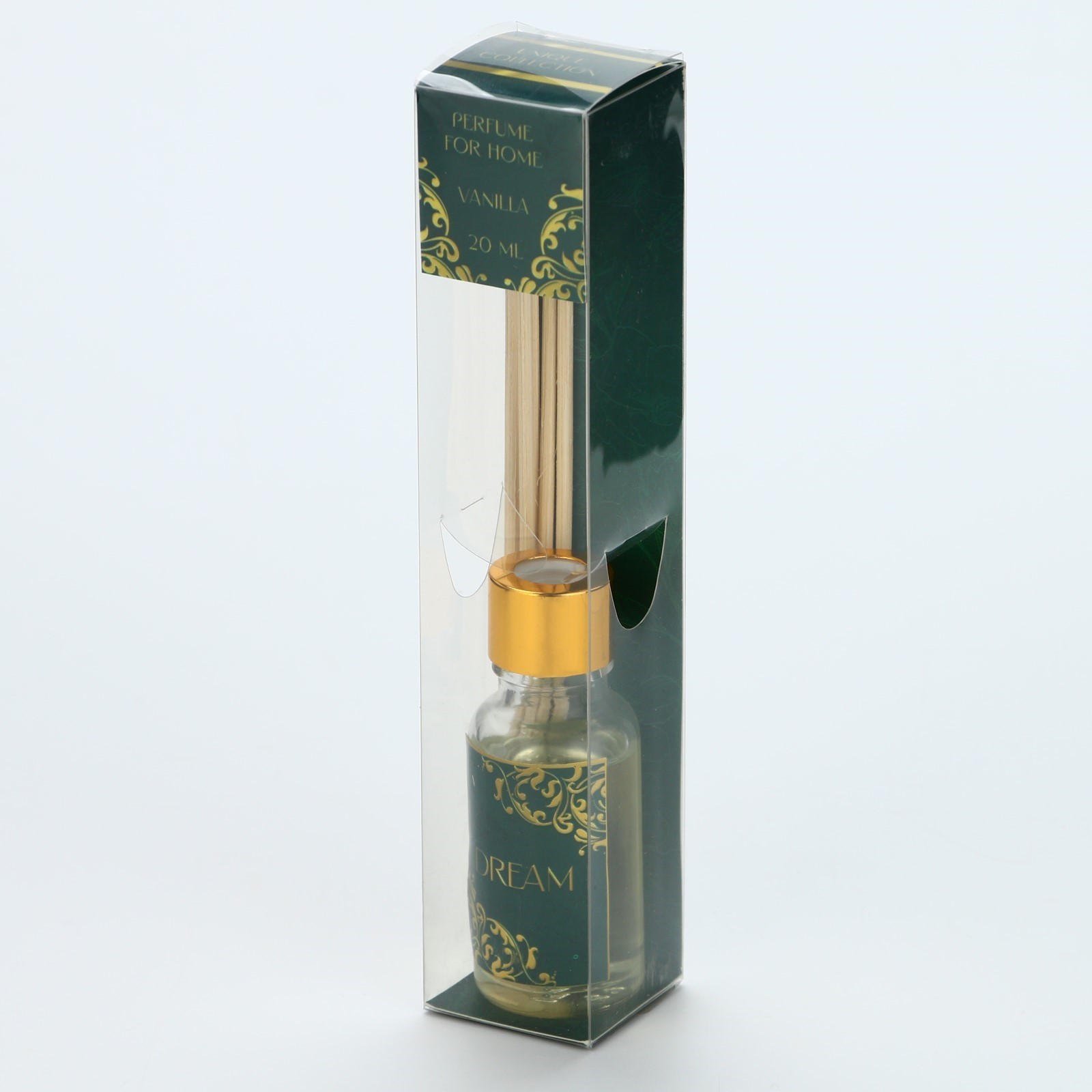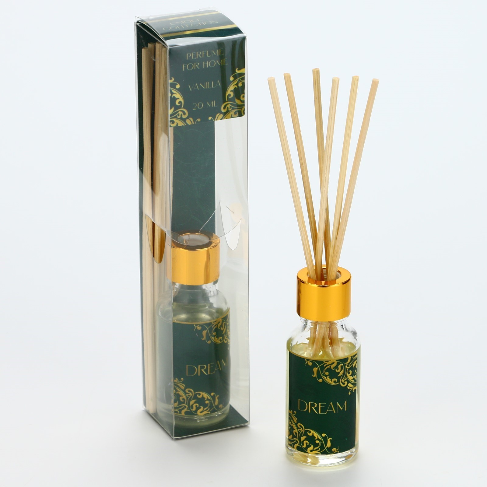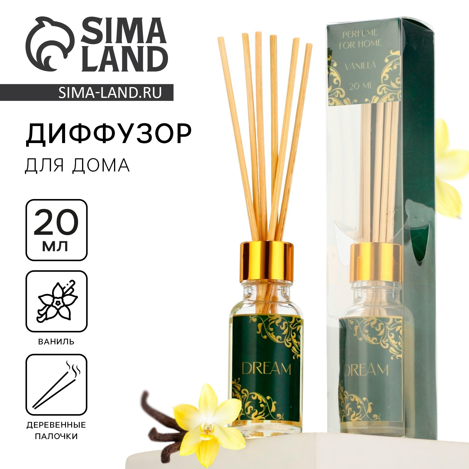 Диффузор ароматический «dream», аромат ваниль, 20 мл.. Ароматический диффузор «Dream» от торговой марки SEE YOU HOME - это изысканное дополнение к вашему интерьеру. Аромадиффузор с 20 мл нежного ванильного аромата наполнят ваш дом уютом и создадут атмосферу релаксации. Диффузор представлен в стильной стеклянной бутылочке с золотистой крышкой и бамбуковыми палочками, которые впитывают аромат и распространяют его по всей комнате. В комплекте идут 6 палочек. Упаковка диффузора выполнена в элегантном дизайне с золотистыми элементами, что делает его привлекательным подарком. Аромат «Dream»- это идеальный выбор для тех, кто ценит комфорт и уют в своем доме. ПрименениеИзвлеките диффузор из упаковки, откройте крышку и защитный колпачок, опустите палочки в ароматизированную жидкость и наслаждайтесь. Ароматизированная жидкость пропитывает палочки, и с их помощью аромат распространяется по всему помещению. Объём, мл: 20 Вид ароматизатора: В бутылочке Аромат: Ваниль  развернуть описание ▼