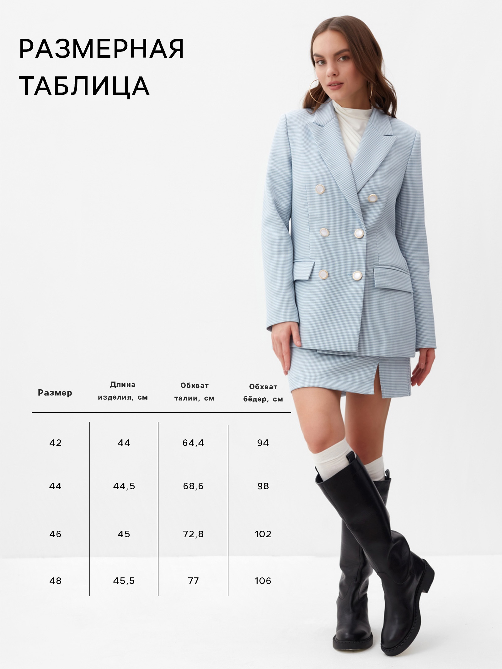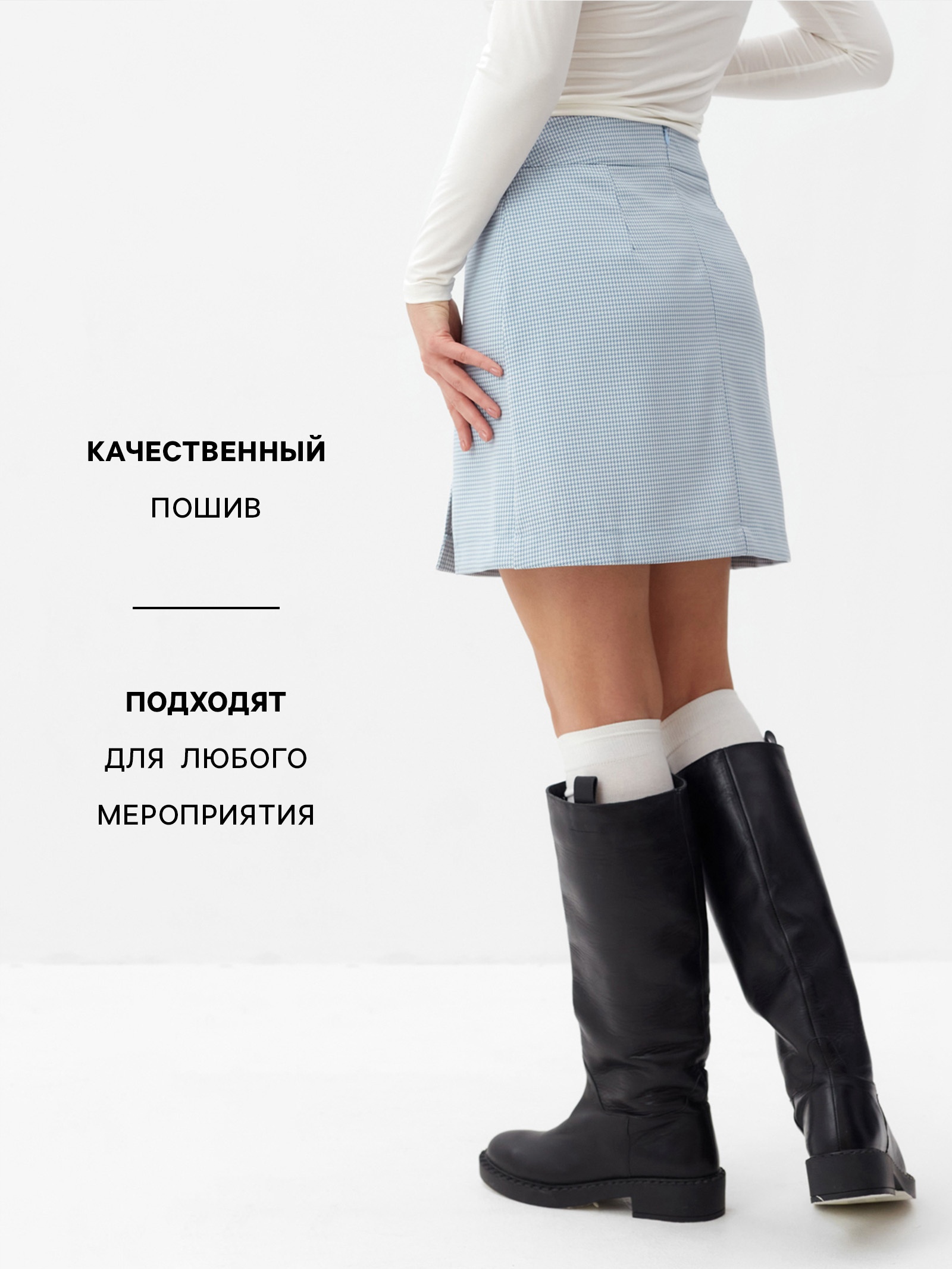 Юбка с разрезом мини женская mist, размер 48, голубая, белая. Цвет:Белый|Цвет:Голубой|Для кого:Для женщины|Назначение:Офис|Назначение:Повседневная|Назначение:Школа|Ткань:Костюмная ткань|Размер:48|Рост, см:165 - 170|Рост модели на фото, см:175|Сезон:Всесезонный|Вид застёжки:Молния|Тематика:Однотонная|Декоративные элементы:Разрез|Тип карманов:Без карманов|Рекомендации по уходу:Стирка при 30 °С|Рекомендации по уходу:Бережный режим глажки|Рекомендации по уходу:Не отбеливать|Тип посадки:Высокая|Состав ткани:Полиэстер|Длина юбки:Мини|Вид юбки:Прямая|Параметры модели на фото (ОГ-ОТ-ОБ):83-60-93|Страна:Россия  развернуть описание ▼