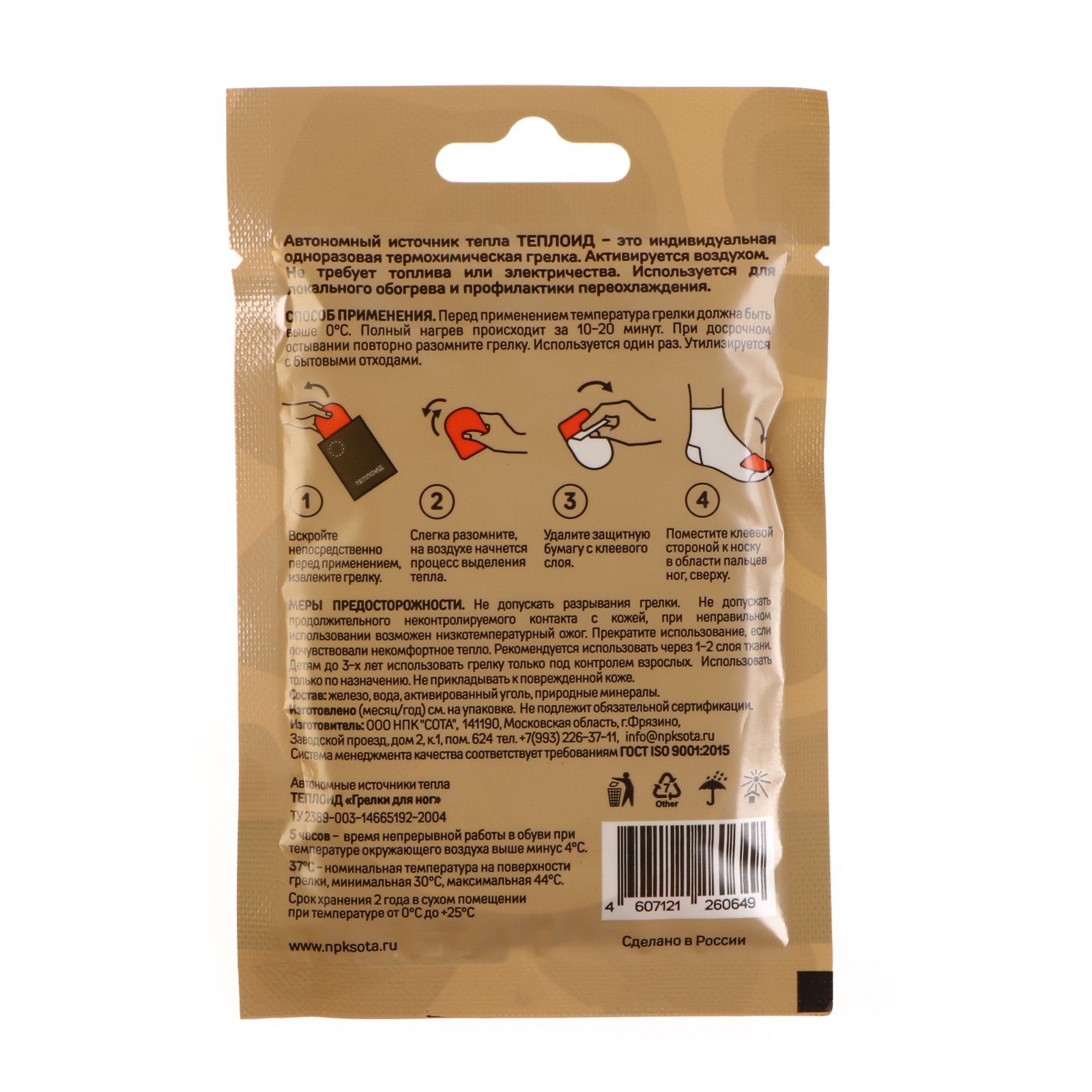 Грелка автономная "теплоид" для ног - 2 шт, 5 часов. Автономный источник тепла "Теплоид" - это одноразовая грелка, которая не нуждается в электричестве или топливе, генерируя тепло автономно. Теплоид представляет собой небольшой пакетик из нетканного полимерного воздухопроницаемого материала. Пакетик наполнен тепловыделяющей смесью, состоящей из натуральных компонентов: порошок железа, вода, активированный уголь, природные минералы. Тепло выделяется в результате ускоренного окисления кислородом железа, когда пакетик, будучи извлечен из упаковки, окажется на воздухе. Время работы варьируется от 3 до 10 часов (см. на упаковке). Средняя температура нагревания составляет минимум 50° С, максимум 60° С. Инструкция по применению: Вскрыть пакет непосредственно перед использованием. Извлечь и слегка встряхнуть грелку, на воздухе грелка станет тёплой. Положить грелку во внутренний карман одежды (полный нагрев происходит за 10-20 минут). При остывании раньше срока повторно встряхнуть грелку. Используется один раз. Утилизируется с бытовыми отходами. Предостережения: Не вскрывать наружный пакет до применения по назначению. Не использовать во время сна. При непосредственном контакте с кожей в течение длительного времени возможен низкотемпературный ожог. Рекомендуется использовать через 1-2 слоя ткани. Не допускать разрывания грелки. Детям до 3-х лет использовать грелку только под контролем взрослых. Состав: порошок железа, вода, активированный уголь, природные минералы Температурное ограничение: Нет  развернуть описание ▼
