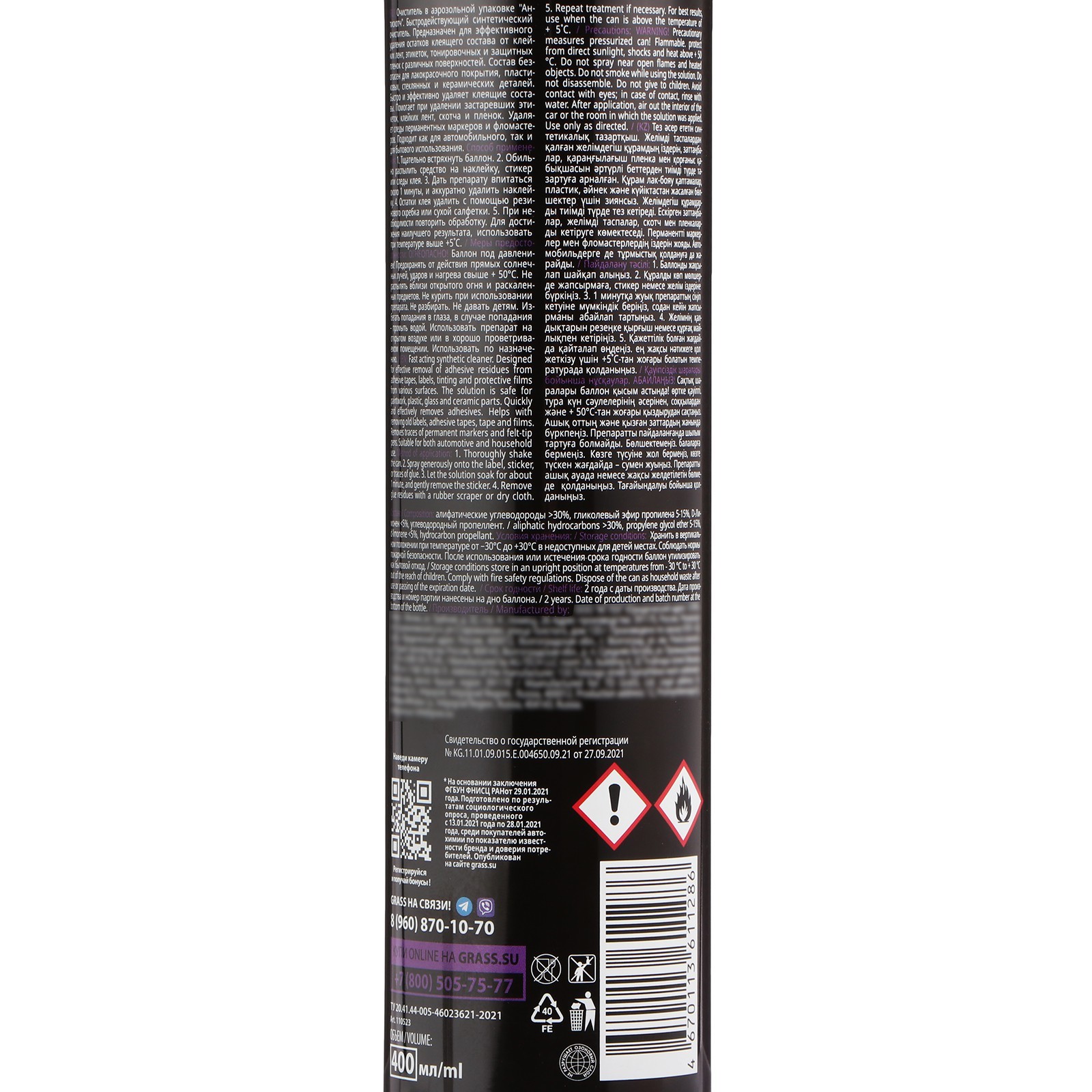 Быстродействующий синтетический очиститель. Предназначен для эффективного удаления остатков клеящего состава от клейких лент, этикеток, тонировочных и защитных пленок с различных поверхностей. Состав безопасен для лакокрасочного покрытия, пластиковых, стеклянных и керамических деталей. Быстро и эффективно удаляет клеящие составы. Помогает при удалении застаревших этикеток, клейких лент, скотча и пленок. Удаляет следы перманентных маркеров и фломастеров. Подходит как для автомобильного, так и для бытового использования. Способ применения:1. Тщательно встряхнуть баллон. 2. Обильно распылить средство на наклейку, стикер или следы клея. 3. Дать препарату впитаться около 1 минуты, и аккуратно удалить наклейку. 4. Остатки клея удалить с помощью резинового скребка или сухой салфетки. 5. При необходимости повторить обработку. Для достижения наилучшего результата, использовать при температуре выше +5C.