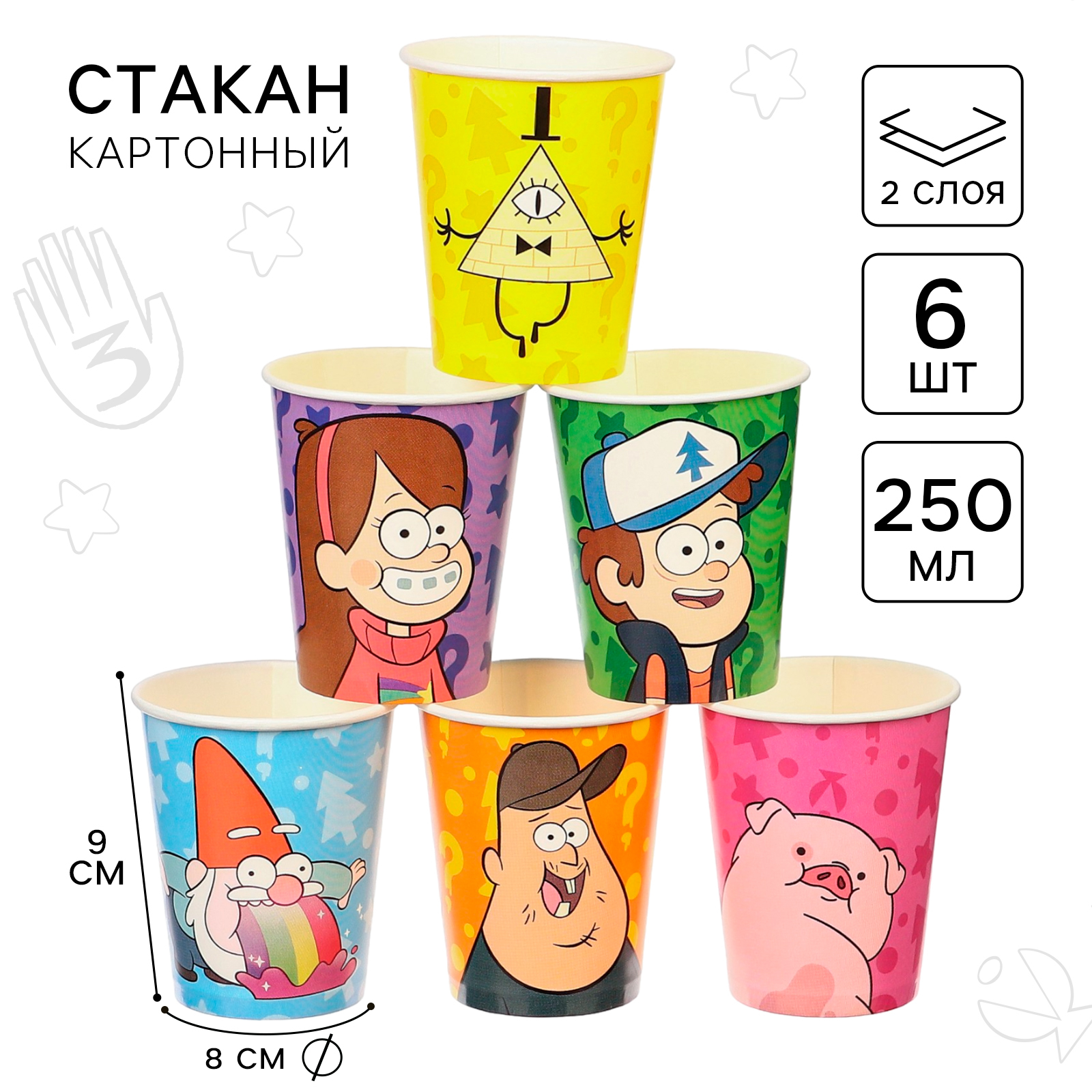 Стакан бумажный "с днем рождения!", 250 мл, 6 штук, гравити фолз