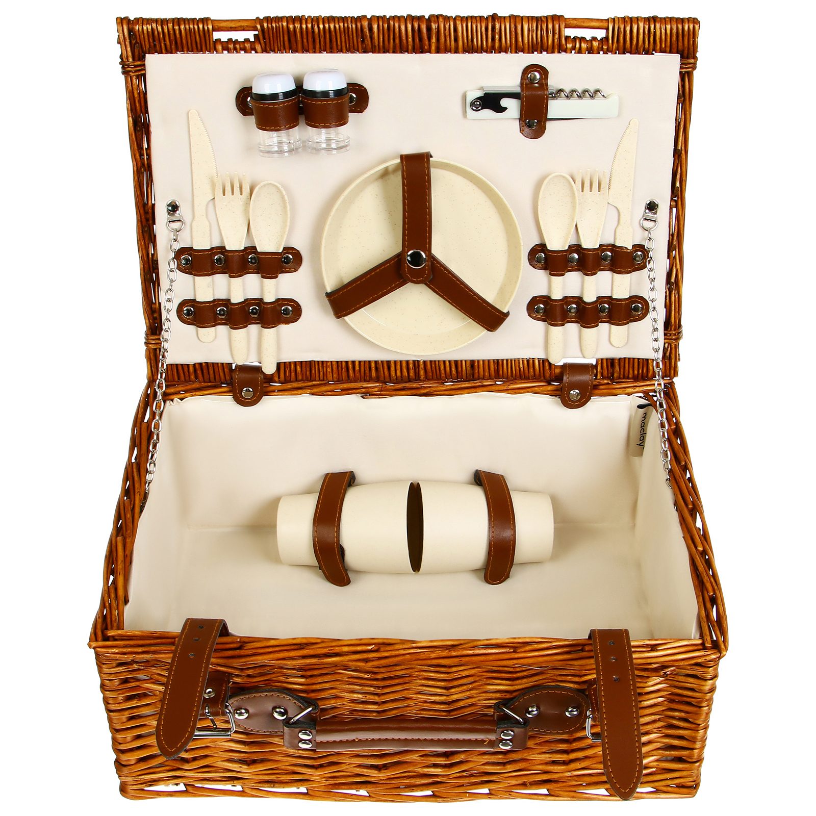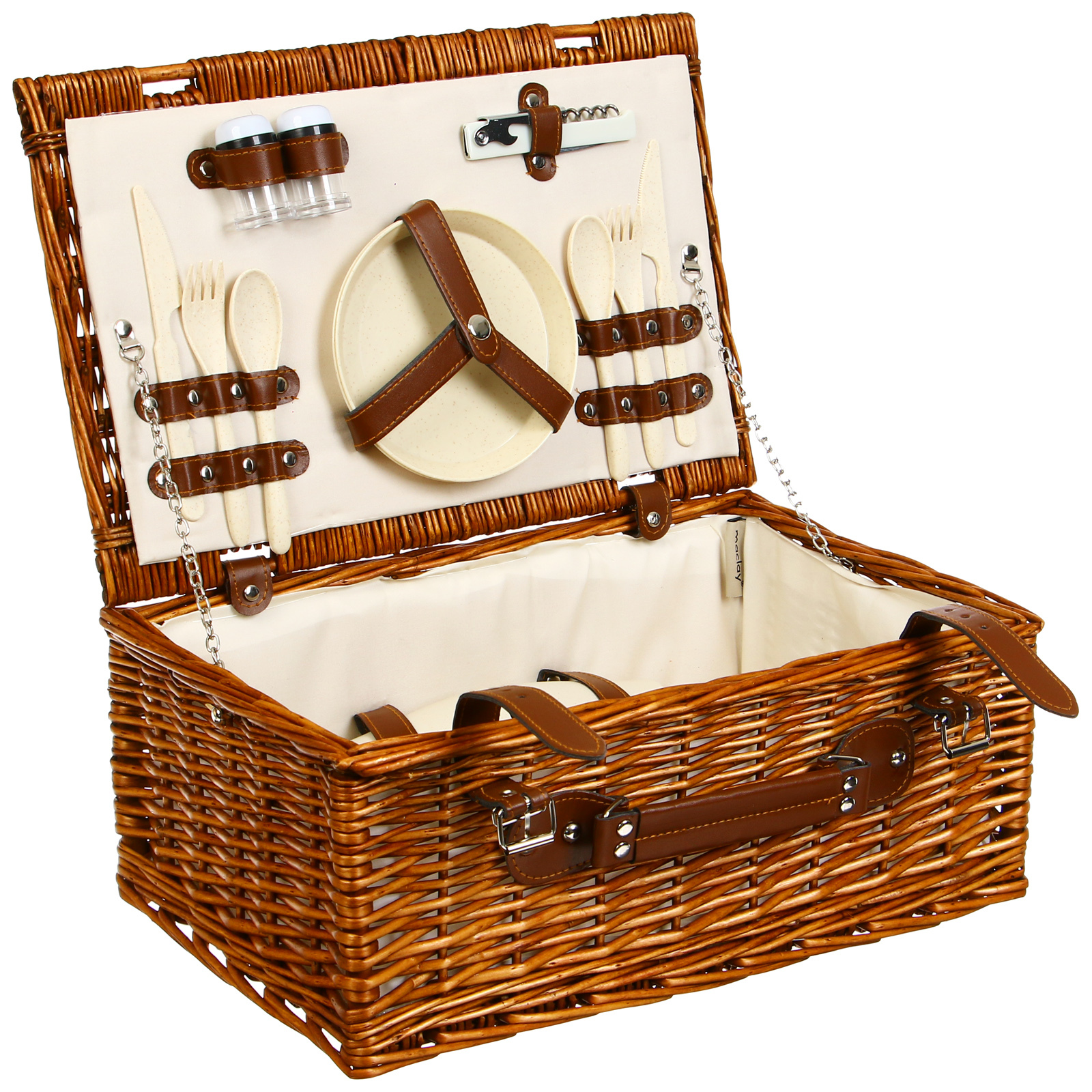 Корзина для пикника maclay на 2 персоны. Корзина для пикника с посудой — компактный и функциональный набор для отдыха на природе. Изделие плотно фиксируется специальными ремешками. Корзина выполнена из натуральной лозы и имеет древесную текстуру. Особенности Внешняя часть из натуральной лозы. Комплектация рассчитана на две персоны. Универсальный набор многоразовой посуды: ножи, вилки, ложки, тарелки, стаканы, солонки и штопор. Посуда и приборы сделаны из лёгких материалов, что обеспечивает небольшой вес набора. Комплектация Корзина. Вилка, 2 шт. Ложка, 2 шт. Нож, 2 шт. Тарелка, 2 шт. Стакан, 2 шт. Солонка, 2 шт. Штопор. Параметры Размер корзины: 41 × 27 × 18 см. Внешний материал корзины: натуральная лоза. Внутренний материал корзины: 40 % хлопок, 60 % полиэстер. Материал посуды: полипропилен, пшеничная солома. Объём стакана: 350 мл. Диаметр тарелки: 15 см.