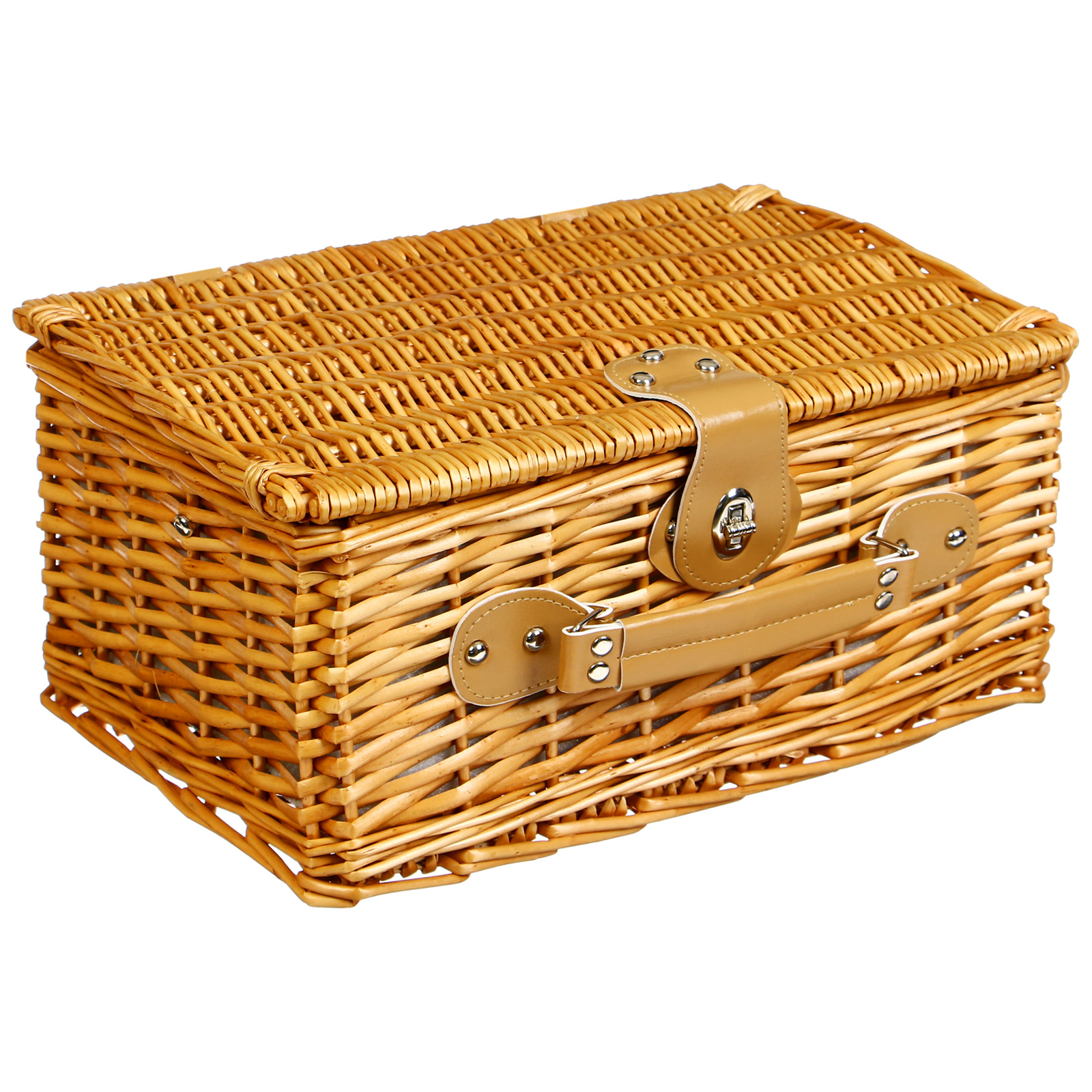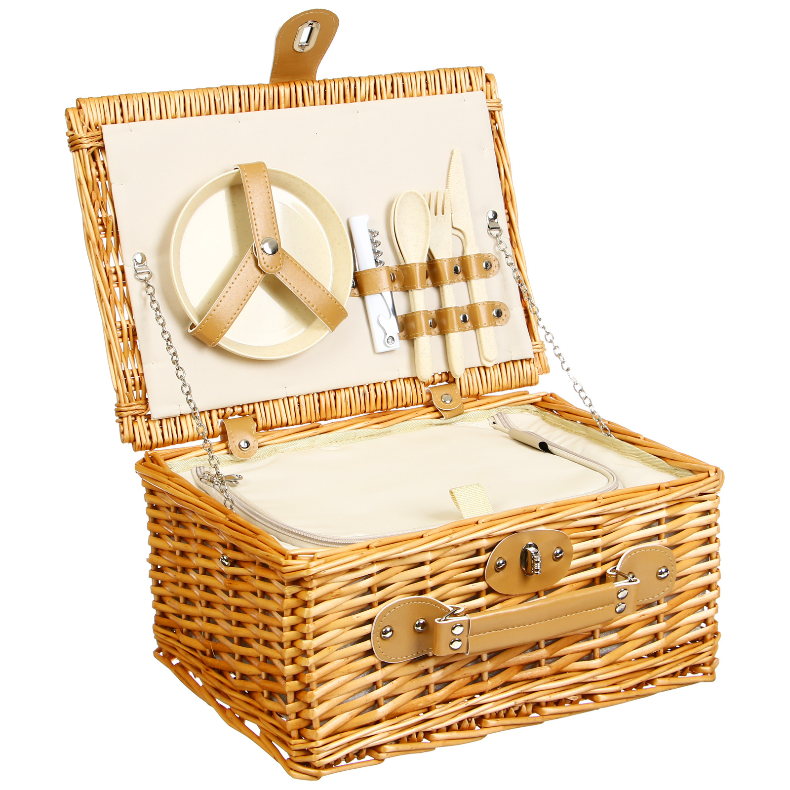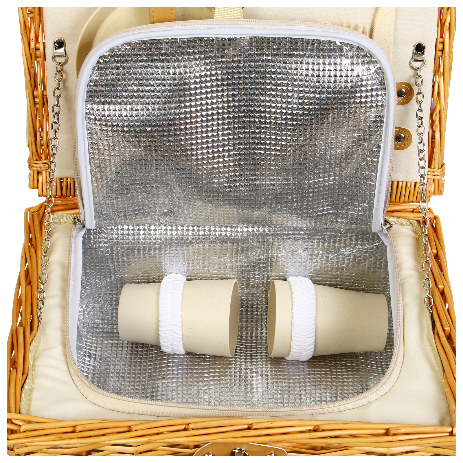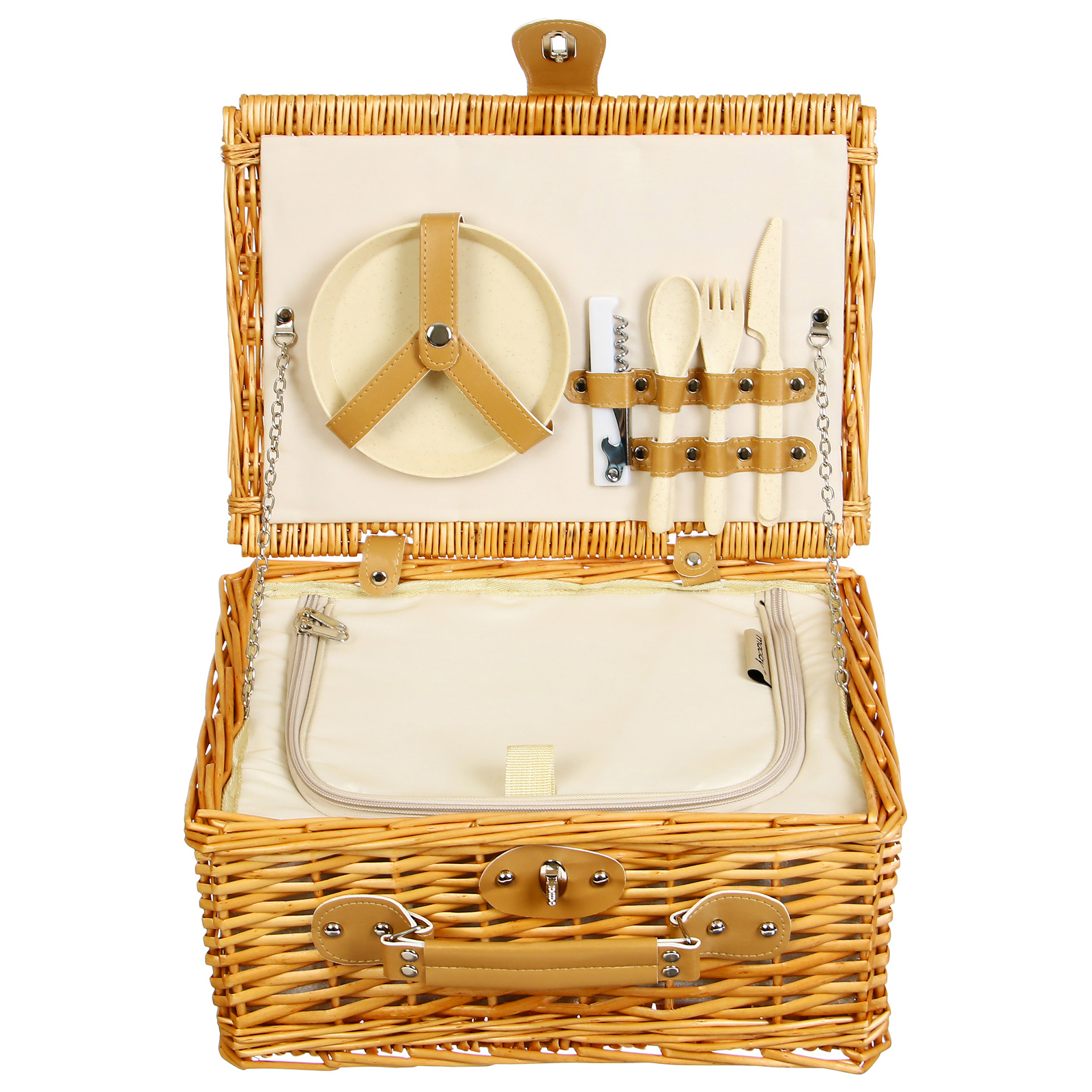 Корзина-холодильник для пикника maclay на 2 персоны. Корзина-холодильник для пикника с посудой — компактный и функциональный набор для отдыха на природе. Изделие плотно фиксируется специальными ремешками, есть встроенная термосумка для продуктов. Корзина выполнена из натуральной лозы и имеет древесную текстуру. Особенности Внешняя часть из натуральной лозы. Комплектация рассчитана на две персоны. Универсальный набор многоразовой посуды: ножи, вилки, ложки, тарелки, стаканы, штопор и салфетка. Посуда и приборы сделаны из лёгких материалов, что обеспечивает небольшой вес набора. Комплектация Корзина-холодильник. Вилка, 2 шт. Ложка, 2 шт. Нож, 2 шт. Тарелка, 2 шт. Стакан, 2 шт. Штопор, Салфетка. Параметры Размер корзины: 38 × 27 × 20 см. Внешний материал корзины: натуральная лоза. Внутренний материал корзины: 40 % хлопок, 60 % полиэстер. Материал посуды: полипропилен, пшеничная солома. Объём стакана: 350 мл. Диаметр тарелки: 15 см.