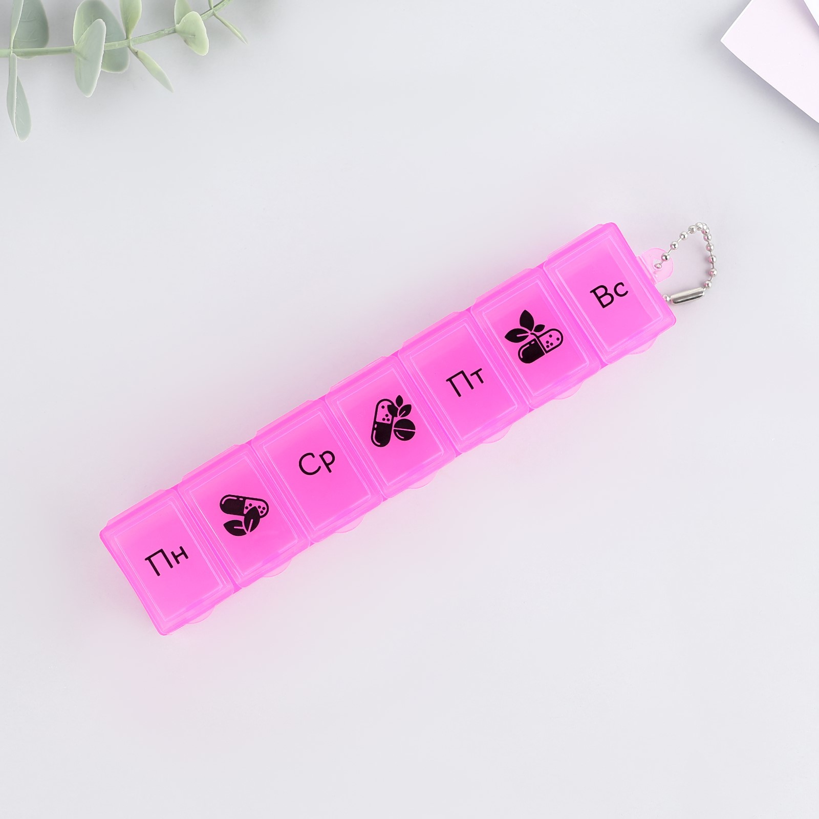 Таблетница на неделю с цепочкой, 7 секций, розовая, русские буквы, 15 х 3 х 2 см.