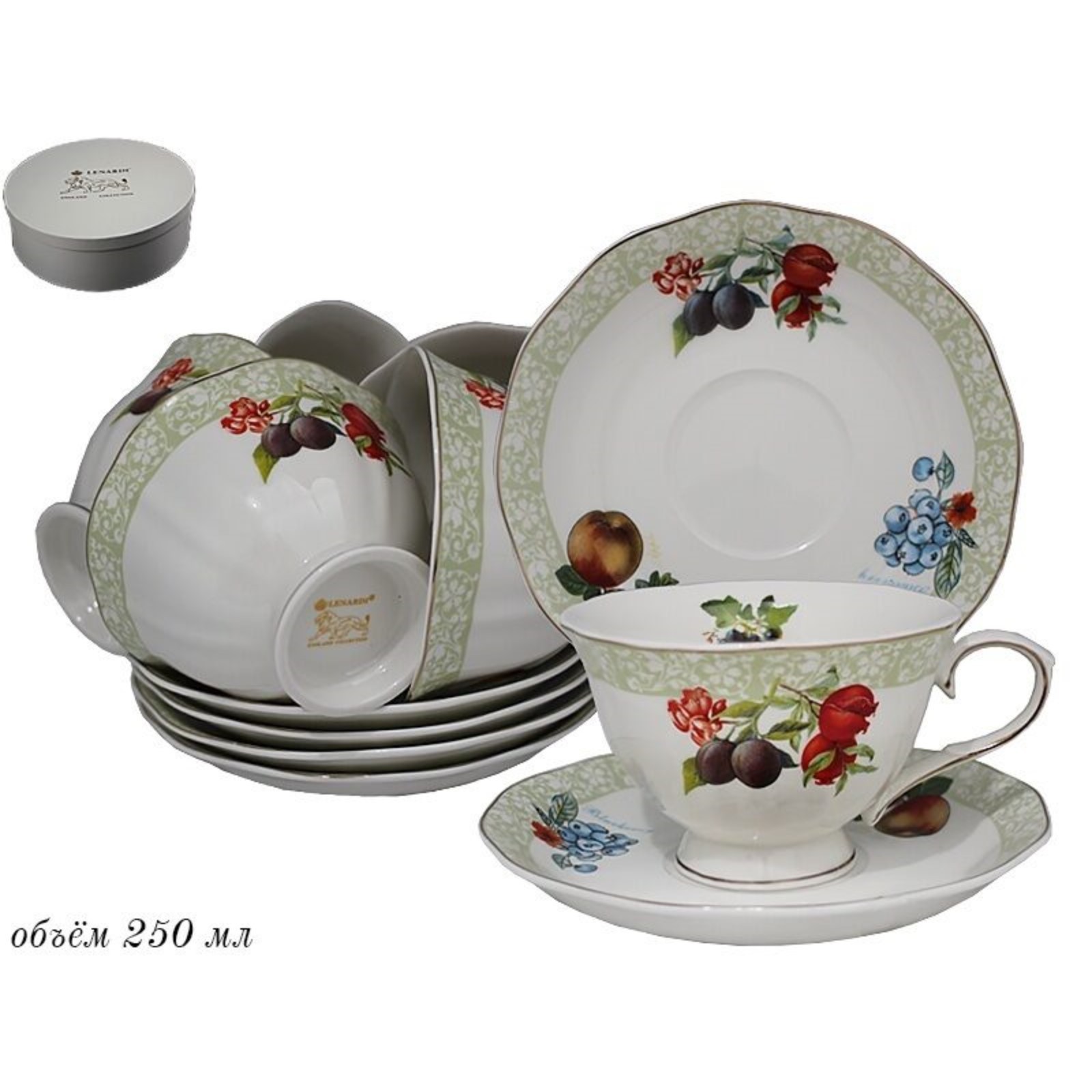 Чайный набор lenardi «фрукты», 12 предметов. Изделие может иметь следующие несущественные дефекты: незначительный скол краски;прерывание и наплыв рисунка;наличие полосы на рисунке;потёртости и наплыв золотой краски на внутренней стороне;небольшие потёртости и царапины на глазури;засорения под глазурью;плотные вздутия глазури на внутренней поверхности;натёк глазури;наличие мушек (чёрных точек);неровность внутреннего отверстия;отклеивание страз;потёртость упаковки в уголках. Данные недостатки не влияют на свойства изделия при использовании. Цвет: Белый Количество персон: 6 В наборе, шт.: 12 Объём, мл: 250 tnved: 6911100000 Тематика: Фрукты Крышка: Нет Материал: Фарфор Наличие подставки: Нет Можно мыть в посудомоечной машине: Нет Можно использовать в СВЧ-печи: Нет Текстура: С рельефом Тип: Чайный сервиз Особенности: С золотой отводкой Матовая поверхность: Нет Серия: Фрукты Серия: Lenardi Фрукты  развернуть описание ▼