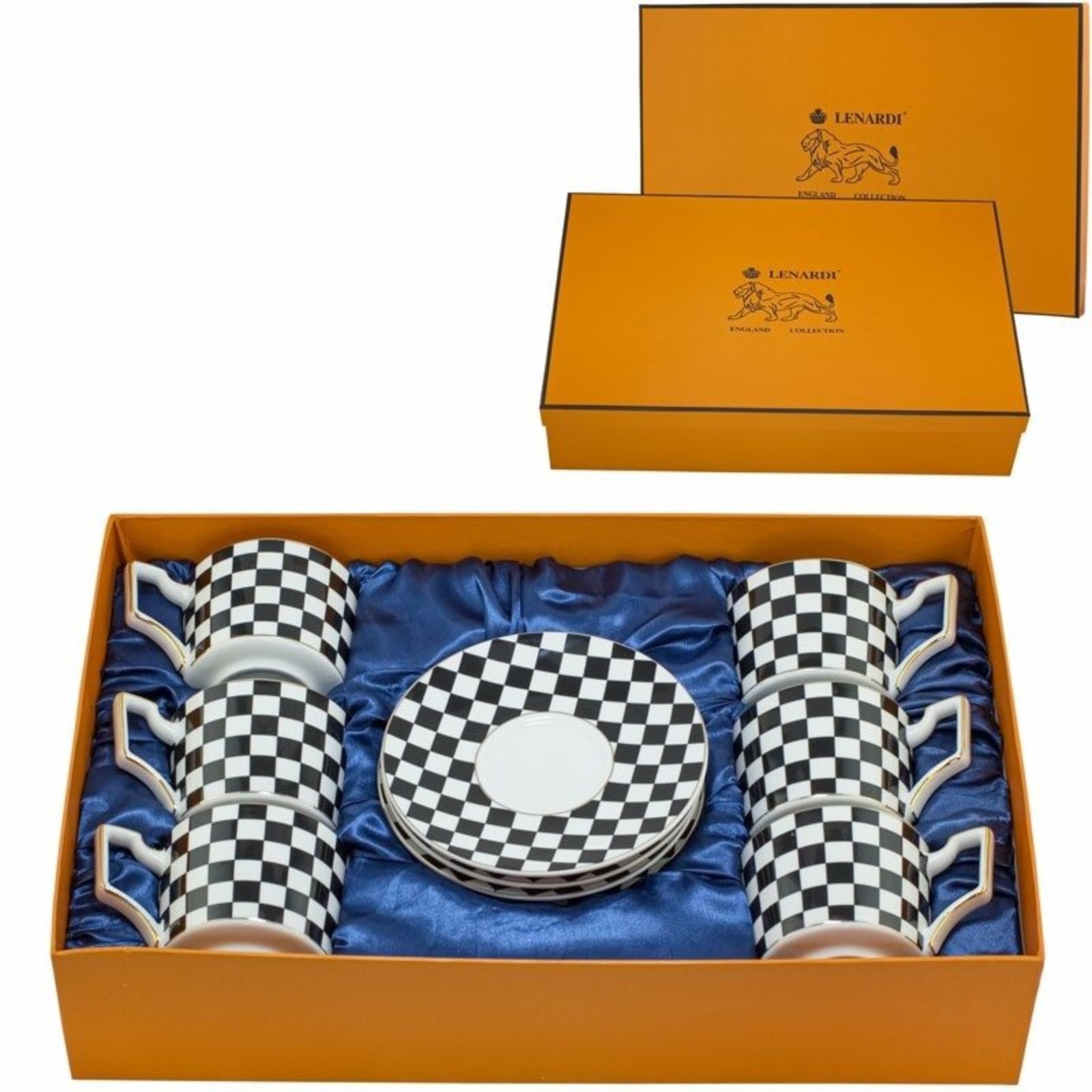 Чайный набор lenardi, 12 предметов. Изделие может иметь следующие несущественные дефекты: незначительный скол краски;прерывание и наплыв рисунка;наличие полосы на рисунке;потёртости и наплыв золотой краски на внутренней стороне;небольшие потёртости и царапины на глазури;засорения под глазурью;плотные вздутия глазури на внутренней поверхности;натёк глазури;наличие мушек (чёрных точек);неровность внутреннего отверстия;отклеивание страз;потёртость упаковки в уголках. Данные недостатки не влияют на свойства изделия при использовании. Цвет: Белый Цвет: Чёрный Количество персон: 6 В наборе, шт.: 12 Объём, мл: 290 Тематика: Клетка Крышка: Нет Материал: Фарфор Наличие подставки: Нет Можно мыть в посудомоечной машине: Нет Можно использовать в СВЧ-печи: Нет Текстура: Гладкая Тип: Чайный сервиз Особенности: С золотой отводкой Матовая поверхность: Нет  развернуть описание ▼