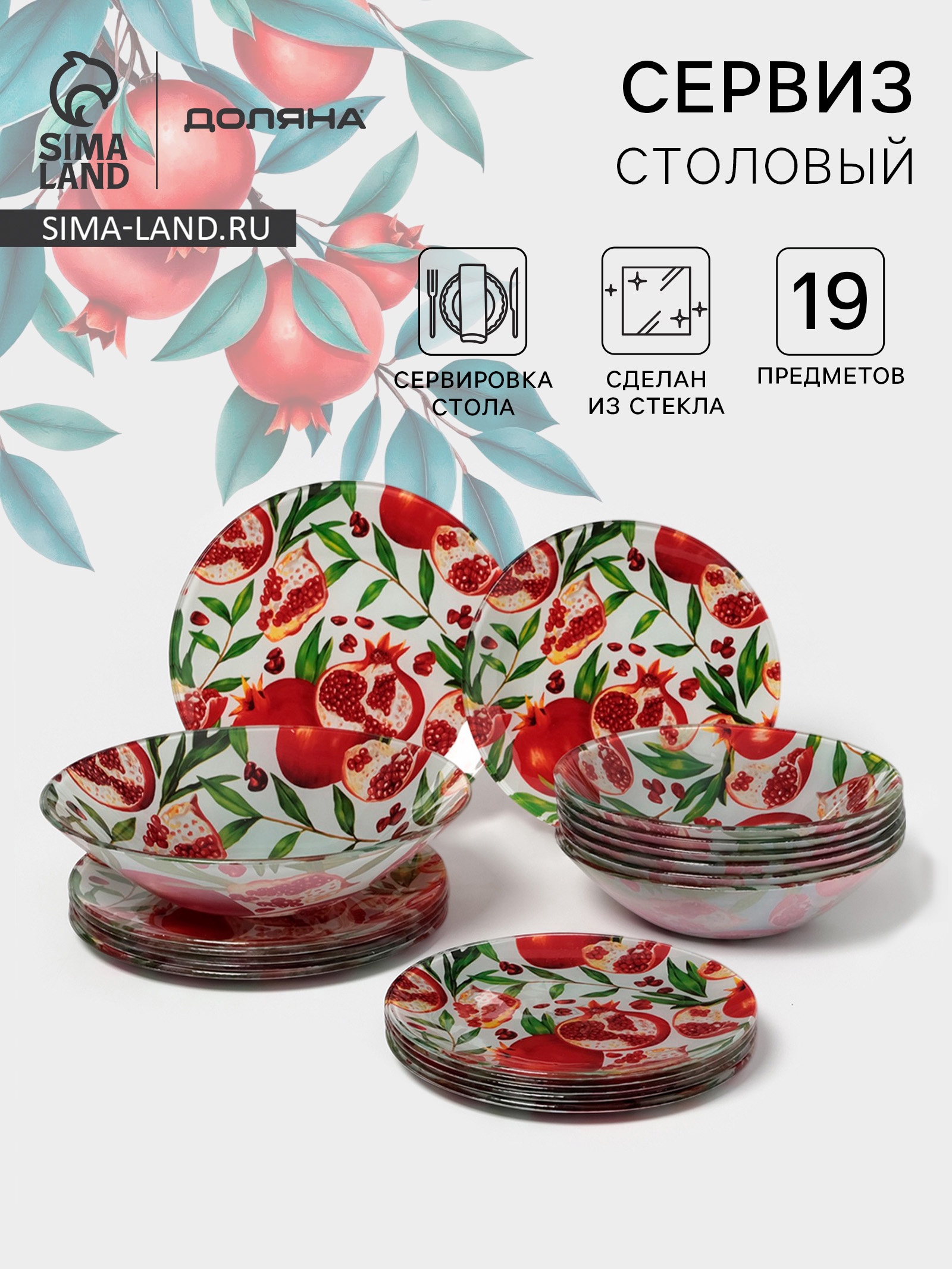 Столовый сервиз доляна «гранат», 19 предметов: салатник 1 шт., тарелка десертная 6 шт., тарелка обеденная 6 шт., тарелка суповая