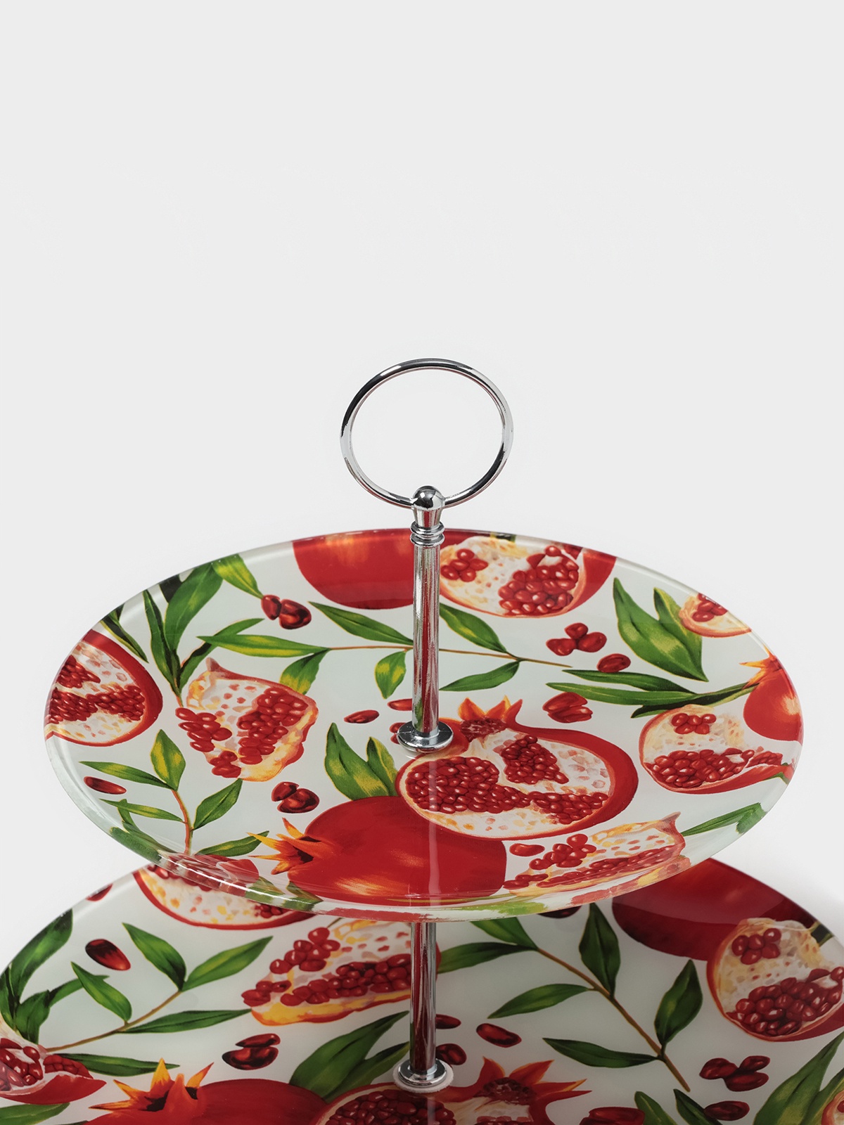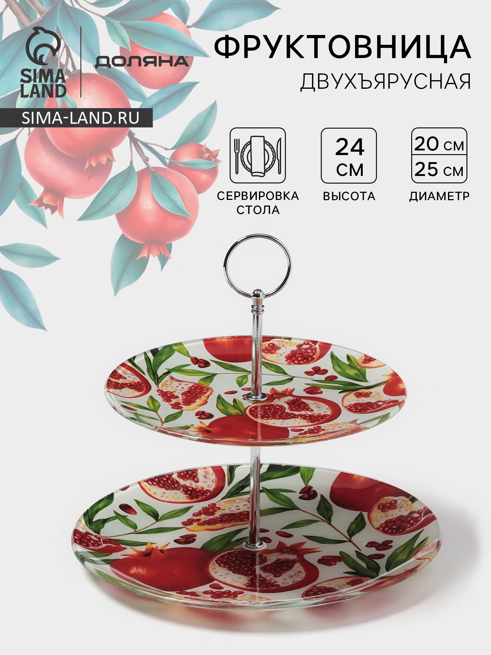 Фруктовница доляна «гранат», d=20/25 см, h=24 см, стекло, рисунок. Эта двухъярусная фруктовница с рисунком Граната – это не только практичный, но и изысканный способ подачи фруктов, десертов и закусок. Двухъярусная конструкция экономит место на столе, а красивый рисунок на стекле добавляет шарма и делает сервировку более привлекательной. Фруктовница станет отличным украшением любого стола и позволит создать праздничную атмосферу. Преимущества: Нежный рисунок. Придает фруктовнице особый шарм и делает сервировку более утонченной.Двухъярусная конструкция. Экономит место на столе и позволяет разместить больше угощений.Универсальность. Подходит для подачи фруктов, конфет, выпечки и других десертов.Практичность. Удобно использовать и легко мыть.Эстетичный вид. Фруктовница украсит ваш стол и сделает сервировку более интересной.Надежность. Изготовлена из прочного стекла.Набор:Нет|Цвет:Разноцветный|Диаметр, см:20|Диаметр, см:25|Количество ярусов:2|Тематика:Фрукты|Рисунок:Да|Материал:Стекло|Вид тарелки:Плоская|Можно мыть в посудомоечной машине:Да|Можно использовать в СВЧ-печи:Нет|Текстура:Гладкая|Особенности:Без особенностей|Страна:Китай  развернуть описание ▼
