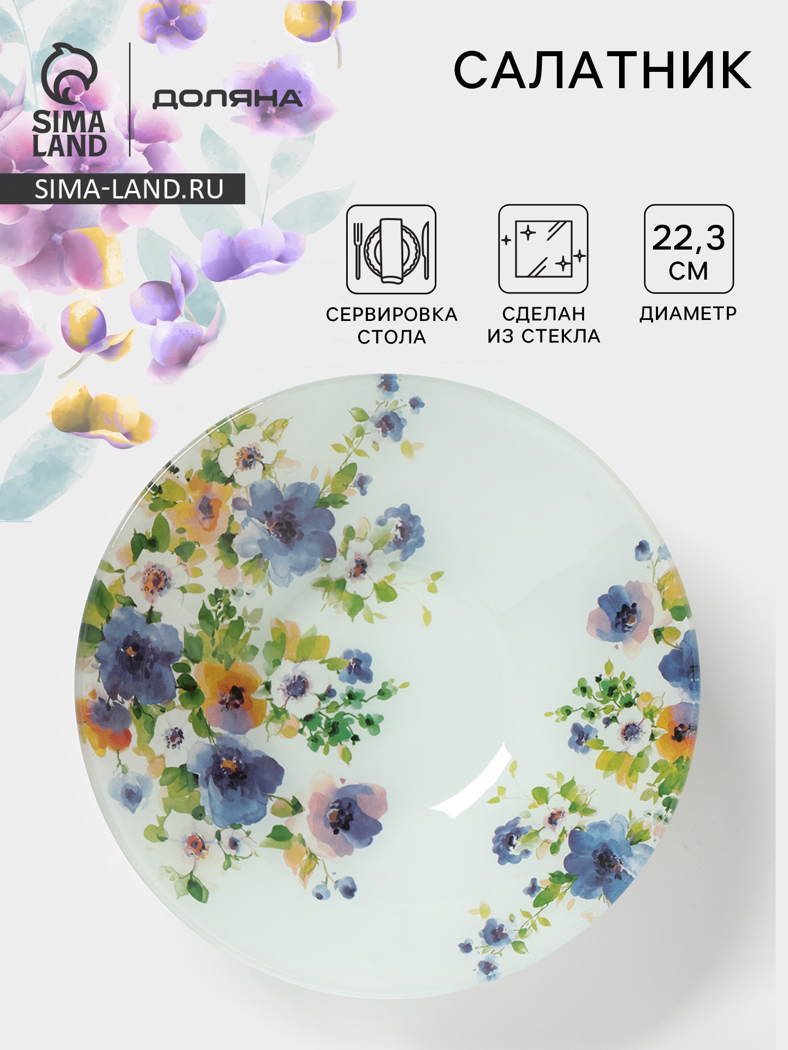 Салатник доляна «букет незабудок», 1 л, D=22.3 см, стекло, рисунок