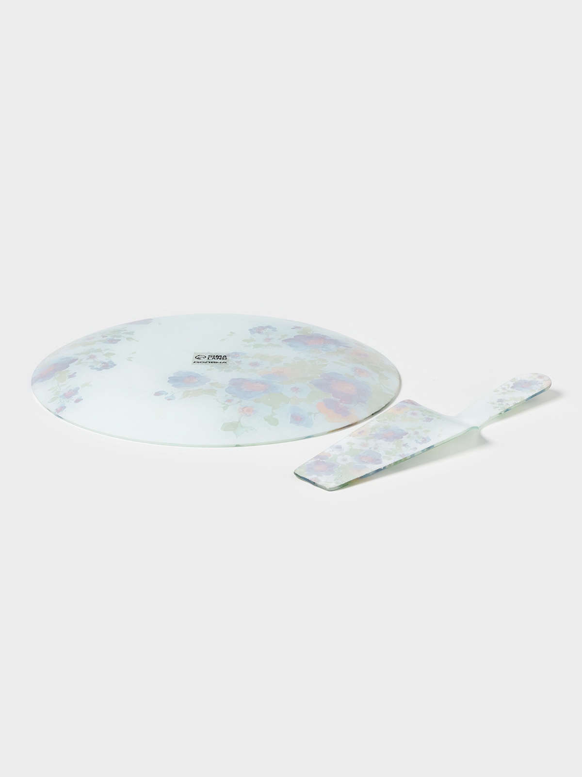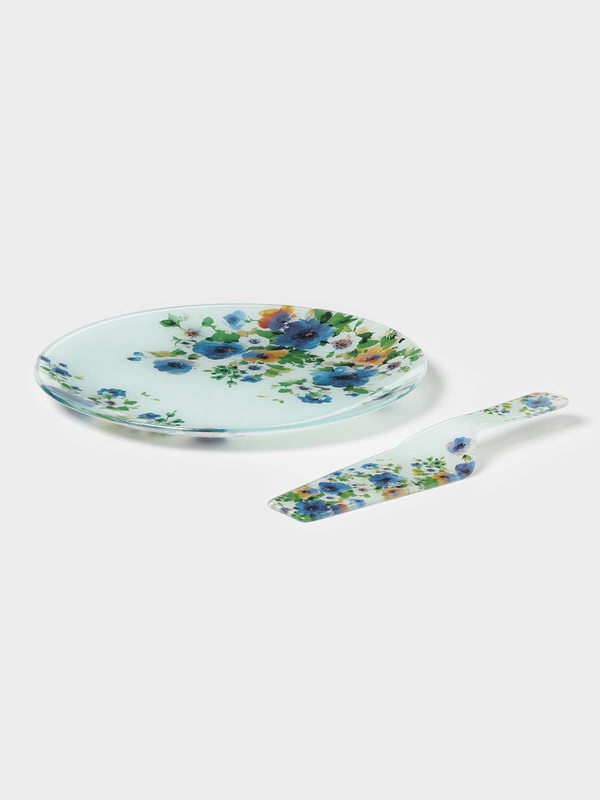 Тортовница с лопаткой доляна «букет незабудок», 2 предмета: блюдо D=30 см, лопатка 26.5 7 2 см, стекло, рисунок