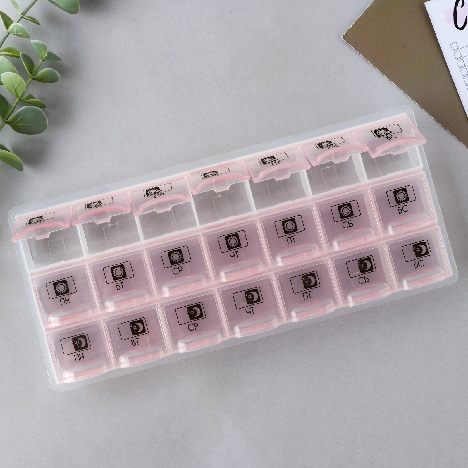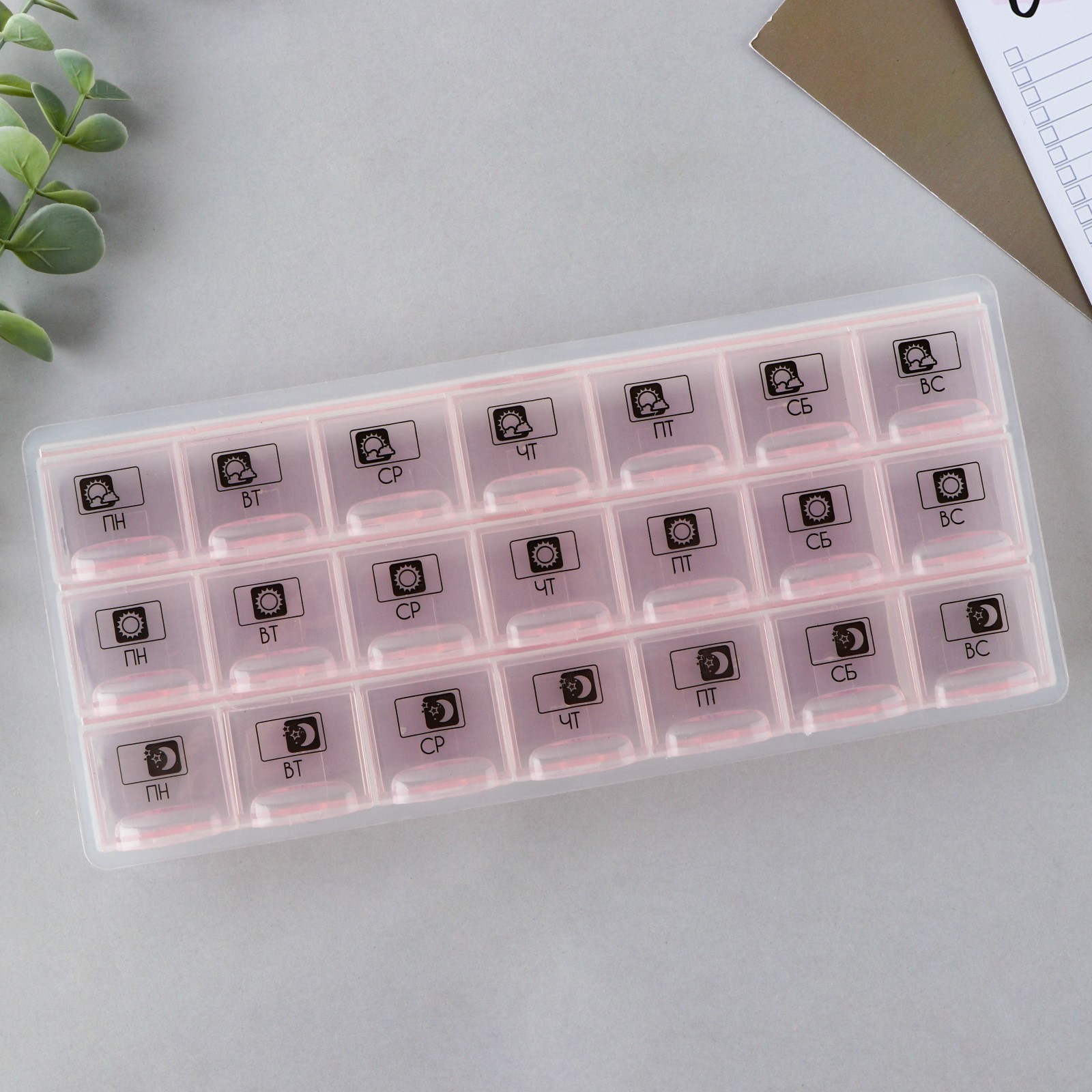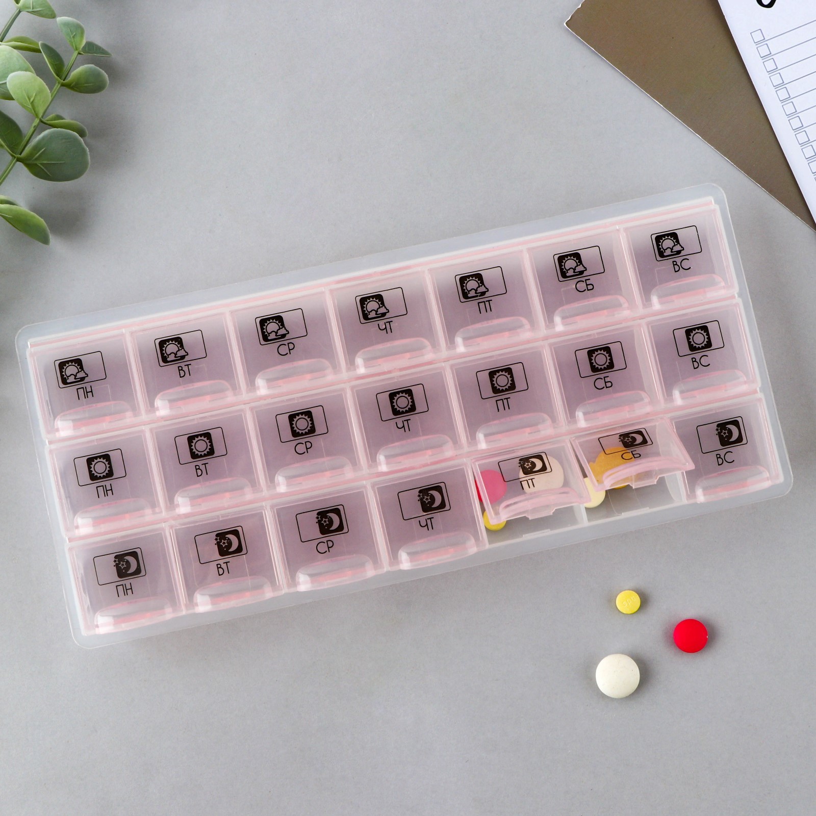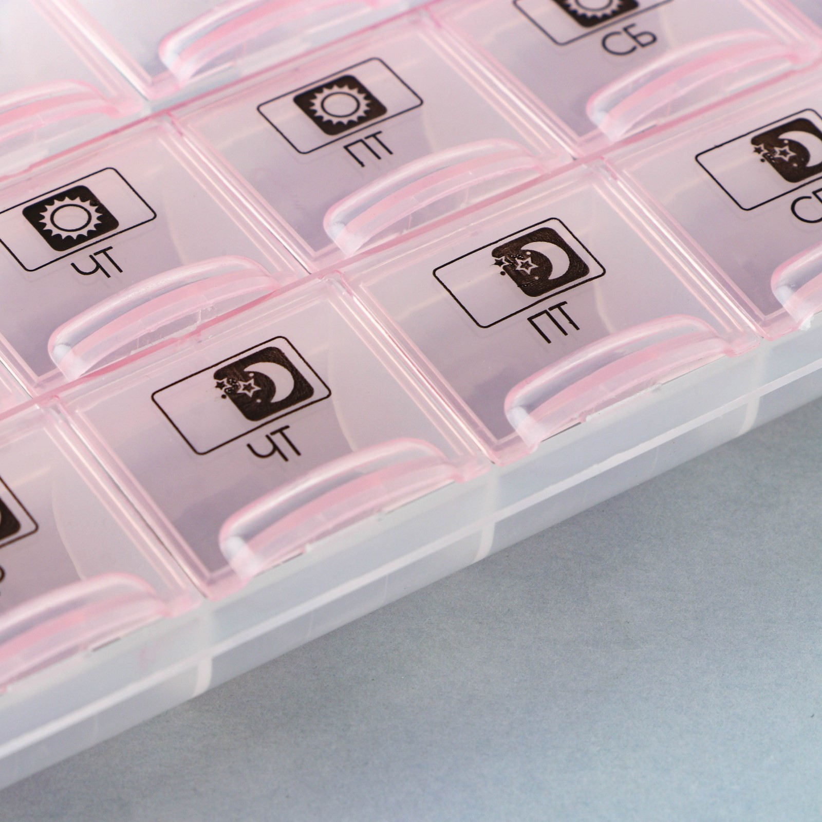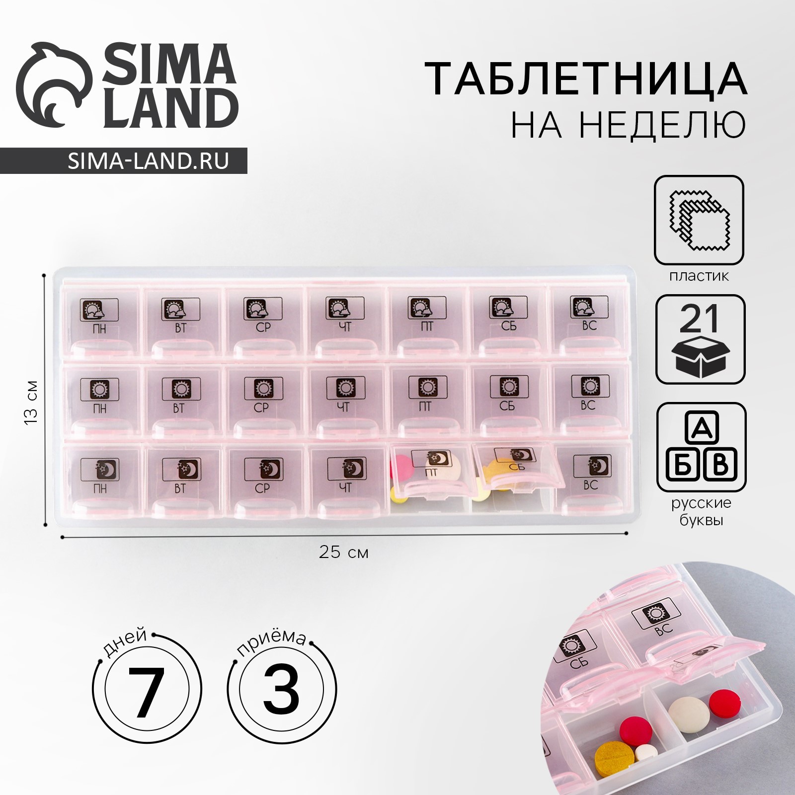 Таблетница органайзер«утро, день, вечер», 21 секция, русские буквы, розовая.