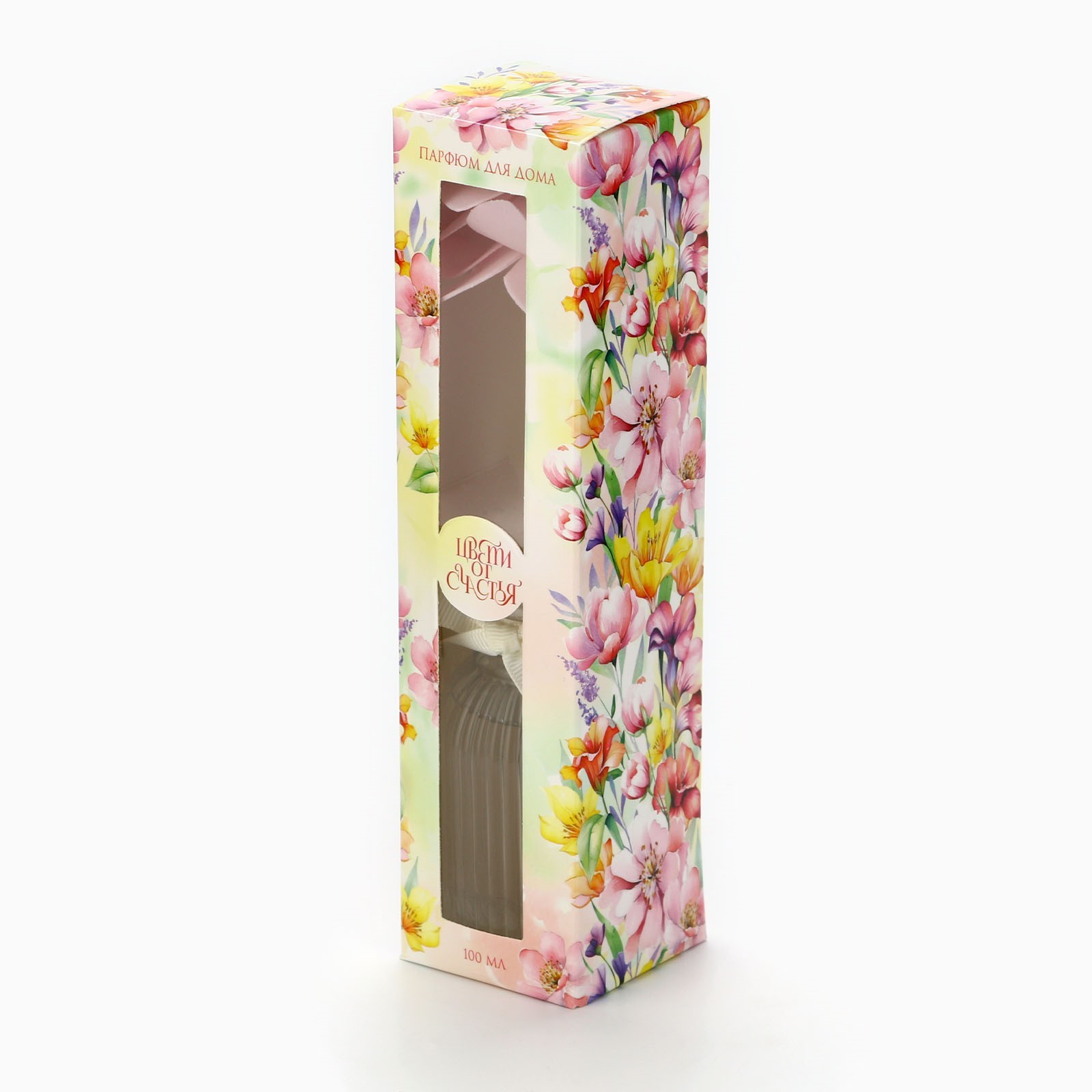 Диффузор ароматический «цвети от счастья», аромат роза, 100 мл.. Ароматический диффузор «Цвети от счастья», аромат «Розы», станет прекрасным дополнением к вашему интерьеру. В стильной стеклянной бутылочке объемом 100 мл с изящным бантом скрывается нежный аромат розы. Три тростниковых палочки с декоративными цветами, словно впитывают в себя аромат и постепенно наполняют пространство нежным цветочным ароматом. С помощью этого парфюма для дома вы можете создать в любом помещении гармоничную и приятную атмосферу, повышающую настроение и помогающую чувствовать себя комфортно. ПрименениеИзвлеките диффузор из упаковки, откройте крышку и защитный колпачок, опустите палочки в ароматизированную жидкость и наслаждайтесь. Ароматизированная жидкость пропитывает палочки, и с их помощью аромат распространяется по всему помещению. parts count: 0 Объём, мл: 100 Вид ароматизатора: В бутылочке Аромат: Роза  развернуть описание ▼