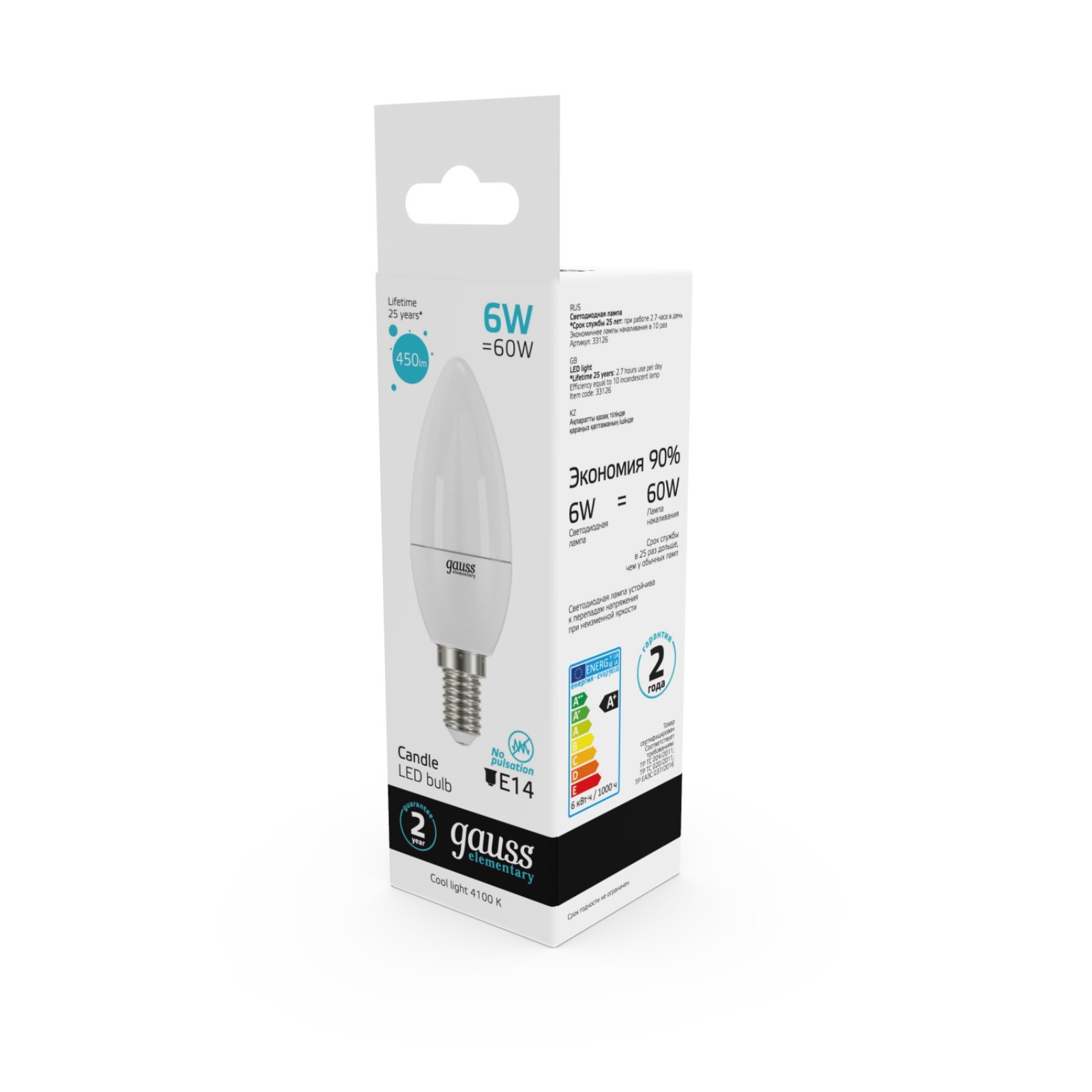 Лампа светодиодная Elementary 6вт свеча 4100к нейтр. бел. E14 450лм Gauss 33126