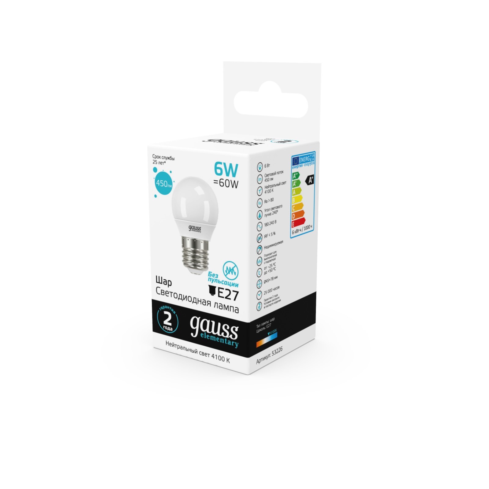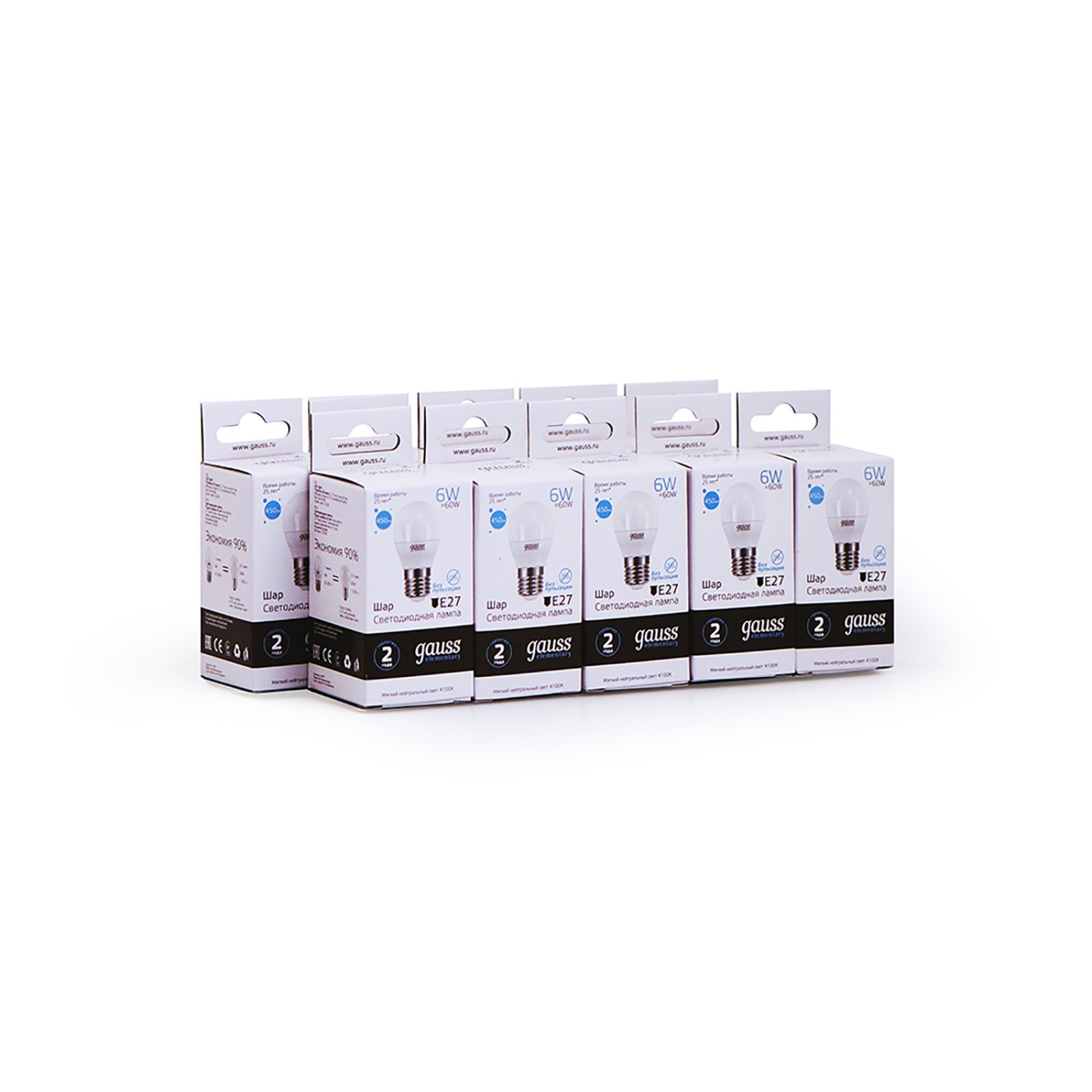 Лампа светодиодная Elementary 6вт шар 4100к нейтр. бел. E27 450лм Gauss 53226