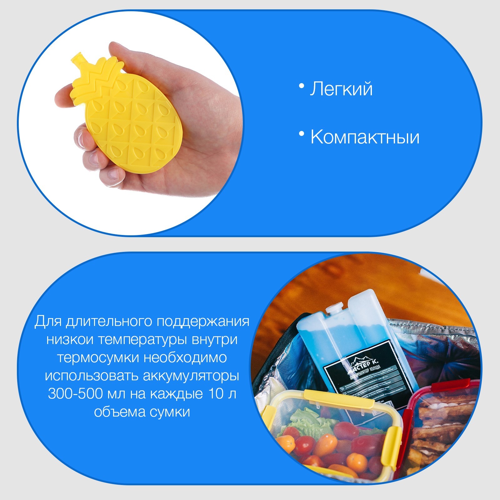 Аккумулятор холода гелевый «мастер к», 60 мл, хладоэлемент для термосумок, 11 6.6 см. Аккумулятор холода предназначен для поддержания низкой температуры в контейнерах из вспененных материалов, сумках-холодильниках и термопакетах. Он равномерно распределяет холод внутри термосумки, не протекает, обеспечивает долговременное охлаждение продуктов. Термоаккумулятор также используется медицинскими работниками и спортсменами для охлаждения отдельных участков тела при ушибах и гематомах, или для восстановления мышц после интенсивных тренировок. Криопакет актуален для хранения продуктов питания и напитков, когда предстоят продолжительные поездки или же отправка на пикник. А также, хранения лекарств, которые требуют пребывания в прохладной среде. Маленький охладитель прост в использовании: достаточно поместить его в холодильник или морозилку на 8-12 часов. После этого терморегулятор разместить в термосумке, контейнере, сумке-холодильнике, термопакете или аптечке. Количество элементов, необходимых для охлаждения, зависит от объемов аксессуара. На каждые 10 литров необходимо использовать 300-500 мл охладителя. Для отдыха на природе, путешествий на автомобиле, рыбалки, охоты, рюкзака – пригодится в самых разных ситуациях. Для дачи, садового домика, где нет полноценного холодильника, станет незаменимым решением. Длина, см:11|Ширина, см:6.6|Время сохранения тепла/холода, ч:20|Объём, мл:60|Вид:Твёрдый|Страна:Китай  развернуть описание ▼