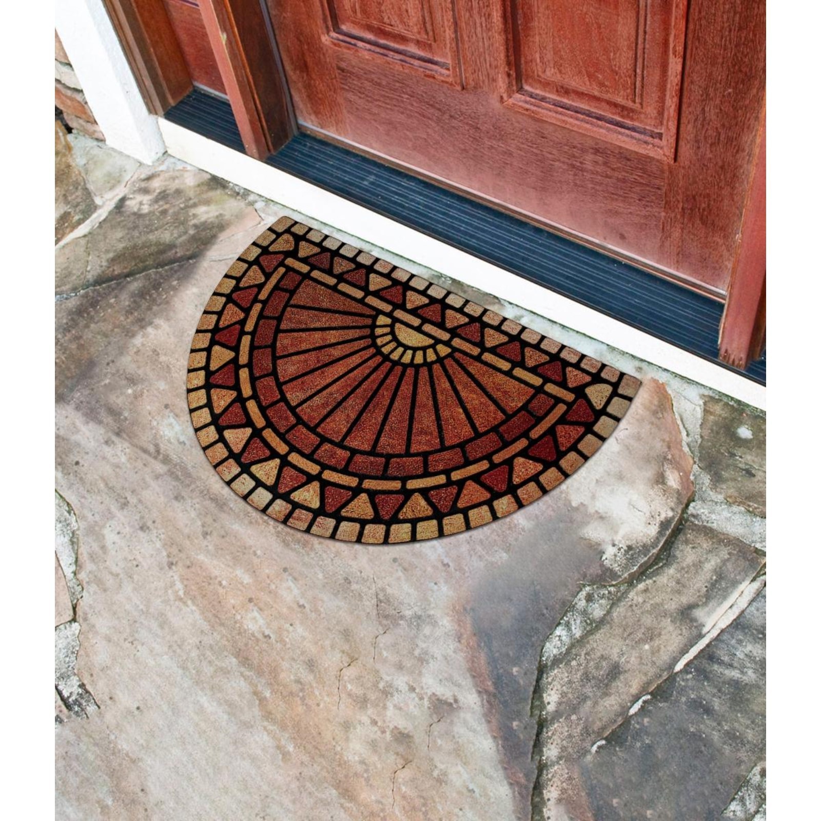Коврик придверный флокированый 45х75 см, рисунок пражский град. Коврик придверный флокированый из переработанной резины, лицевая сторона - полиэстер. Размер 45х75 см, толщина 7 мм, плотность 5500 г/м2. Цвет: Коричневый Форма: Полукруглая Длина, см: 45 Ширина, см: 75 Тематика: Геометрия Материал: Резина Вид покрытия коврика: Комбинированный Форма: Полукруглая  развернуть описание ▼