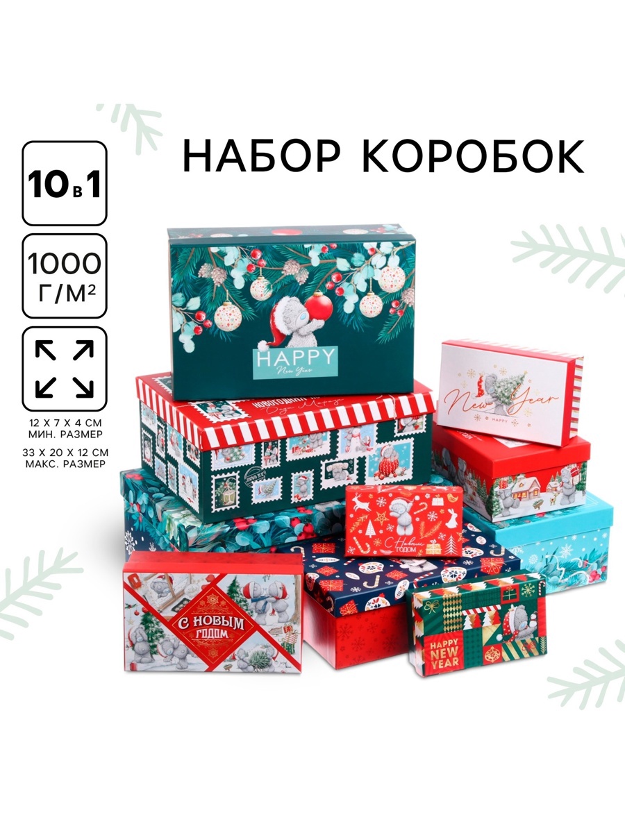 Подарочные коробки набор 10 в 1 «с новым годом», me to you. Размеры коробок: 12 х 7 х 4 см 14 х 8 х 4,5 см 15 х 9,5 х 5,5 см 18 х 11 х 6,5 см 20 х 12,5 х 7,5 см 22 х 14 х 8,5 см 24 х 15,5 х 9,5 см 26 х 17 х 10 см 28 х 18,5 х 11 см 33 х 20 х 12 см Цвет:Разноцветный|Для кого:Для девочки|Для кого:Для мальчика|Форма:Прямоугольная|Плотность, г/м :1000|Количество вложений в наборе :10 в 1|Высота большей коробки, см:12|Ширина большей коробки, см:20|Длина большей коробки, см:33|Допустимый вес вложения, г:4000|Тематика:Мультфильмы|Тематика:Новогодняя|Символ года:Нет|Тематика праздника:Новый год|Материал:Картон|Размер:Средний (18-24 см)|Страна:Китай  развернуть описание ▼