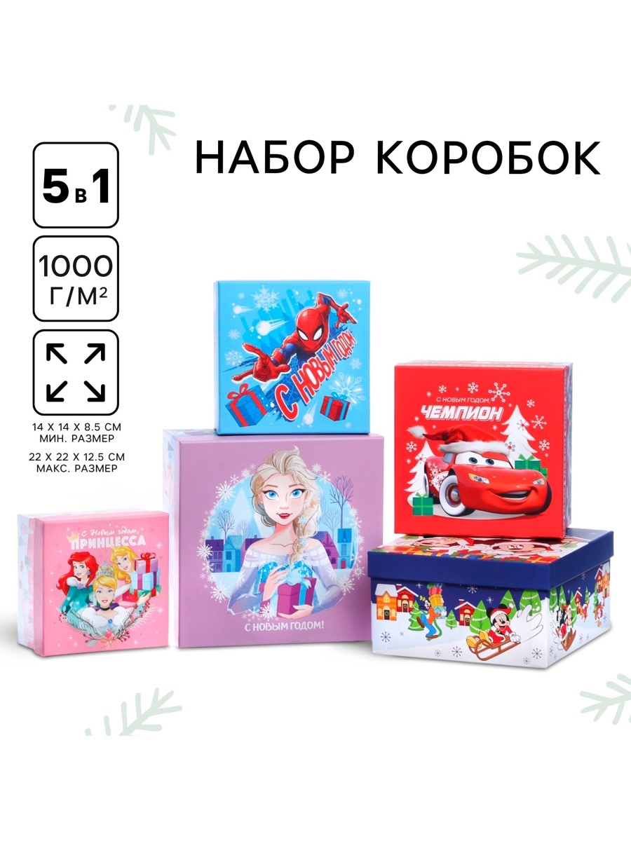 Коробки подарочные 5 в 1 «с новым годом!», disney. Размеры коробок: 22 х 22 х 12 см 20 х 20 х 11 см 18 х 18 х 10 см 16 х 16 х 9 см 14 х 14 х 8 см Цвет:Разноцветный|Для кого:Для девочки|Для кого:Для мальчика|Форма:Квадратная|Плотность, г/м :1000|Количество вложений в наборе :5 в 1|Высота большей коробки, см:12.5|Длина большей коробки, см:22|Ширина большей коробки, см:22|Допустимый вес вложения, г:5000|Тематика:Новогодняя|Тематика:Детская|Тематика:Мультфильмы|Символ года:Нет|Тематика праздника:Новый год|Материал:Картон|Размер:Средний (18-24 см)|Страна:Китай  развернуть описание ▼