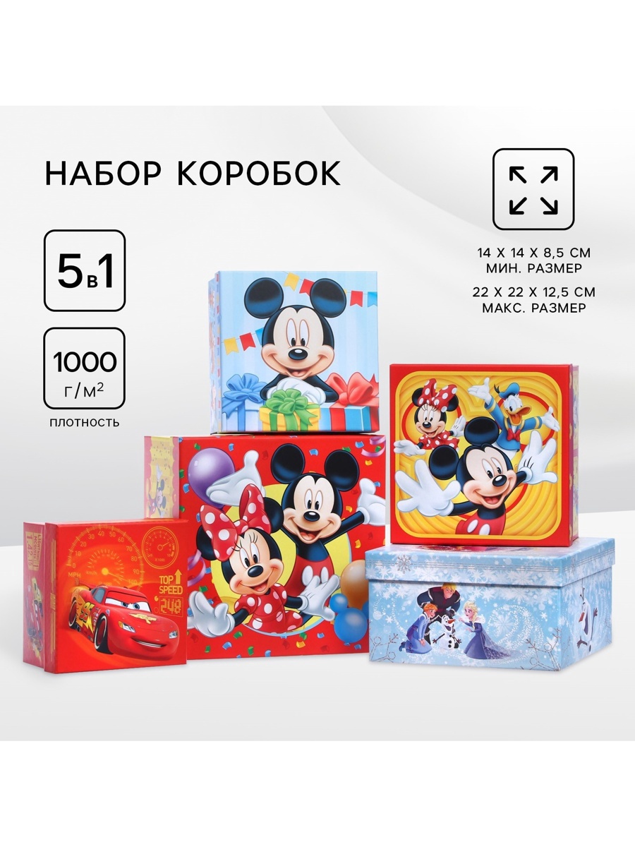 Набор коробок 5 в 1, disney, 14 14 8.5 - 22 22 12.5 см. Размеры коробок: 22 х 22 х 12 см 20 х 20 х 11 см 18 х 18 х 10 см 16 х 16 х 9 см 14 х 14 х 8 см Цвет:Разноцветный|Для кого:Для мальчика|Для кого:Для девочки|Форма:Квадратная|Плотность, г/м :1000|Длина, см:22|Ширина, см:22|Количество вложений в наборе :5 в 1|Высота большей коробки, см:12.5|Длина большей коробки, см:22|Ширина большей коробки, см:22|Тематика:Детская|Тематика:Мультфильмы|Тематика праздника:Универсальная тематика|Материал:Картон|Вид:Наборы коробок|Размер:Средний (18-24 см)|Страна:Китай  развернуть описание ▼