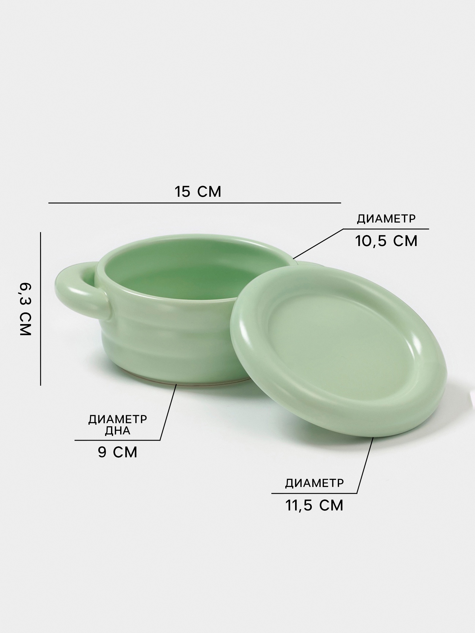 Горшочек для запекания доляна «зефир», 250 мл, 15 10.5 6.3 см, с ручками, с крышкой, керамика, зелёный. Погрузитесь в мир кулинарного вдохновения с горшочком для запекания «Зефир», который станет вашим верным помощником на кухне. Объём в 250 мл идеально подходит для запекания небольших порций, а крышка позволяет сохранить все ароматы и соки, делая блюда еще более насыщенными. Компактные размеры (15х10,5х6,3 см) делают его удобным для хранения и использования, а качественная керамика обеспечивает равномерное прогревание и долговечность. Преимущества: Эстетичный дизайн: насыщеннй зелёный цвет и стильный дизайн делают его не только функциональным, но и красивым элементом вашей кухни.Удобство в уходе: горшок можно мыть в посудомоечной машине.Многофункциональность: идеально подходит для запекания, а также для хранения различных продуктов, что позволяет вам использовать его в разных кулинарных задачах.Качество материалов: прочная керамика гарантирует долговечность и устойчивость к повреждениям, позволяя наслаждаться им долгие годы.Набор:Нет|Цвет:Зелёный|Диаметр, см:10.5|Объём, л:0.25|Диаметр дна, см:9|Диаметр крышки, см:11.5|Объём, мл:250|Рисунок:Нет|Крышка:Да|Материал крышки:Керамика|Материал:Керамика|Тип формы:Для приготовления вторых блюд|Можно мыть в посудомоечной машине:Да|Можно использовать в СВЧ-печи:Да|Текстура:С рельефом|Особенности:Без особенностей|Матовая поверхность:Нет|Для горячего:Да|Страна:Китай  развернуть описание ▼