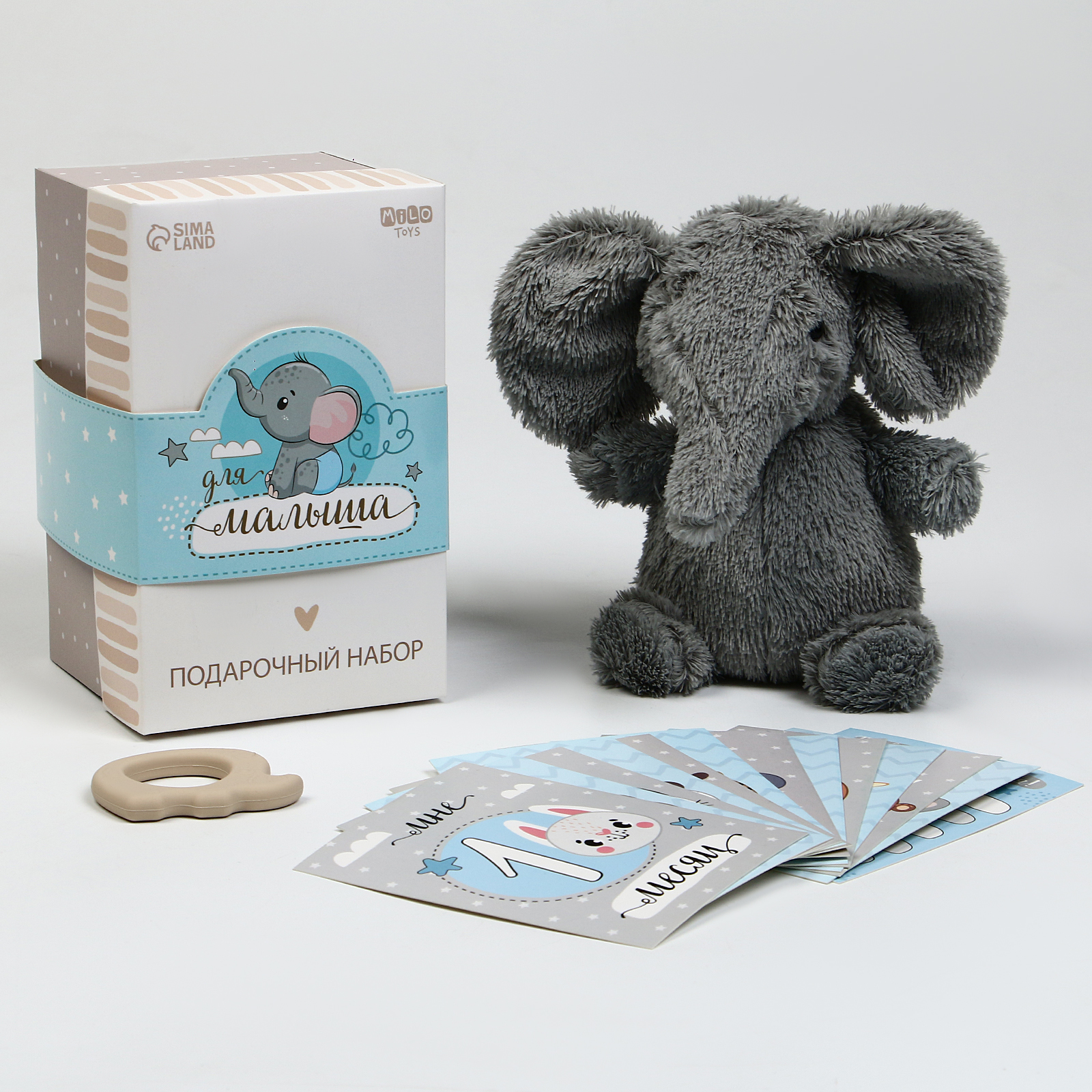 Набор подарочный: мягкая игрушка+прорезыватель+карточки для фото «слон», 18 см. Подарочный набор «Слонёнок» — это трогательный серый слонёнок, прорезыватель и карточки для памятных фото. Набор в красивой коробке станет первым другом ребёнка и поможет в развитии с первых месяцев. Особенности Мягкий слонёнок размером 18 см из приятного на ощупь полиэстера подходит для обнимашек и спокойного сна. Его удобно брать с собой на прогулку или в гости.Безопасный силиконовый прорезыватель помогает при прорезывании зубов и массирует дёсны. Лёгкий, с удобной формой для маленьких ручек.12 карточек для фото — запечатлейте первые месяцы жизни и сохраните трогательные моменты роста малыша. Карточки из плотного картона сохранят теплые воспоминания.Подарочный набор «Слонёнок» подойдёт как для мальчика, так и для девочки с 3 месяцев. Коробка с милым слоником создаёт праздничное настроение. Игрушка развивает тактильное восприятие, а прорезыватель облегчает дискомфорт при росте зубов. Это тот случай, когда подарок красивый, полезный и надолго остаётся в памяти. Набор:Да|Цвет:Серый|Для кого:Для мальчика|Высота, см:12.5|Возраст:От 3 месяцев|В наборе, шт.:15|Вид упаковки:Коробка картонная|Адресат:Малышу/Малышке/Новорождённому|Материал:Картон|Материал:Полиэстер|Материал:Пластик|Материал:Силикон|Особенности:В подарочной упаковке|Составляющие набора:Мягкая игрушка|Возраст:Для детей|Страна:Китай  развернуть описание ▼