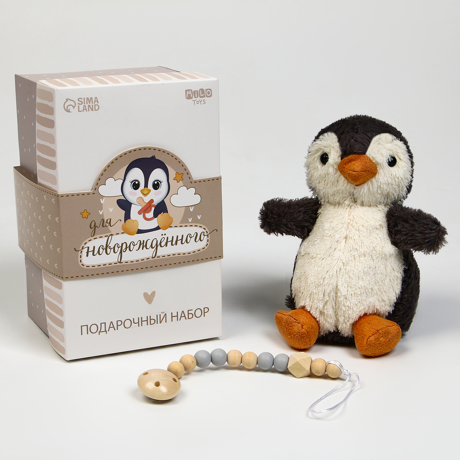 Набор подарочный: мягкая игрушка+держатель для пустышки пингвин, 17 см.. Нежный подарок для самых маленьких! Мягкий пингвин с держателем для пустышки — это уютный комплект в серых тонах для новорождённых. Набор упакован в подарочную коробку — готовый презент для малыша на рождение или первый праздник. Особенности Мягкий пингвинёнок размером 17 см. Игрушка из приятного на ощупь полиэстера. Размер удобен для малышей — можно обнимать, брать с собой в кроватку.Деревянный держатель для пустышки — экологичный аксессуар. Предотвращает падение соски на пол, легко цепляется к одежде. Без острых краёв, подходит детям от 3 месяцев.Игрушка развивает тактильное восприятие, а держатель помогает сохранить чистоту пустышки. Комплект сочетает игровую функцию и бытовую пользу.Подарочный набор «Пингвин» — трогательный подарок для новорождённого. Комплект подойдёт к любому интерьеру детской. Набор:Да|Цвет:Белый|Цвет:Чёрный|Для кого:Для мальчика|Высота, см:10.5|Возраст:От 3 месяцев|В наборе, шт.:2|Вид упаковки:Коробка картонная|Адресат:Малышу/Малышке/Новорождённому|Материал:Дерево|Материал:Пластик|Материал:Полиэстер|Особенности:В подарочной упаковке|Составляющие набора:Мягкая игрушка|Возраст:Для детей|Страна:Китай  развернуть описание ▼