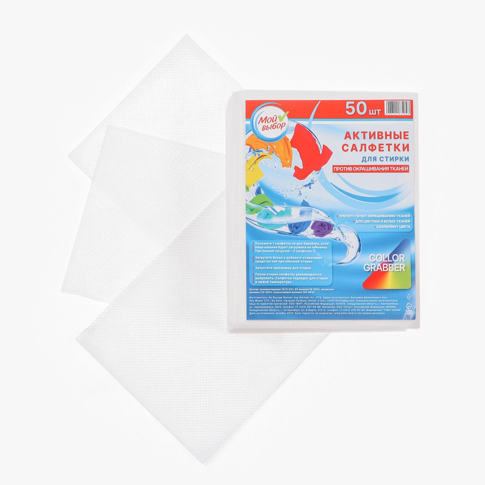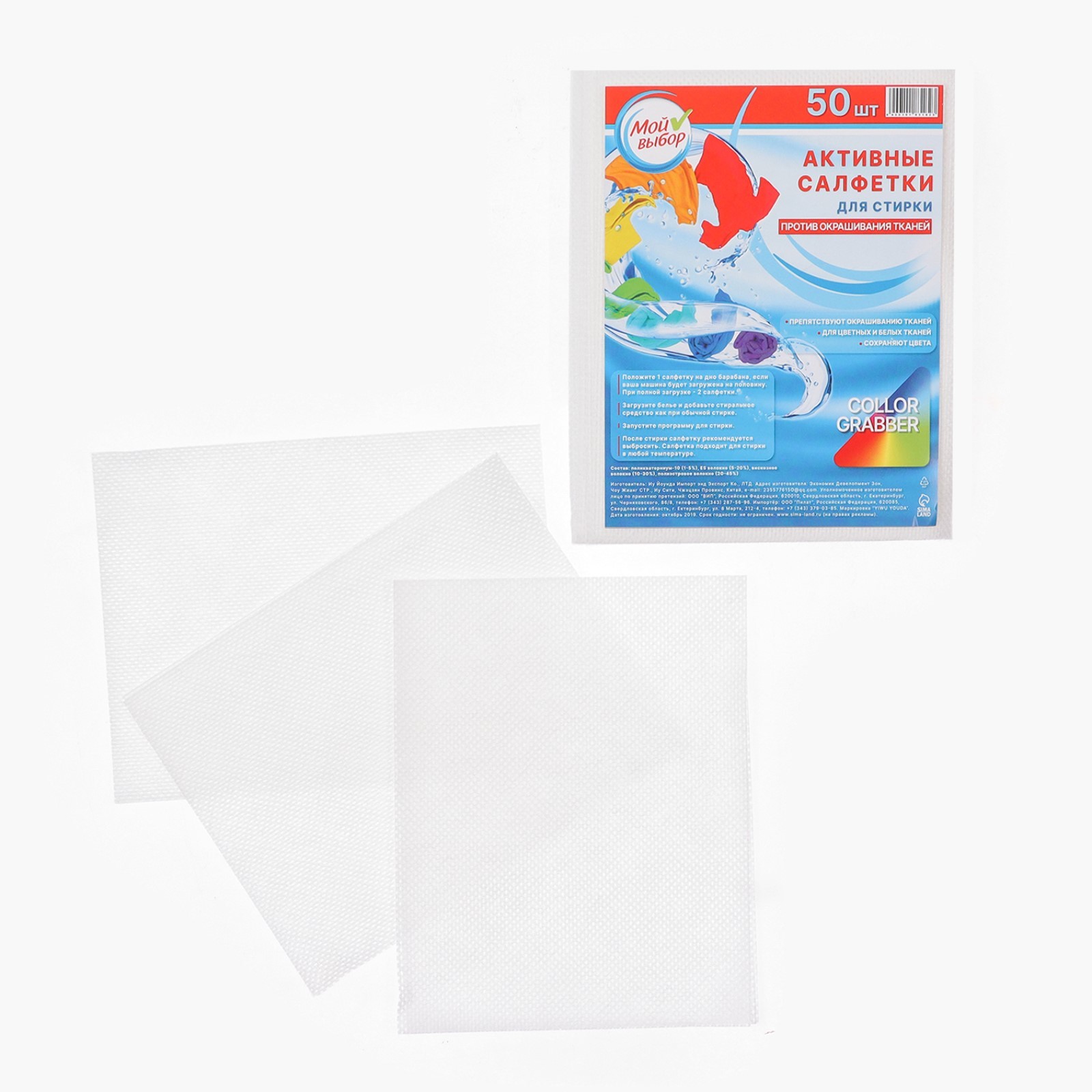 Активные салфетки для стирки тканей разных цветов, в зип-локе 50 шт. Активные салфетки для стирки «Мой выбор» препятствуют окрашиванию тканей и дают возможность стирать белую и разноцветную одежду вместе. Краски остаются яркими и насыщенными, чёрное — чёрным, а белое — белым. Способ применения: 1. Положите 1 салфетку на дно барабана, если ваша машина загружена наполовину. При полной загрузке рекомендуются 2 салфетки. 2. Поместите бельё в барабане, добавьте стиральный порошок и ополаскиватель как обычно. 3. Запустите программу для стирки. 4. После процедуры рекомендуется выбросить салфетку. Состав: поликватерниум-10 (1-5%), ES волокно (5-20%), вискозное волокно (10-30%), полиэстровое волокно (20-45%). В упаковке, шт.: 50 Назначение: Против окрашивания тканей  развернуть описание ▼