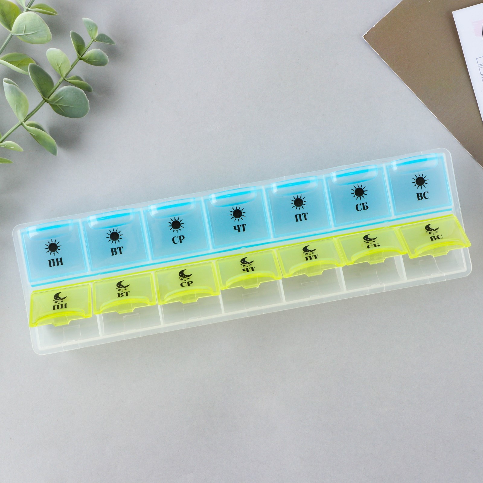 Таблетница органайзер, 14 секций, русские буквы, 21.5 х 2.5 х 6.5 см.. Компактный органайзер изготовлен из пластика безопасного для использования. Предназначен для хранения витаминов и таблеток. Контейнер для таблеток на день послужит компактной аптечкой, которую можно взять на работу, в отпуск, в командировку или для поездки загород на несколько дней. Контейнер органайзер для таблеток подойдет активным людям, которым необходимо принимать лекарства несколько раз в день или же несколько дней подряд вне дома. Цвет: Разноцветный Количество секций: 14 Количество дней: 14 Материал: Пластик Вид: Таблетница Вид: Контейнер  развернуть описание ▼