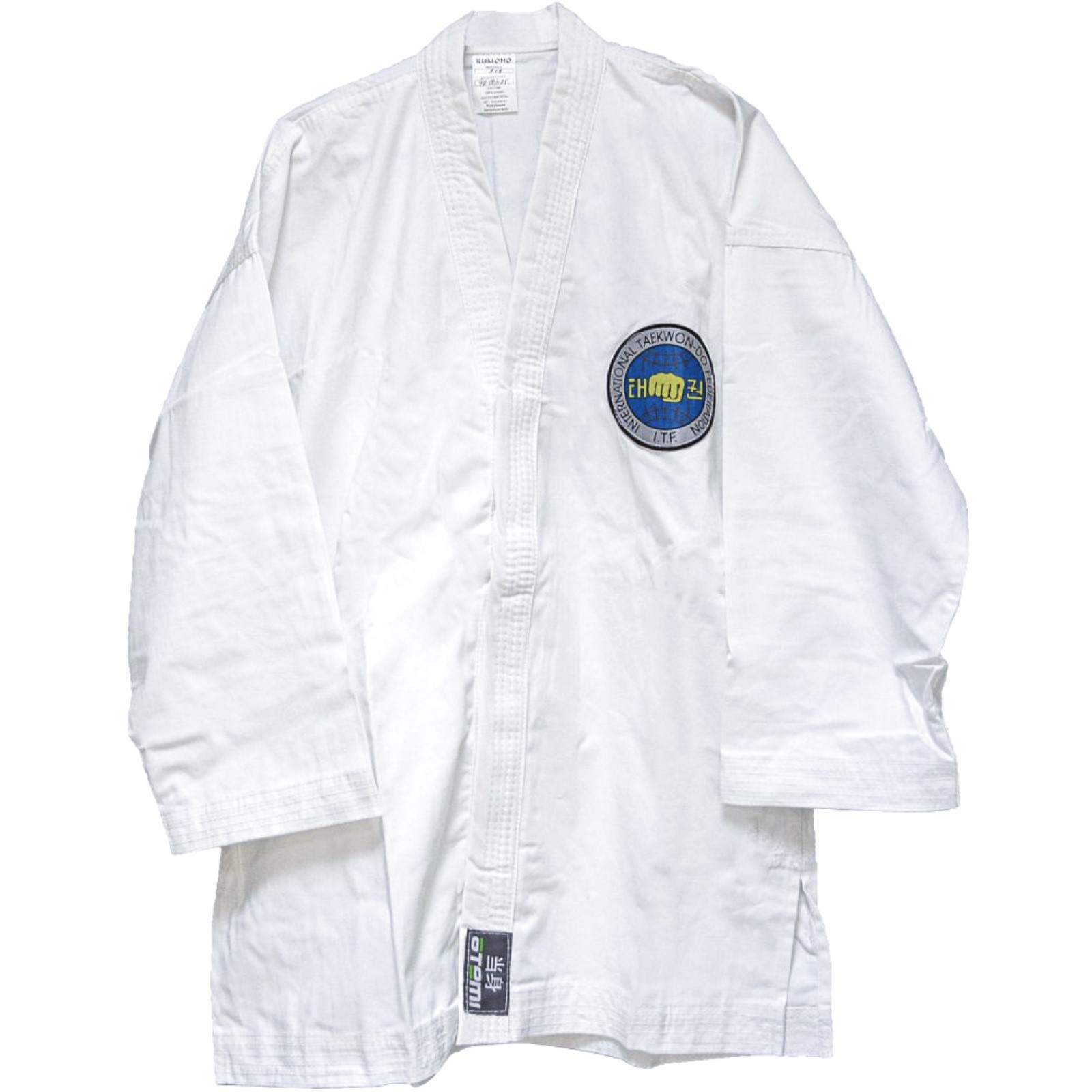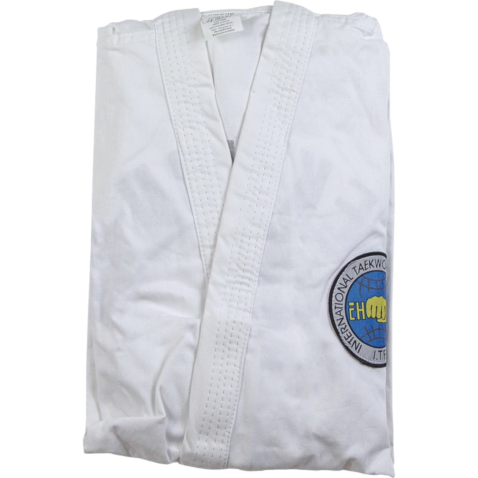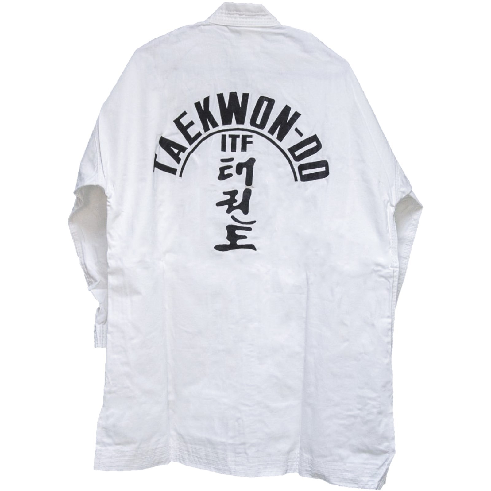 Кимоно для тхэквондо atemi ax8, итф с шелкографией, 220-270 г/м2, размер 52-54/180. Кимоно предназначено для интенсивных тренировок тхэквондо, изготавливается из хлопчатобумажных тканей саржевого переплетения «габардин» с плотностью не менее 220-270 гр/м2. Просторная рубашка с боковыми разрезами и рукавом три четверти застегивается на липучку. Боковые и плечевые швы, края рукавов и низ рубашки, а также края полочек укреплены дополнительными строчками. На спину нанесена надпись «Taekwondo» и иероглифы. На груди рубашка декорирована большой нашивкой. Перед использованием кимоно рекомендуется постирать при температуре +30°C, что даст усадку изделия на 5-10%. Размер: 52 Размер: 54 Рост, см: 180 Состав ткани: Хлопок  развернуть описание ▼