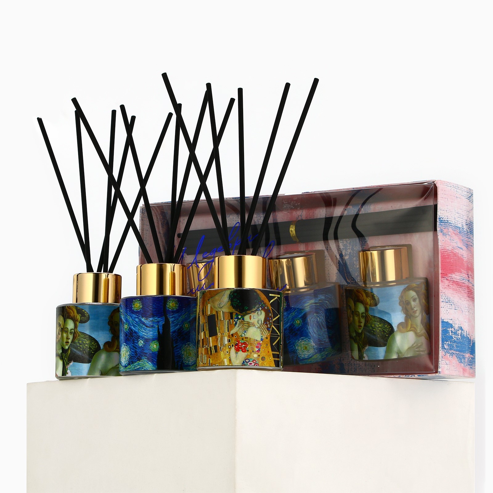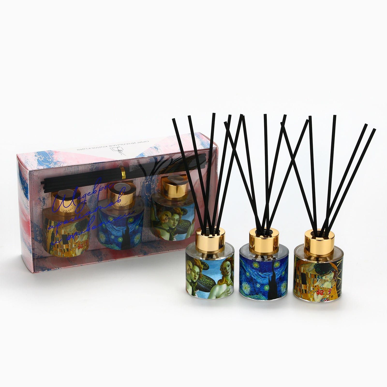 Диффузор ароматический «живопись», 3 шт., 50 мл.. Об удивительных эффектах ароматерапии слышал наверное каждый. Запахи способны успокоить и взбодрить, поднять настроение, а ещё сделать дом самым уютным местом на свете. Используйте приемы благоухающей магии, для создания праздничной атмосферы. Набор состоит из парфюмированной арома жидкости и фибровых аромапалочек. Палочки пропитываются аромамаслами и равномерно распространяют парфюмерные ноты в воздухе в течение длительного времени. В зависимости от их количества меняется интенсивность запаха парфюмерии. По мере испарения доливайте ароматический раствор из рефила, чтобы дополнить вкус и домашнюю атмосферу уютом. Применение: извлеките диффузор из упаковки, откройте крышку и защитный колпачок, опустите фибровые палочки в ароматизированную жидкость и наслаждайтесь. Ароматизированная жидкость пропитывает фибровые палочки, и, с их помощью аромат распространяется по всему помещению. Объём, мл: 50 Вид ароматизатора: В бутылочке Аромат: Сандал Аромат: Свежесть Аромат: Лотос  развернуть описание ▼