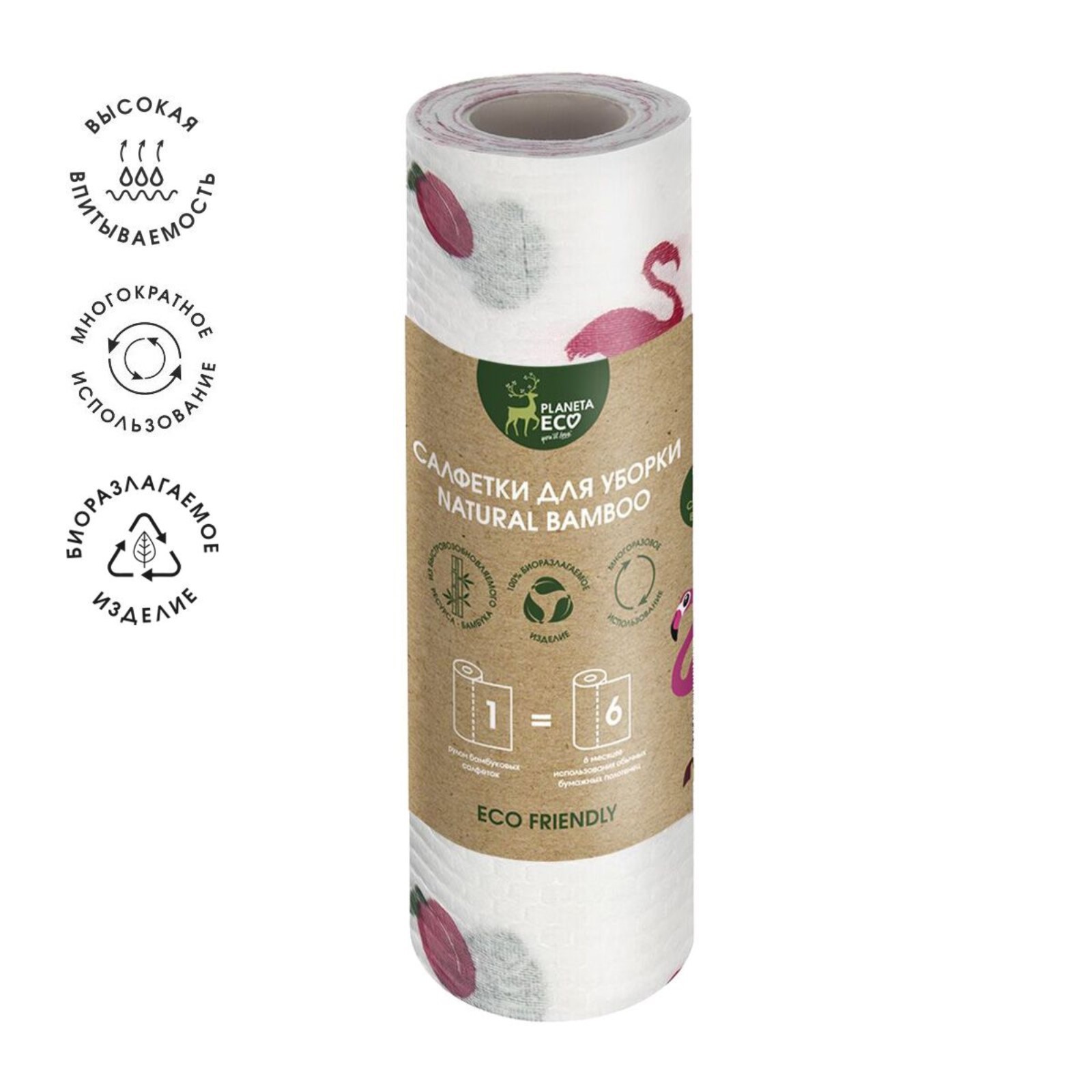 Салфетки бамбуковые в рулоне с принтом «фламинго», 50 шт, 30х30 см