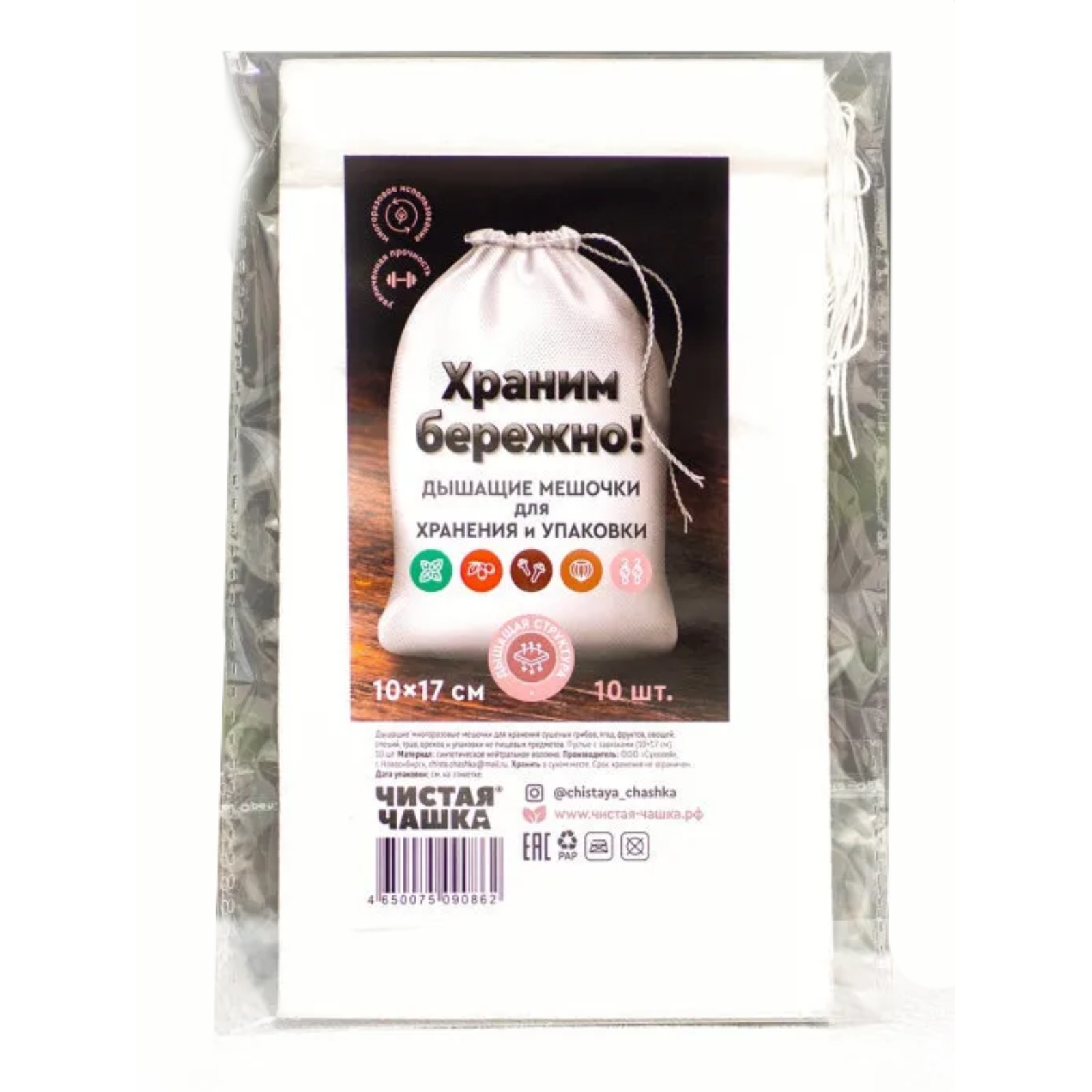 Мешочки дышащие для хранения и упаковки чистая чашка, 10х17 см,10 шт. Многоразовые пакеты «Храним бережно» предназначены для бережного хранения продуктов и вещей, требующих дополнительной аэрации. Эти экомешочки пропускают воздух и умеренно пропускают влагу. Идеально подходят для хранения и упаковки фруктов, овощей, сухофруктов, орехов и других свежих и сухих продуктов, а также вещей. Материал нейтрален в биологической среде, прочный, позволяет использовать его несколько раз, выдерживает стирку при высокой температуре, кипячение. Пакеты имеют цветные плотные верёвочки-шнурочки. Обеспечивают прочное закрытие содержимого и позволяют легко открыть мешочек. Верёвочки разного цвета, что позволит вам помнить, какой продукт куда положили. «Дышащее» свойство экопакетов, прочность материала, его экологичность и многоразовое использование обеспечивают бережное хранение продуктов и вещей. В упаковке, шт.: 10 Материал: Нетканый материал  развернуть описание ▼