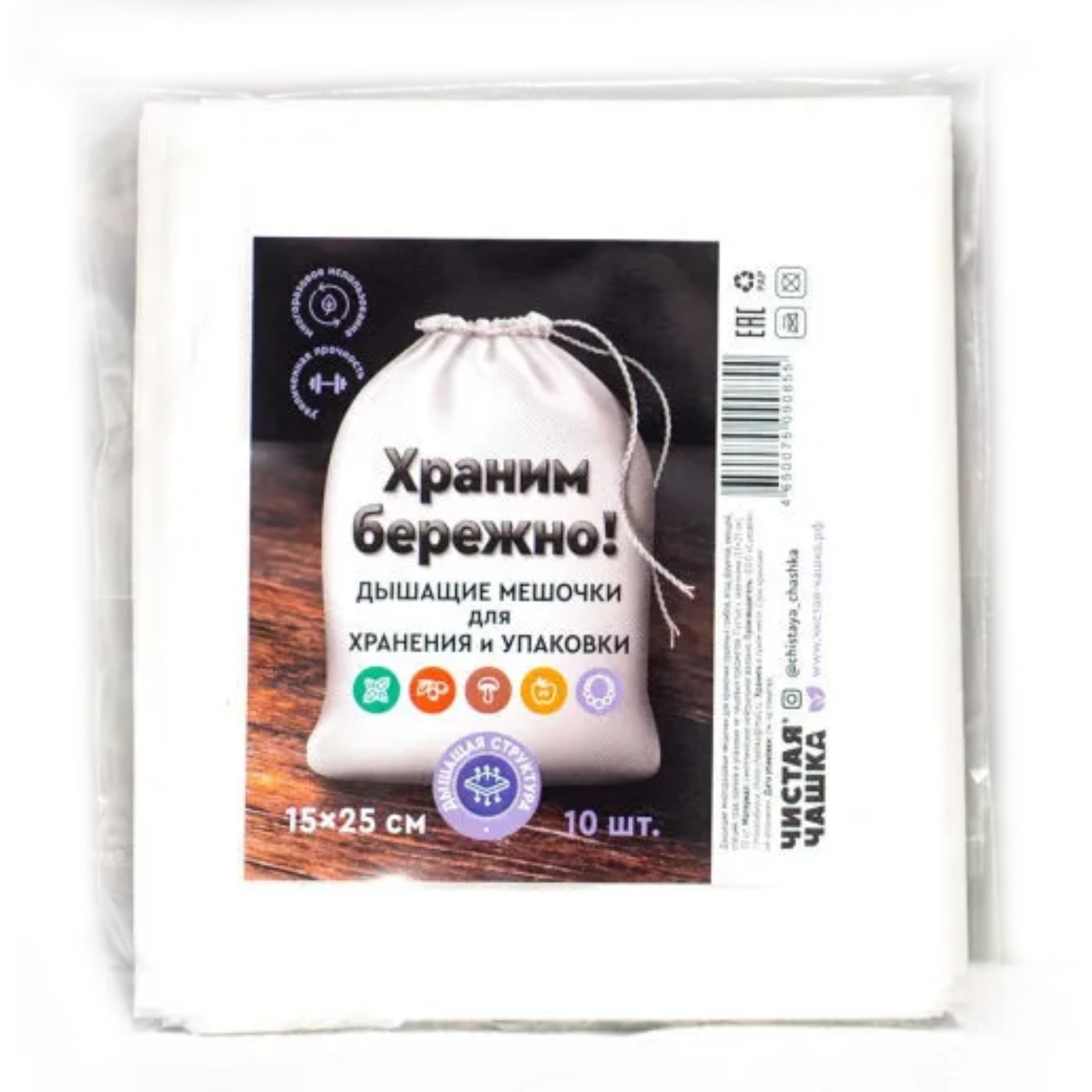 Мешочки дышащие для хранения и упаковки чистая чашка, 15х25 см, 10 шт. Многоразовые пакеты «Храним бережно» предназначены для бережного хранения продуктов и вещей, требующих дополнительной аэрации. Эти экомешочки пропускают воздух и умеренно пропускают влагу. Идеально подходят для хранения и упаковки фруктов, овощей, сухофруктов, орехов и других свежих и сухих продуктов, а также вещей. Материал нейтрален в биологической среде, прочный, позволяет использовать его несколько раз, выдерживает стирку при высокой температуре, кипячение. Пакеты имеют цветные плотные верёвочки-шнурочки. Обеспечивают прочное закрытие содержимого и позволяют легко открыть мешочек. Верёвочки разного цвета, что позволит вам помнить, какой продукт куда положили. «Дышащее» свойство экопакетов, прочность материала, его экологичность и многоразовое использование обеспечивают бережное хранение продуктов и вещей. В упаковке, шт.: 10 Материал: Нетканый материал  развернуть описание ▼