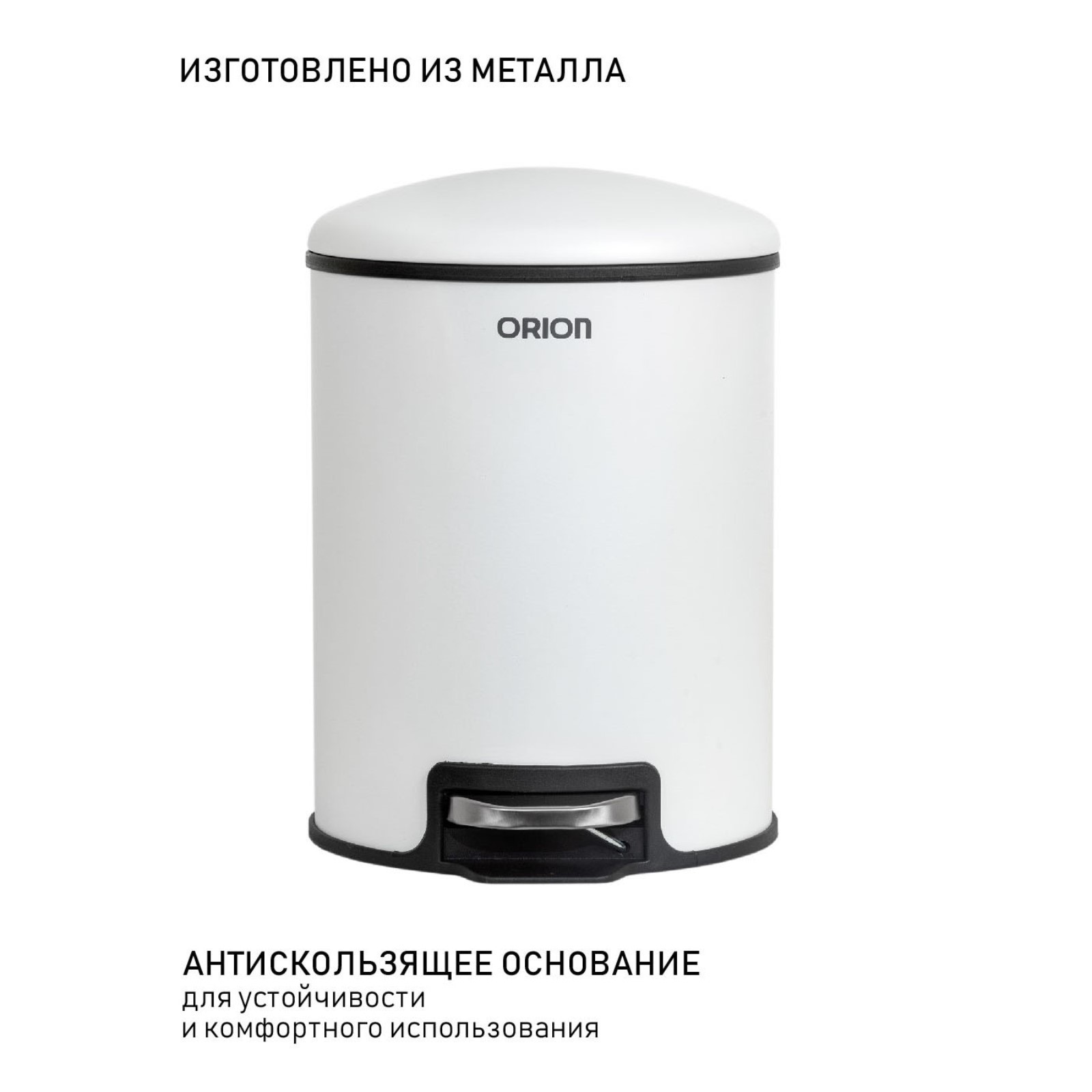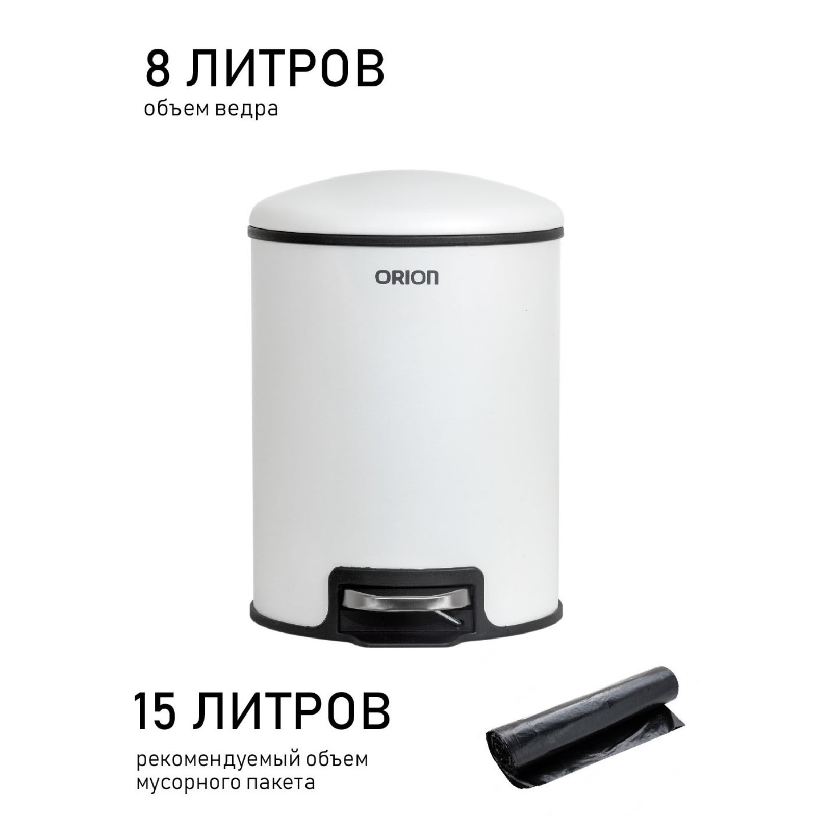 Мусорное ведро с педалью orion 420050, 8 л. Мусорное ведро ORION 450081 с педалью и внутренним пластиковым ведром - отличный вариант для поддержания чистоты и гигиены на кухне, в санузле, в офисах, заведениях общественного питания. Корпус мусорного ведра c крышкой изготовлен из металла. Эргономичное открывание крышки обеспечивается широкой педалью, вам не нужно наклоняться, чтобы выбросить мусор. Помимо этого, благодаря системе микролифта крышка плавно и бесшумно опускается, не нарушая тишины в помещении. Плотное прилегание крышки предотвращает распространение запахов. Цвет: Белый Форма: Цилиндрическая Объём, л: 8 Материал: Металл Особенность: С педалью Тип: Ведро Форма: Круг, шар, цилиндр  развернуть описание ▼