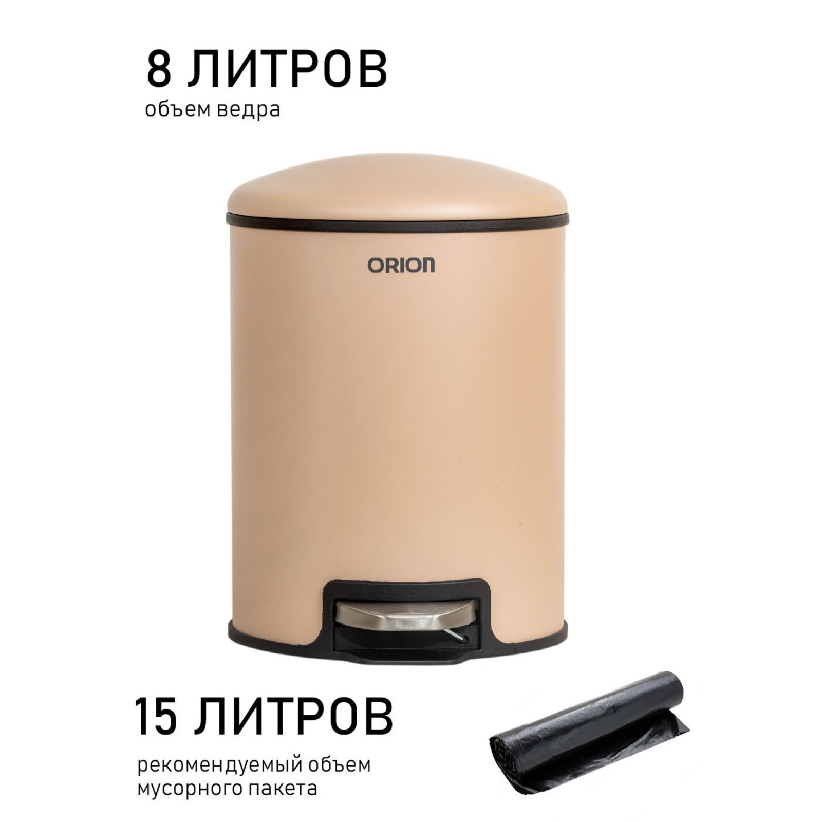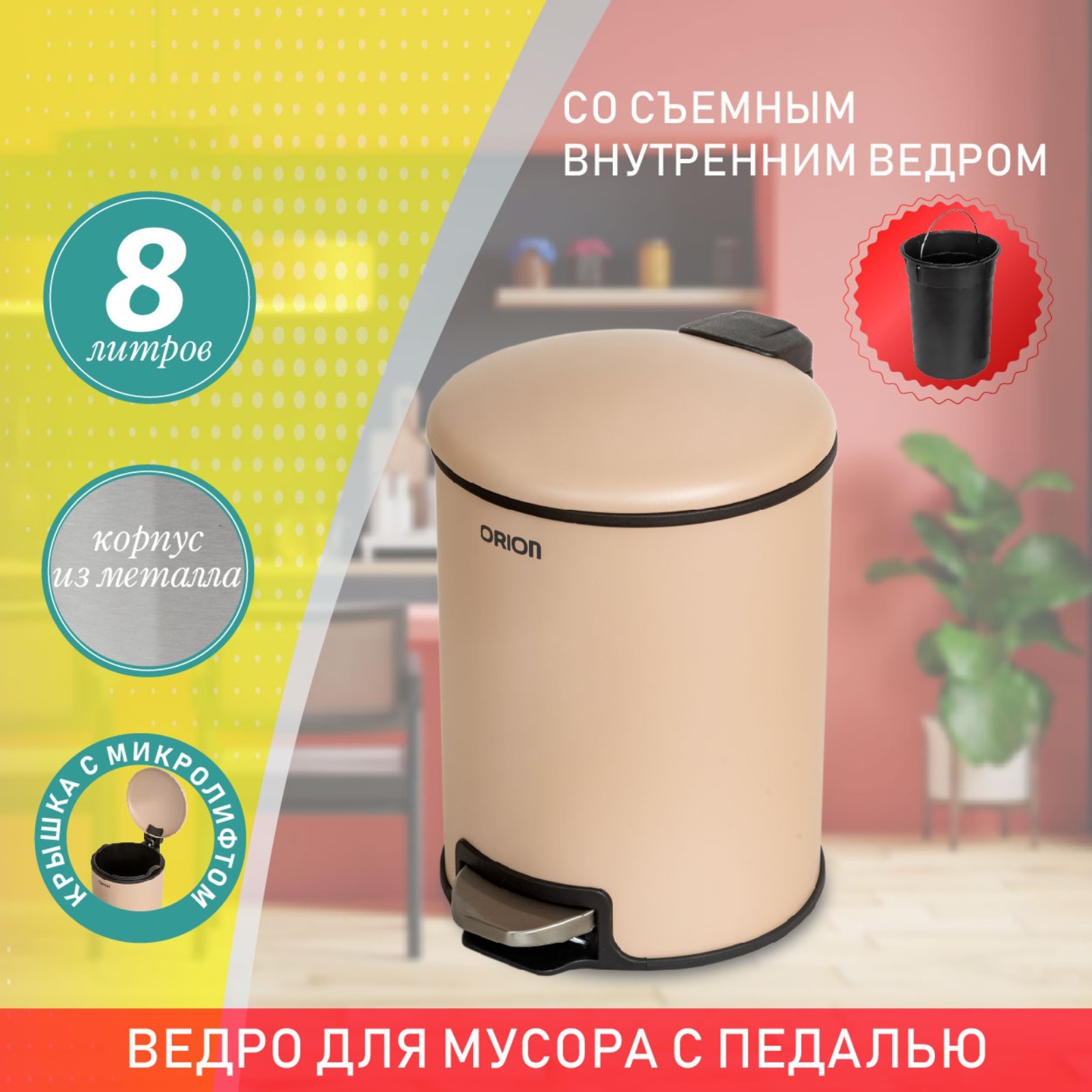 Мусорное ведро с педалью orion 420050, 8 л. Мусорное ведро ORION 450082 с педалью и внутренним пластиковым ведром - отличный вариант для поддержания чистоты и гигиены на кухне, в санузле, в офисах, заведениях общественного питания. Корпус мусорного ведра c крышкой изготовлен из металла. Эргономичное открывание крышки обеспечивается широкой педалью, вам не нужно наклоняться, чтобы выбросить мусор. Помимо этого, благодаря системе микролифта крышка плавно и бесшумно опускается, не нарушая тишины в помещении. Плотное прилегание крышки предотвращает распространение запахов. Цвет: Бежевый Форма: Цилиндрическая Объём, л: 8 Материал: Металл Особенность: С педалью Тип: Ведро Форма: Круг, шар, цилиндр  развернуть описание ▼
