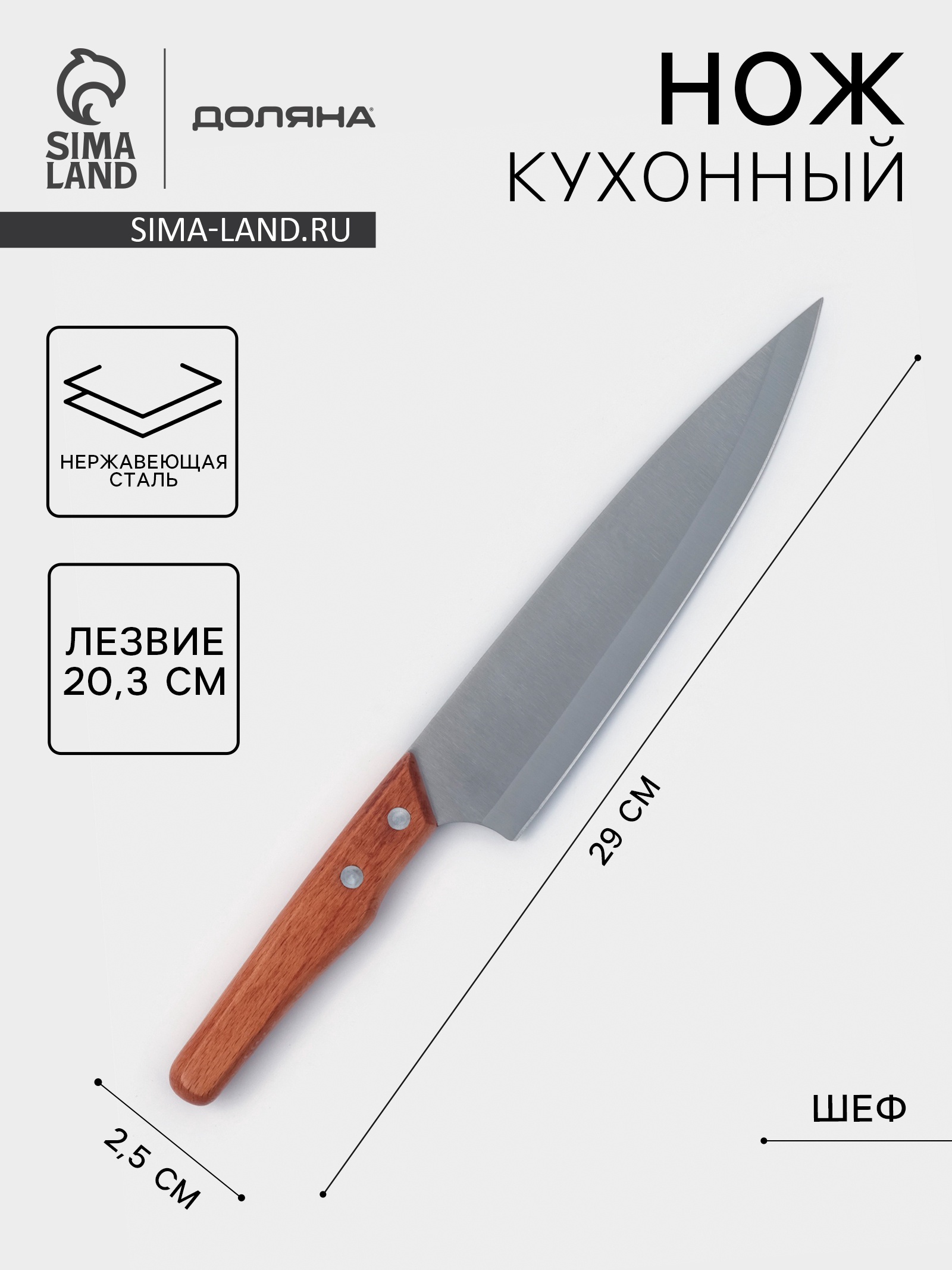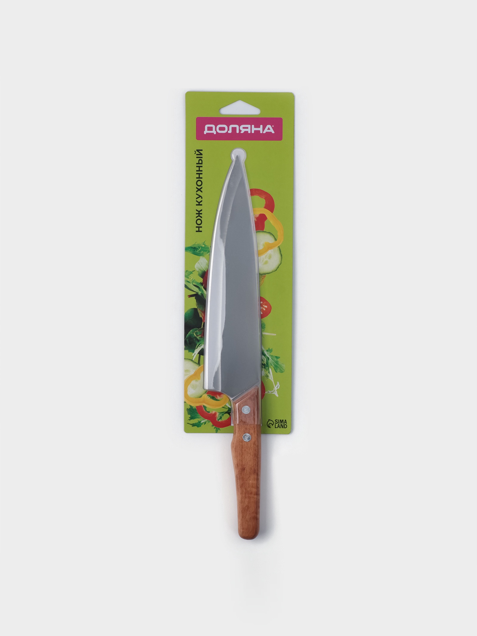 Нож кухонный доляна «усадьба», шеф, лезвие 20.3 см, нержавеющая сталь. Шеф-нож «Усадьба» - это незаменимый инструмент на любой кухне, предназначенный для выполнения разнообразных задач. Он обладает широким лезвием и эргономичной рукояткой, что позволяет с легкостью выполнять различные операции, такие как нарезка, шинкование и рубка. Преимущества: Лезвие ножа изготавливается из высококачественной стали, что обеспечивает его прочность и долговечность.Эргономичная ручка: ручка ножа изготовлена из нескользящего материала, который обеспечивает надежный захват и комфортное использование ножа даже при длительной работе.Универсальный размер: нож имеет оптимальный размер, что позволяет использовать его для выполнения различных задач на кухне, от нарезки небольших ингредиентов до разделки крупных кусков мяса.Острое лезвие: благодаря качественной заточке лезвия, нож легко справляется с нарезкой самых разных продуктов, сохраняя их текстуру и свежесть.Многофункциональность: нож универсальный может использоваться для нарезки, измельчения и разделки различных продуктов - от овощей и фруктов до мяса и рыбы.Легко ухаживать: нож легко моется и очищается от остатков продуктов, что позволяет поддерживать его в чистоте и порядке.Набор:Нет|Цвет:Коричневый|Длина лезвия, см:20.3|Материал ручки:Дерево|Рисунок:Нет|Тип покрытия:Без покрытия|Материал лезвия:Сталь|Тип ножа:Шеф|Страна:Китай  развернуть описание ▼