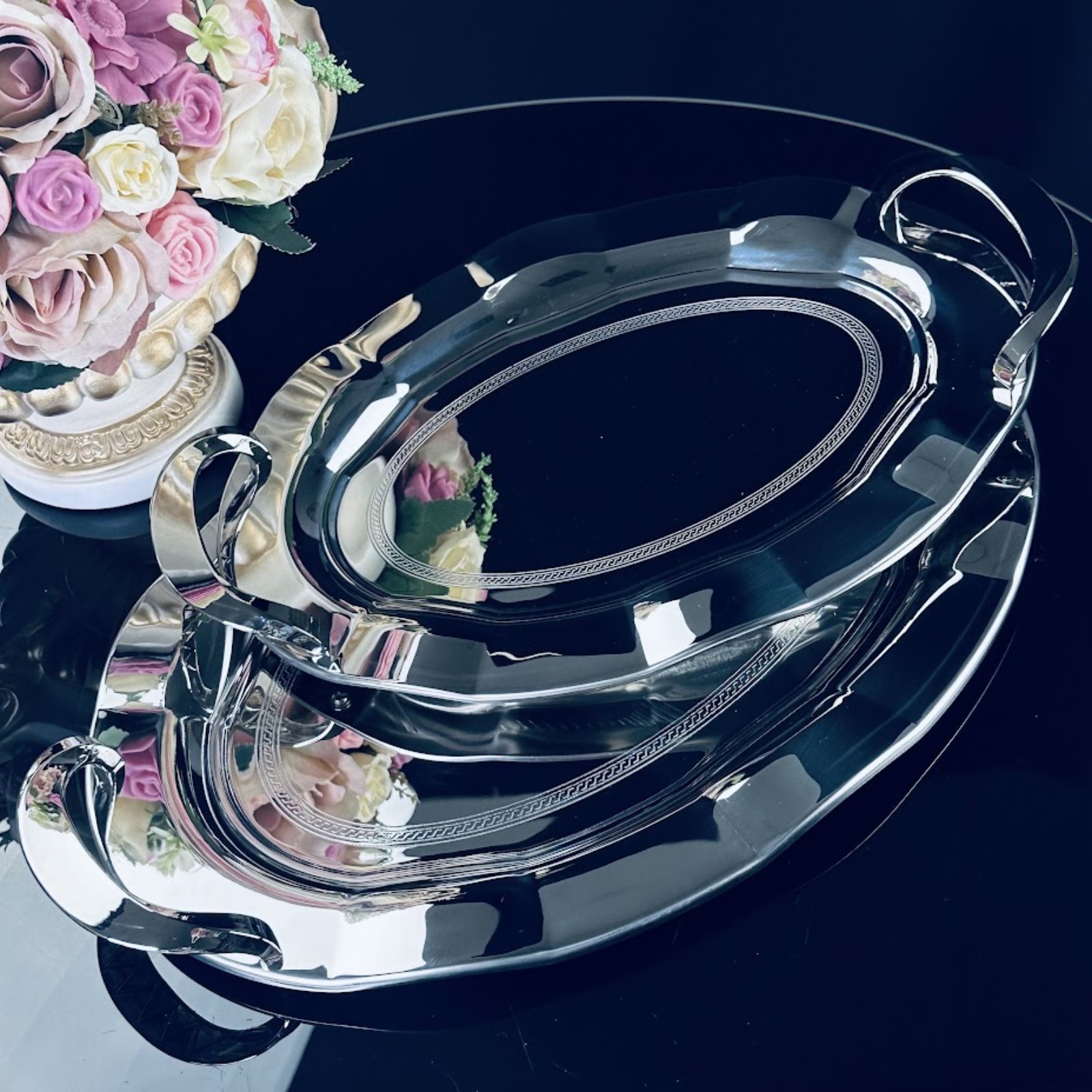 Набор подносов lenardi, овальные, 2 шт. Изделие может иметь следующие несущественные дефекты: незначительный скол краски;прерывание и наплыв рисунка;наличие полосы на рисунке;потёртости и наплыв золотой краски на внутренней стороне;небольшие потёртости и царапины на глазури;засорения под глазурью;плотные вздутия глазури на внутренней поверхности;натёк глазури;наличие мушек (чёрных точек);неровность внутреннего отверстия;отклеивание страз;потёртость упаковки в уголках. Данные недостатки не влияют на свойства изделия при использовании. Цвет: Серебристый Форма: Овальная Материал: Нержавеющая сталь Форма: Овал  развернуть описание ▼