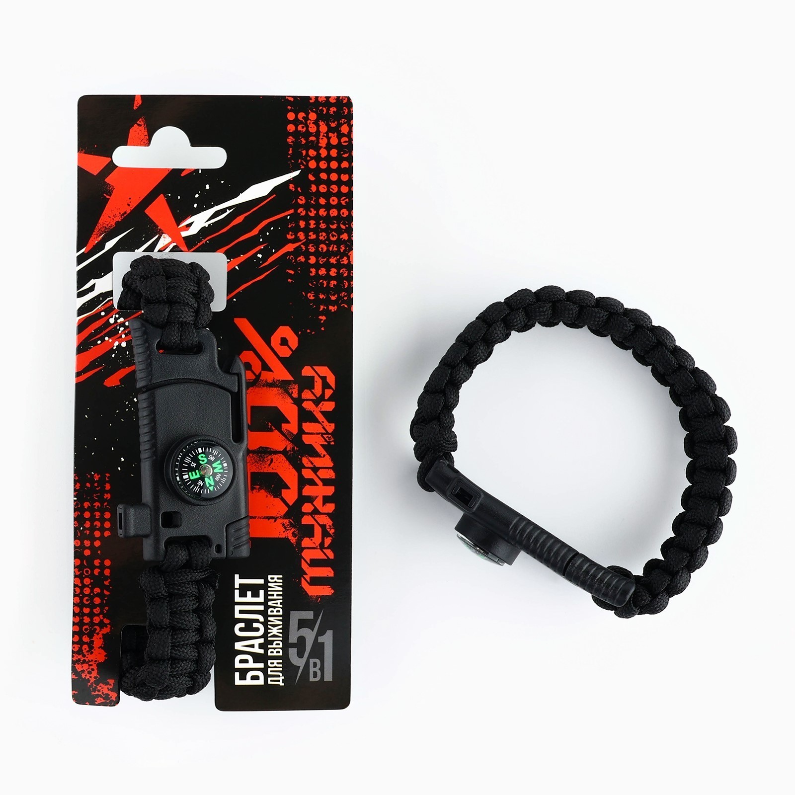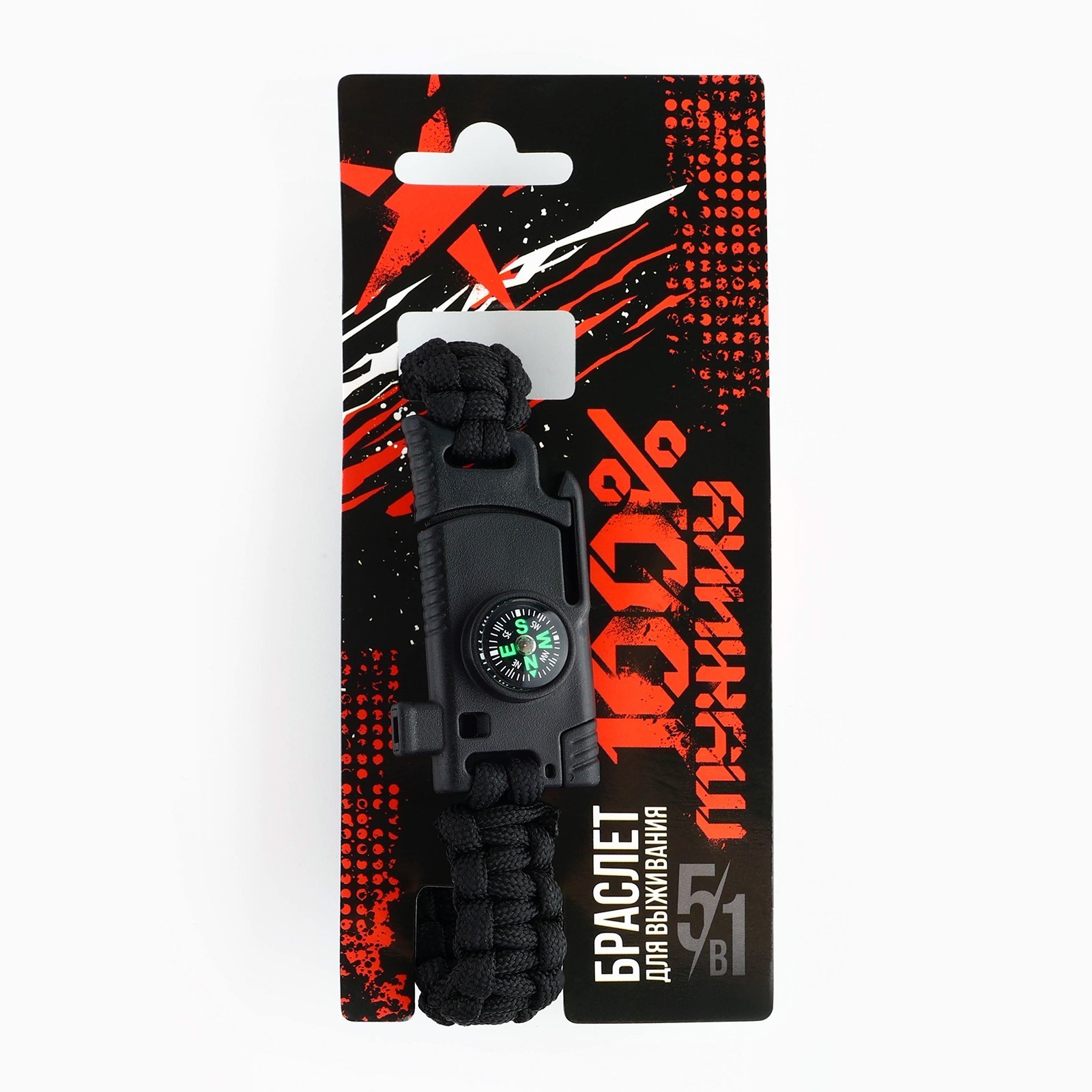 Браслет для выживания «100% мужику», 26 х 2,5 см.. Браслет для выживания много функциональный туристический Браслет 5 в 1 идеально подойдет как для экстримальных видов спорта, так и для одтыха на природе. Очень полезная, а иногда и незаменимая вещь в походе, туристических поездках, для выживания, и просто красивый и стильный аксессуар для повседневной жизни. Можно использовать в видах спорта: рыбная ловля, охота, рафтинг, байдарка, каяк, гидроцикл, вейкборд, лодка, лыжи, самокат, ролики, скейтборд, спортивный велосипед. Браслет состоит из: - Компаса (для точной навигации) - Огнива (Для разведения огня) - Свистка (Для подачи звукового сигнала) - Паракорда- 7 жильного шнура 370 см (Для перевязок, троса и тд) - лезвия ( Для резки и деления) Туристический браслет- отличный подарок папе, брату, мужу и любителью походов и туризма на День Рождения, Новый год, 23 февраля и другие праздники, а так же будет хорошим дополнением к основному подарку. Цвет: Чёрный В наборе, шт.: 1 Количество функций: 5 Материал: Текстиль Материал: Пластик Материал: Металл Размер: Универсальный Вид: Многофункциональный браслет Вид: Браслеты  развернуть описание ▼