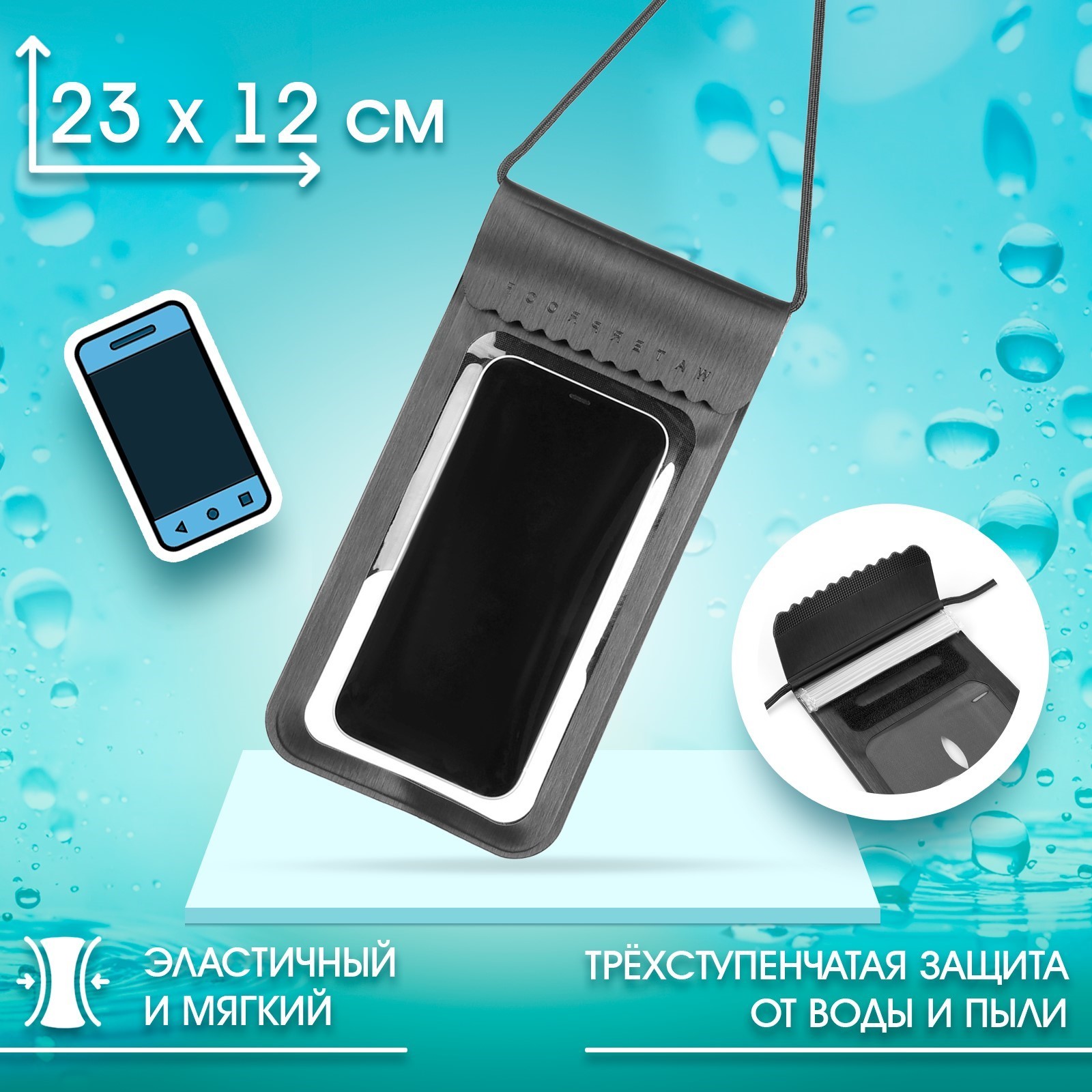Чехол туристический, водонепроницаемый, черный. Непромокаемый герметичный чехол-сумка пригодится для хранения и переноски небольших вещей или телефона во время путешествий, активного отдыха, на пляже или сплаве. Подойдет для sup доски, вейкбординга, дайвинга, серфинга, купания и любых водных видов спорта. Можно использовать во время дождя для бега, в бассейне, аквапарке, на пикнике, на рыбалке или охоте. Чехол изготовлен из мягкого ПВХ и оснащена четырмя этапами защиты: три застежки типа zip lock и фиксация застежек в скрученном состоянии с помощью липучки - за счет этого обеспечивается защита содержимого от воды. Особенности: Водонепроницаемость и герметичность: благодаря материалу и конструкции, сумка-чехол надёжно защищает содержимое от влаги и воды, сохраняя его сухим даже в самых экстремальных условиях; Комфорт в использовании: регулируемый ремень позволяет закрепить чехол на комфортной высоте, обеспечивая свободу движений; Использование, не снимая чехол: прозрачные вставки позволяют использовать камеру и сенсорный экран смартфона , не вынимая его из чехла; Многофункциональность: поясная сумка может быть использована как для повседневного использования, так и для активного отдыха или спорта.