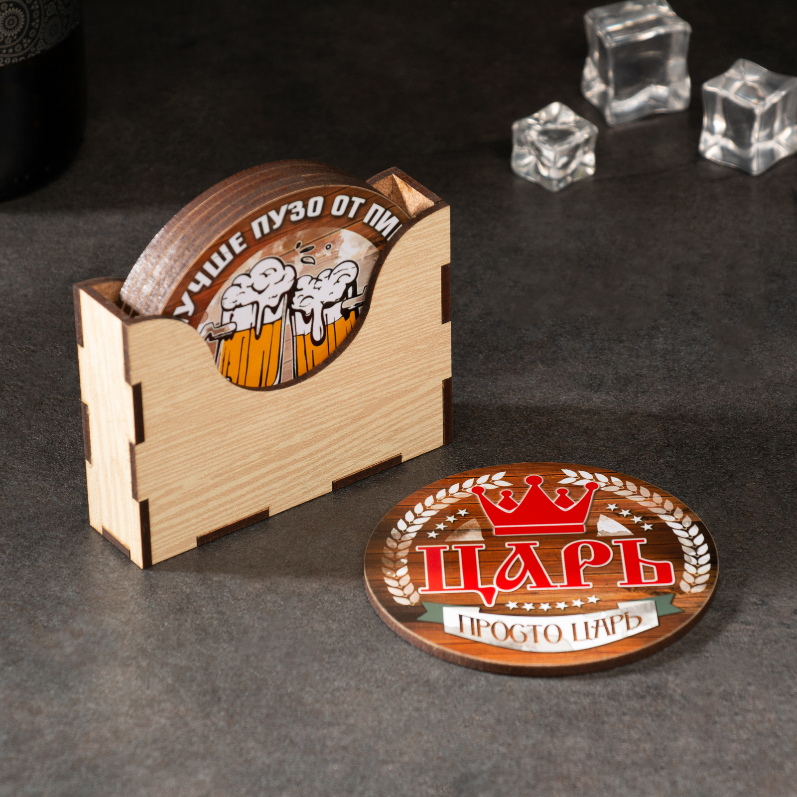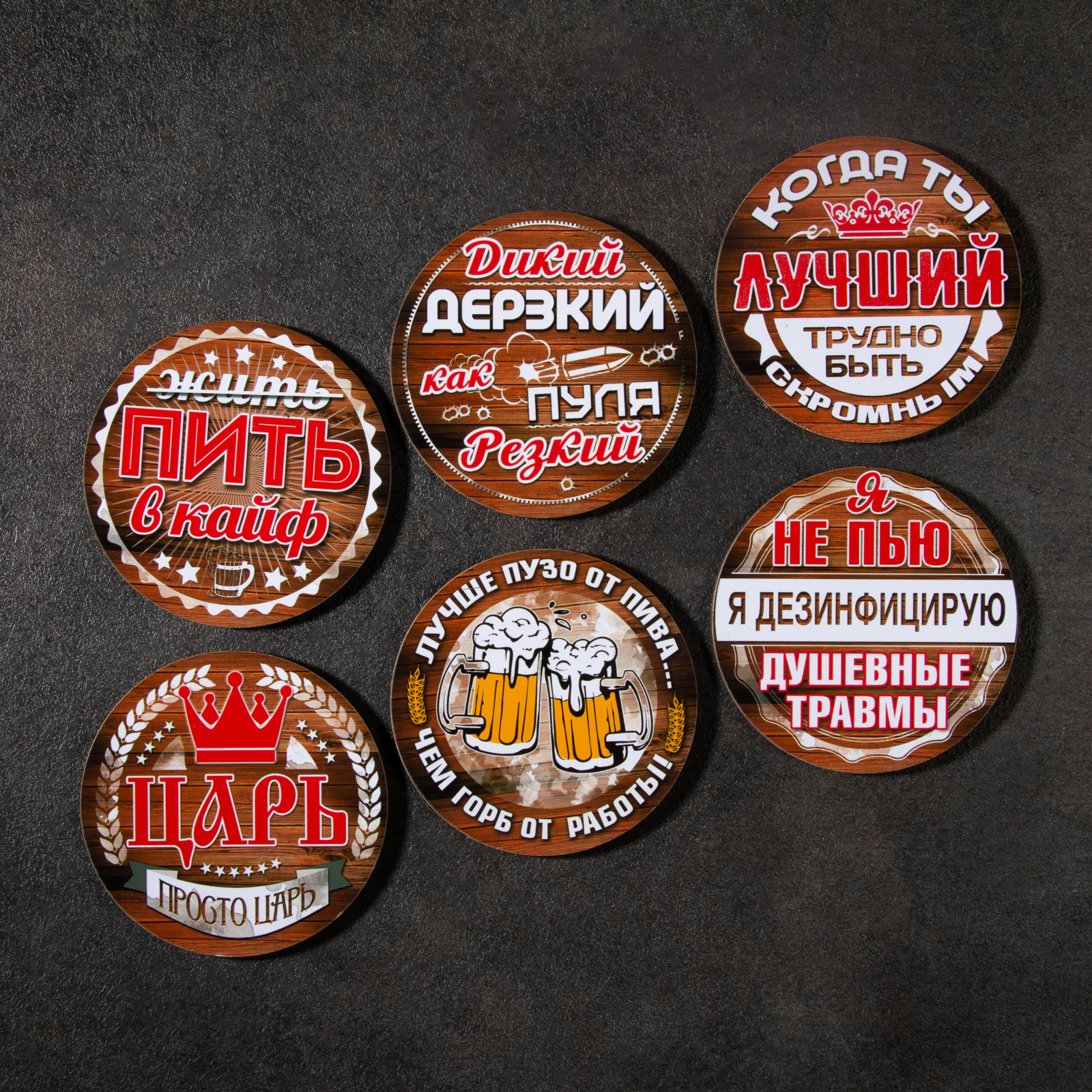 Набор подставок под бокалы в держателе , 6 штук, "фразы", D = 9 см, 9,5 х 9 х 2,5 см